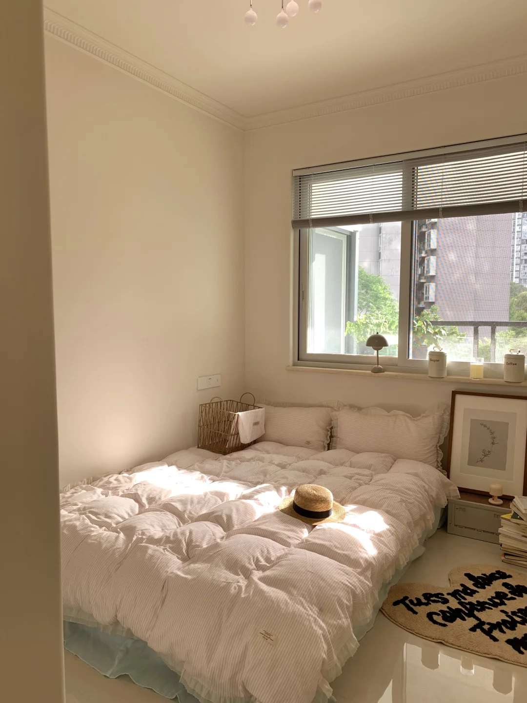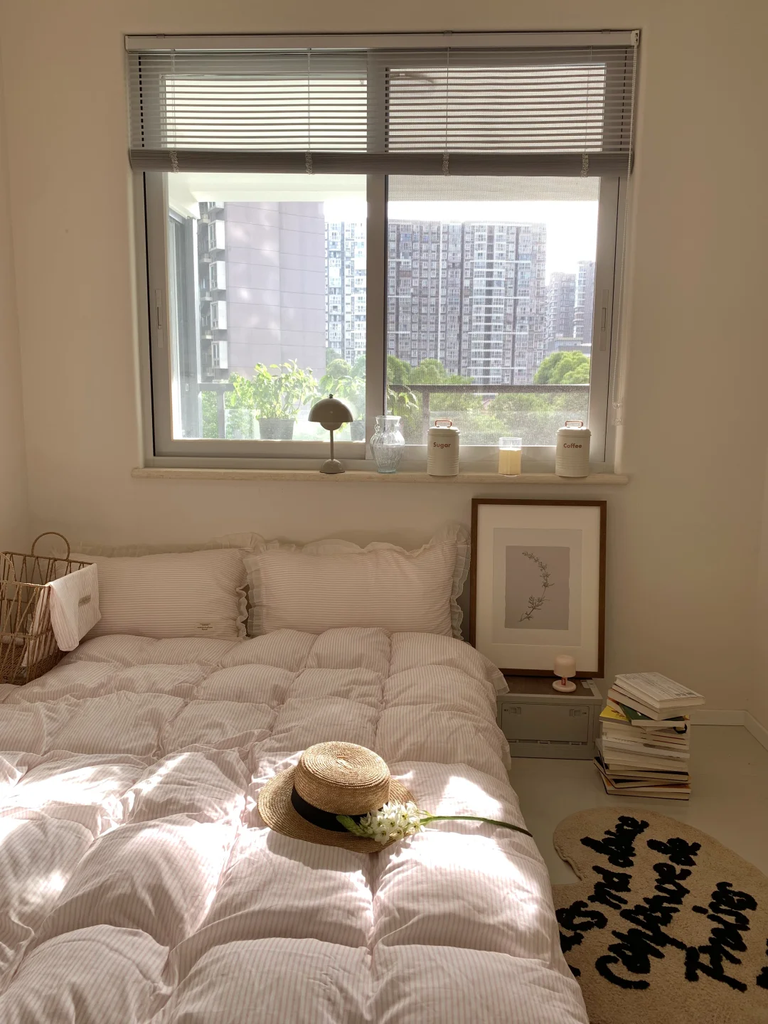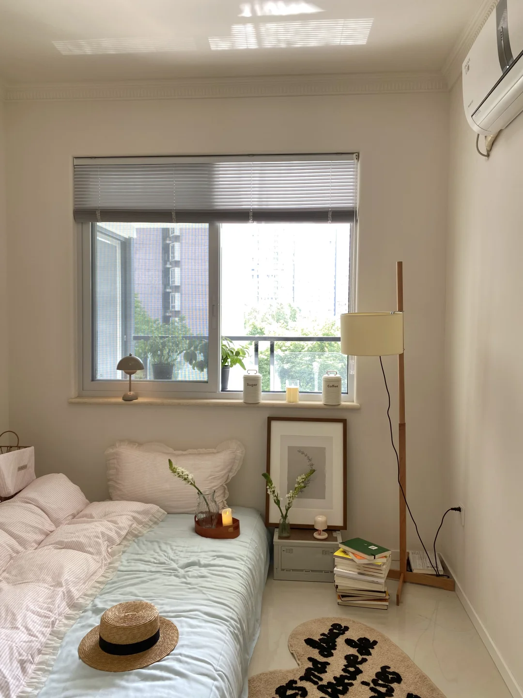 嗨喽啊~这里是铃子的家🏠 我无滤镜7平米韩系卧室太好睡啦~ 还有点夏日冰淇淋的味道🍧 分享一下我滴布置思路~ ▪️换个韩系滴四件套🛏️ ▪️摆一点美丽的花花🌸 ▪️加一点原木色点缀🪵