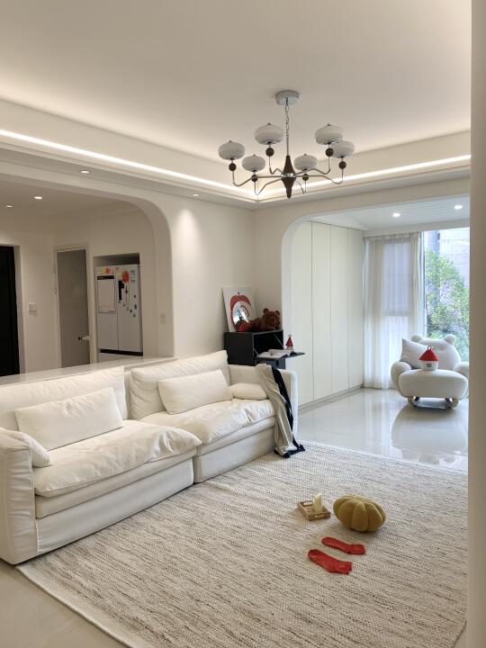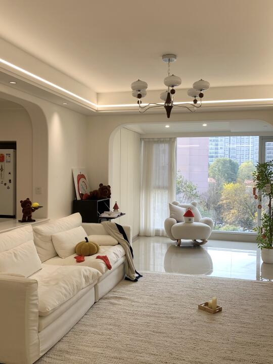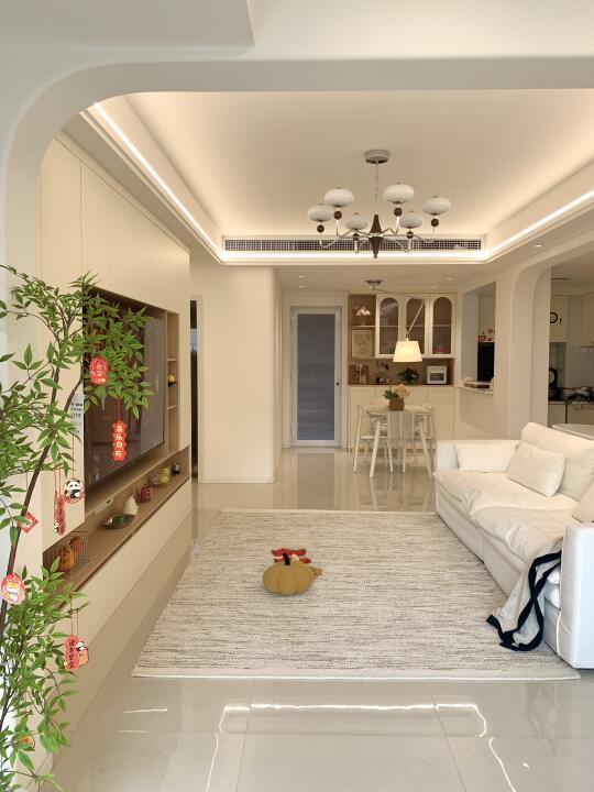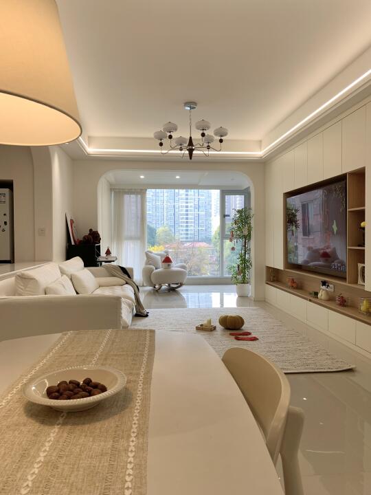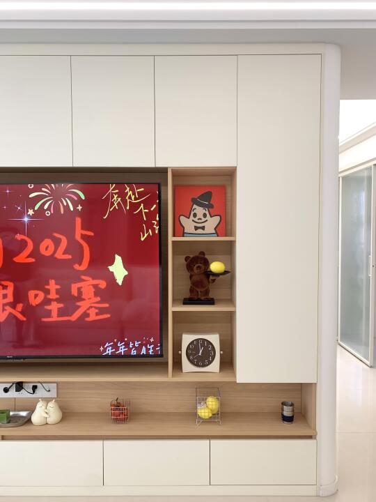 嗨喽啊,这里是铃子的家🏠 85㎡南方的小家迎来了冬天,窗外的树都掉叶子啦~ 即将过年啦,没有像其他人一样复杂的过年,简单的布置了一点红色元素🫧 然后入住几个月,被问的蕞多的就是客厅的柜子 今天给大家分享一下尺寸吧📏 开间3.2米(是做了电视柜后滴) 电视柜长3.42米 高2.3米 深30厘米 中间留了75寸的电视位置📺 没有做一门到底,留了镂空用作装饰嘻嘻 小户型的家🏠都可以直接来抄作业🥰
