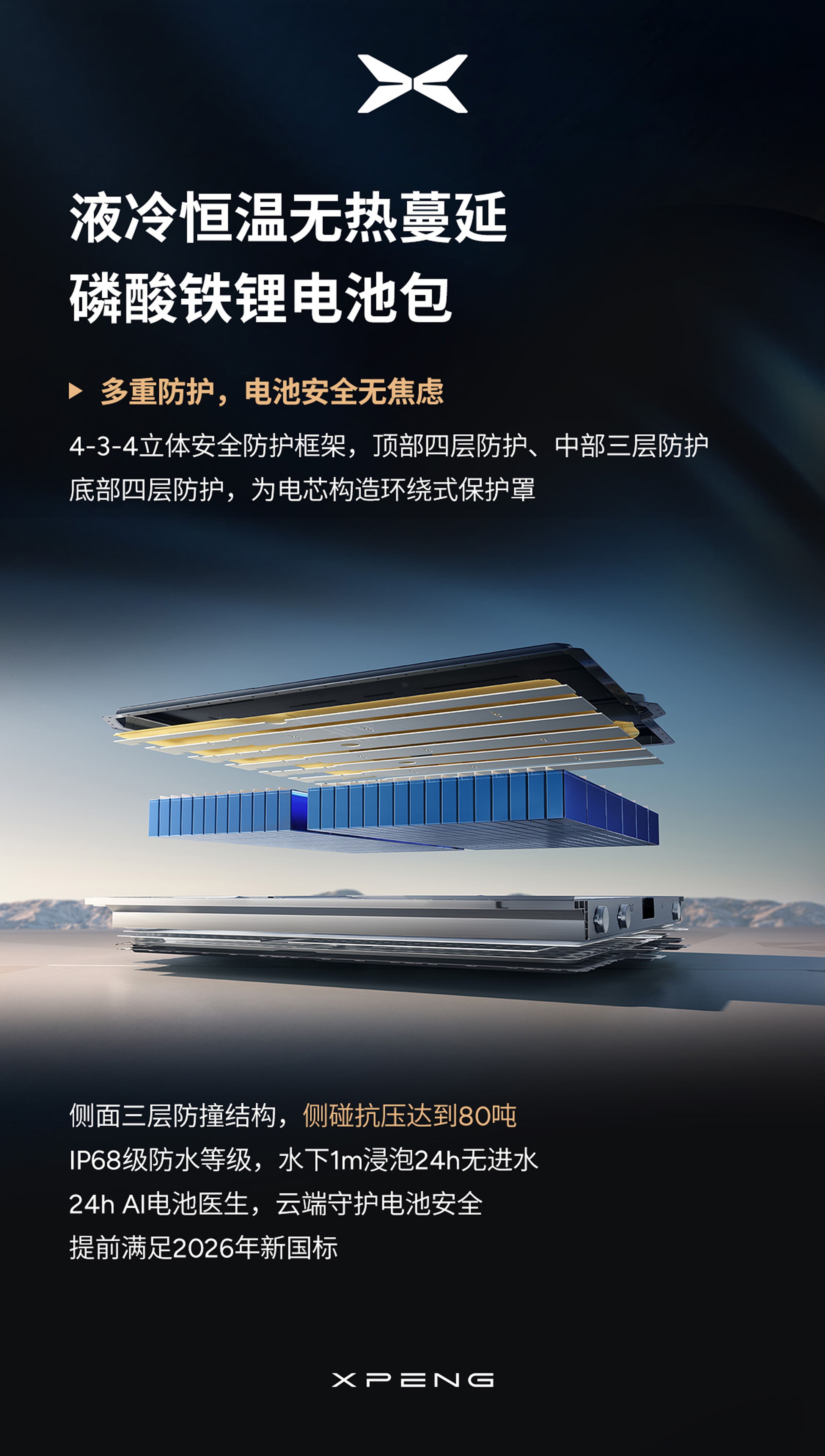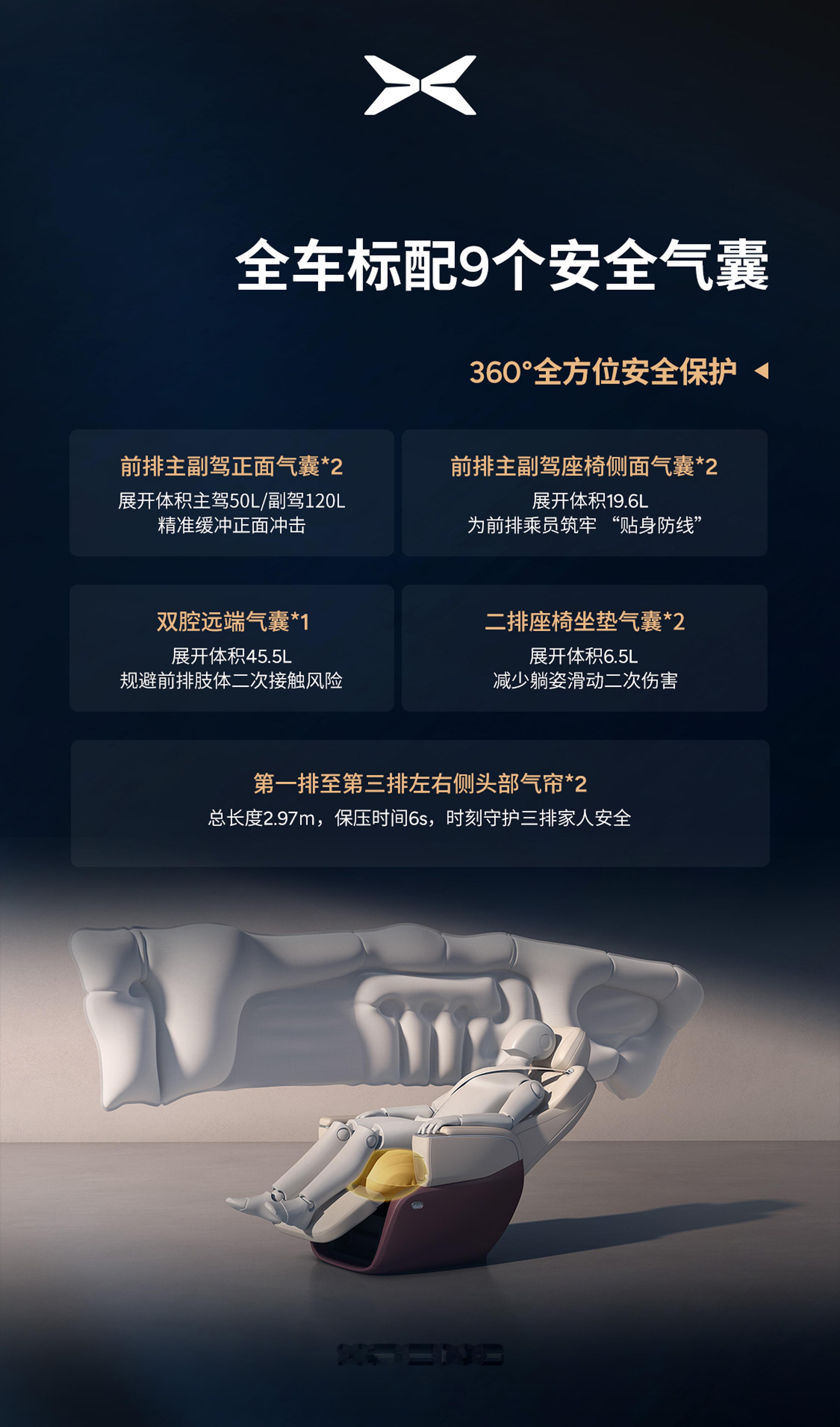 搭配液冷恒温无热蔓延磷酸铁锂电池包 + 4-3-4 立体防护 + IP68级防水 + AI 24h 电池医生+提前满足 2026 新国标,这不就是全方位守护车主的安全吗?为我们的国产车点赞!新款小鹏X9安全设计满足26版欧洲五星1602公里续航的小鹏X9超级增程来了