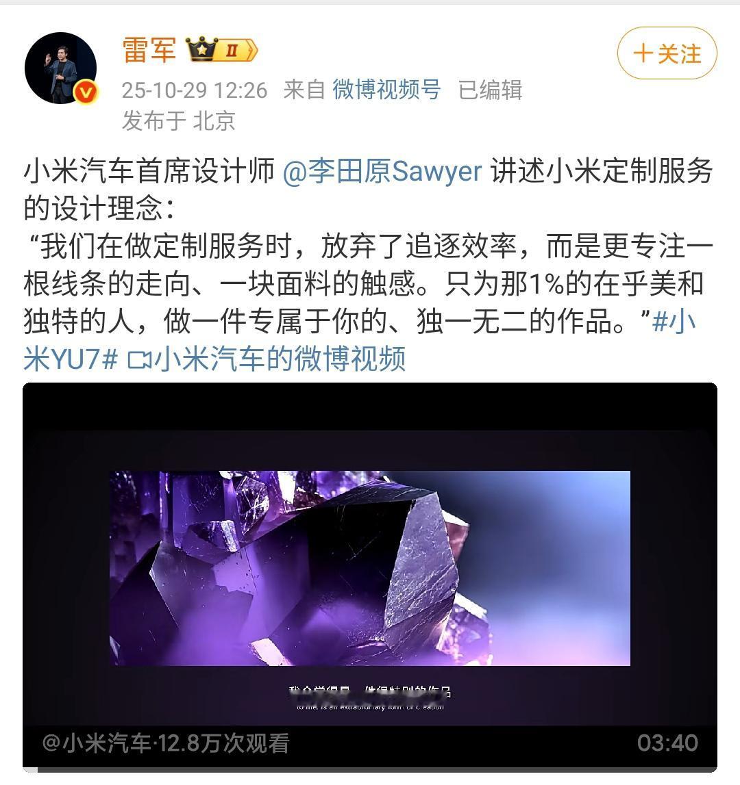 雷军:“我们在做定制服务时,放弃了追逐效率,而是更专注一根线条的走向、一块面料的触感。只为那1%的在乎美和独特的人,做一件专属于你的、独一无二的作品” 这是小米汽车的高端定制化业务,就是为给消费者与众不同的体验定制属于自己独一无二的产品。 这个有点像保时捷的选装模式,就是每个人都可以根据自己的需求灵活的改变,各种各样的配置定制化来的车显得独一无二。 小米汽车开发出来了越来越多的玩法,这一切都在向世界先进的企业学习,小米汽车终究有一天也会成为世界上非常领先的汽车企业。