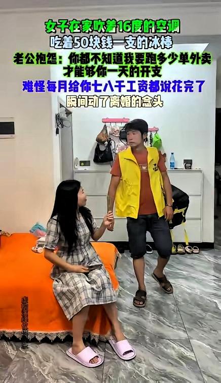 吹16度空调吃50元冰棒!这婚姻里的“自私”才真伤感情 真看懵了!女子在家吹16度空调、吃50块一支的冰棒,老公吐槽“跑多少单外卖才够你一天开支”,每月七八千都花光,甚至动了离婚的念头,这哪是过日子,分明是一方在“透支”另一方的付出! 婚姻从来不是一个人享受、一个人硬扛,光靠一方咬牙撑着早晚会崩。别说“他赚钱就是给我花”,要知道老公跑外卖风吹日晒的每一分钱,都藏着没说出口的辛苦,连这都看不到,再深的感情也会被消耗。 互相体谅才是婚姻的底气,你心疼他的累,他舍得给你花心思,这样日子才能过下去。要是只想着自己舒服,不顾对方的难处,再暖的家也会变凉。 你觉得婚姻里,“互相体谅”和“满足自己”哪个更重要?要是你遇到这种情况,会怎么跟另一半沟通?来评论区聊聊!