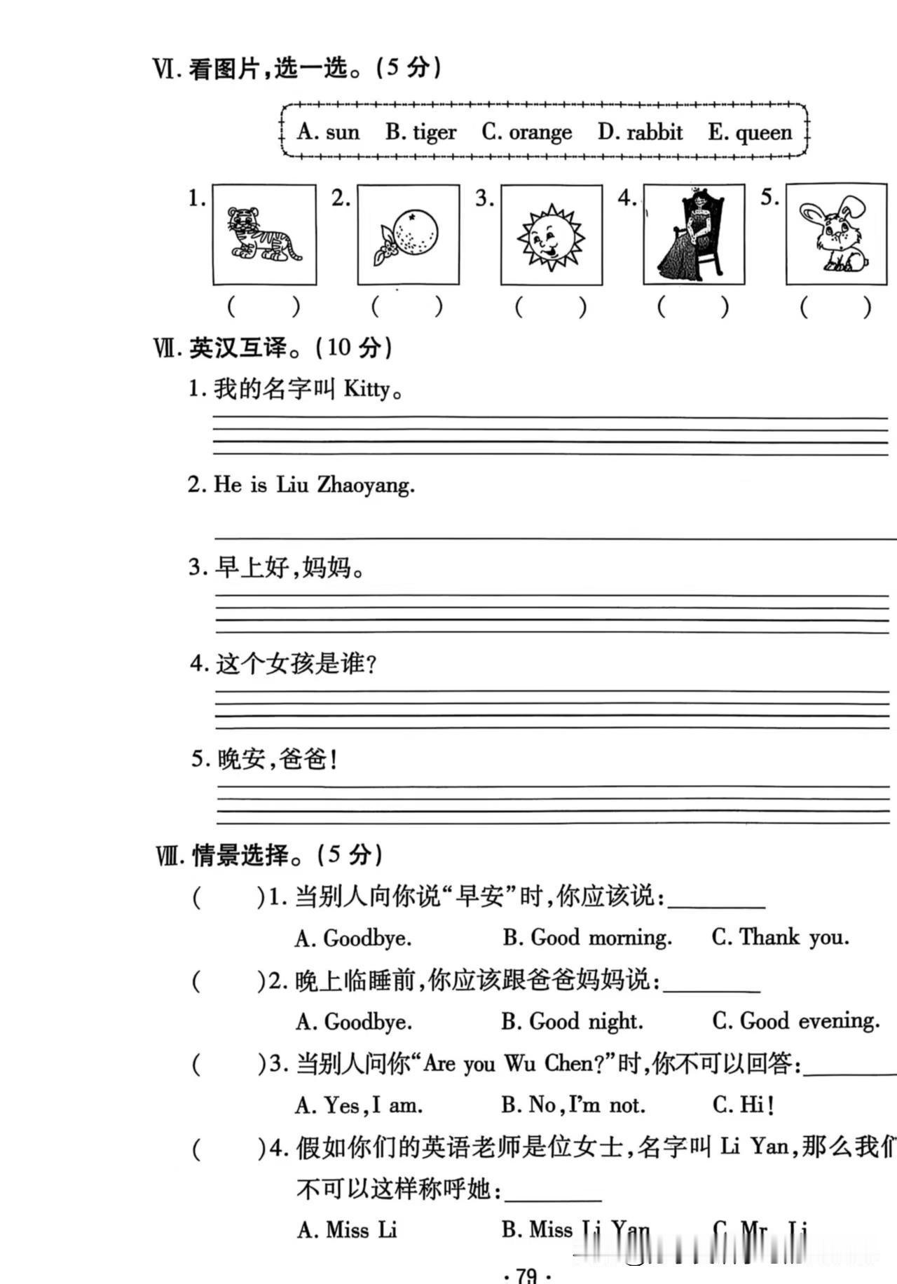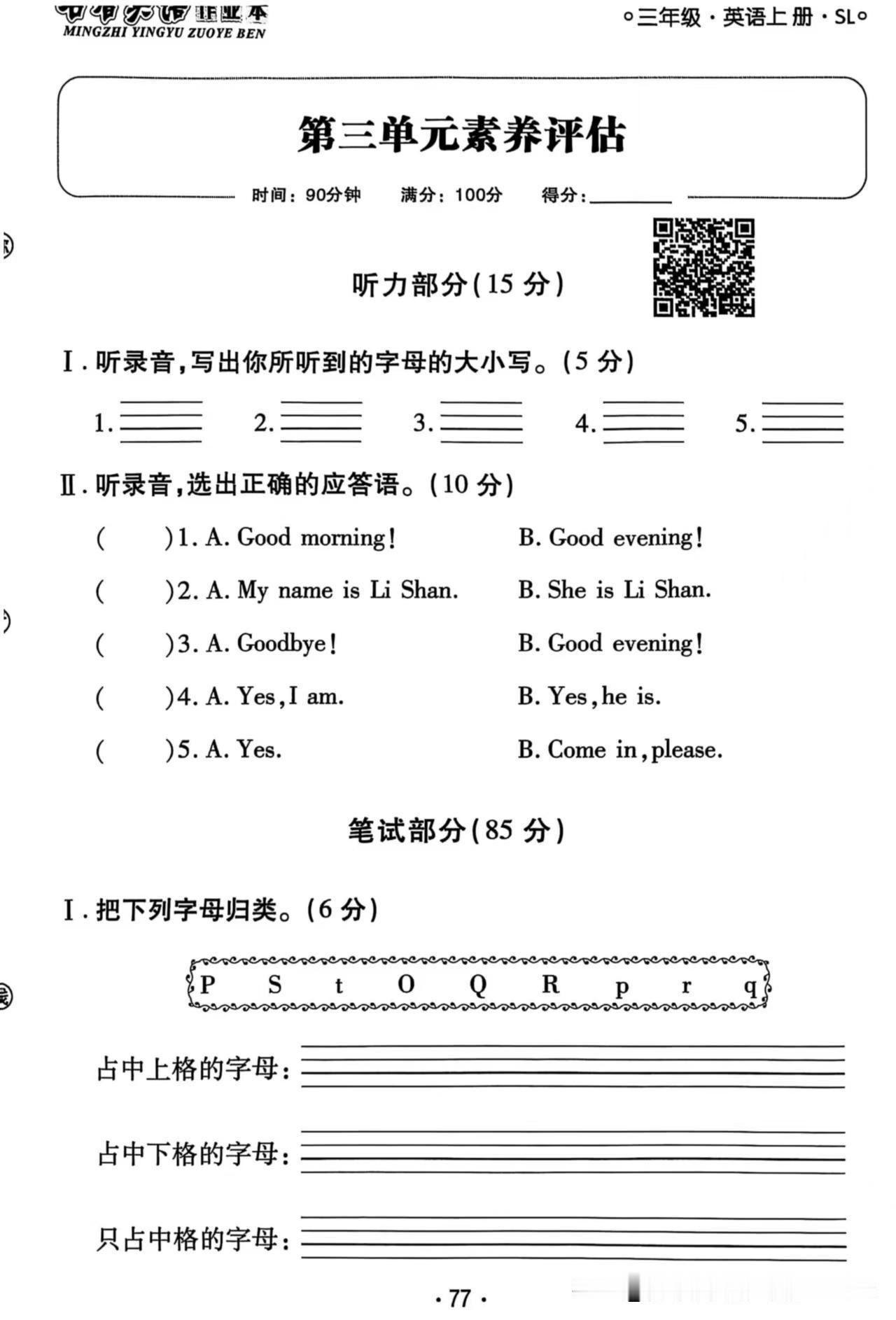 家有三年级学生的家长注意啦!陕旅版小学三年级英语上册第3单元检测很重要。像陕旅版2024年三年级英语上册第三单元测试题,满分100分,考试时间60分钟。题型有听录音写字母大小写、选听到的单词、选听到的句子等。比如听力里可能会有Miss、Mr.、mom、dad这些单词。检测能帮孩子巩固知识,了解自己的学习情况。家长可以在熊猫办公、金锄头文库找相关试题及答案,让孩子多练练。