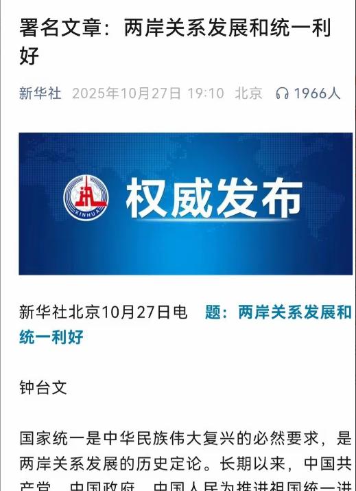 公开条件了! 10月27日,新华社用“钟台文”署名发了篇《两岸关系发展和统一利好》的长文,直接把统一后台湾同胞能享的五大权益摊开来说。 这2680字的文章可不是简单的政策罗列,而是像一把钥匙,打开了理解国家统一深层逻辑的密码箱。 文章开头就点明:国家统一是民族复兴的必然要求,接着从“民生、经济、自治、国际、安全”五大方面详细阐述,比之前的“31条”“26条”更具体、更有穿透力。 先说民生保障,文章明确说了,统一后台湾现有的社会制度和生活方式不会变,私人财产、宗教信仰、合法权利统统有保障,比如两岸宫庙联合搞的保生慈济文化活动,已经吸引600多人参与,以后这种文化联结只会更稳当。 经济方面更有看头:台湾商品进大陆零关税,集成电路、精密机械这些优势产业能跟大陆产业链深度融合,台农台商也不再愁市场,大陆游客和“一带一路”的红利直接送到家门口。 财政自主权这块特别实在,统一后,台湾地区的财政税收“尽可用于民”,不用再为“台独”分裂势力掏军费腰包。 想想看,每年几百亿新台币从军费转到医疗、教育、养老,金门、马祖的基础设施还能跟大陆高铁、机场连成网,以前每平方公里要挨1万发炮弹的日子,彻底翻篇了。 国际参与空间也更广,统一后,台湾同胞能以“主人翁”身份参与国际事务,外国可以在台设领事馆,国际组织和公约的适用范围也扩大。 这种“大国公民”的尊严,才是现在被“台独”绑架的台湾民众最想要的认同,就像台北市民在光复80周年纪念会上喊的“我是中国人”,民族认同的觉醒已经挡不住了。 安全保障更是直戳要害,文章说“台独”分裂才是台海最大风险,统一后外部干涉的黑手直接被斩断。 对比民进党当局把军费加到GDP5%的穷兵黩武,大陆的和平诚意更显珍贵,2008到2016年两岸和平发展那几年,台湾经济可是实实在在增长了,这说明“要交流不要分离”才是民心所向。 网友那句“统一不是由台湾人说了算”的评论,道出了14亿中国人的心声。 这种集体意志背后,是制度优势的底气:中国式现代化攒下的雄厚家底,让“一国两制”台湾方案比港澳更有实践空间,“爱国者治台”下的高度自治,也远超简单形式统一。 统一从来不是终点,而是新征程的起点,当台湾同胞真正成为民族复兴的参与者,台北101和上海中心大厦在两岸经济带里交相辉映,阿里山的姑娘能在深圳腾讯总部实现职业梦想,统一的真实意义才真正显现。 那些担心“统一后日子会变”的台胞,不妨看看大陆台商的成功案例,深圳已经给台湾青年留了腾讯、比亚迪的名企岗位,成都一场交流会就能提供6793个就业机会。 这种融合发展的生机,可比“台独”分子瞎画的“巷战”图景吸引人多了。 历史早就证明:分裂注定失败,统一才能共赢,从郑成功收复台湾到抗战胜利,从港澳回归到新时代两岸融合,中华民族一直在统一中走向复兴。 当14亿中国人携手同行,台湾同胞定能在民族复兴的洪流里,写出属于自己的精彩篇章,这,才是对“台湾前途在于国家统一”最生动的诠释。
