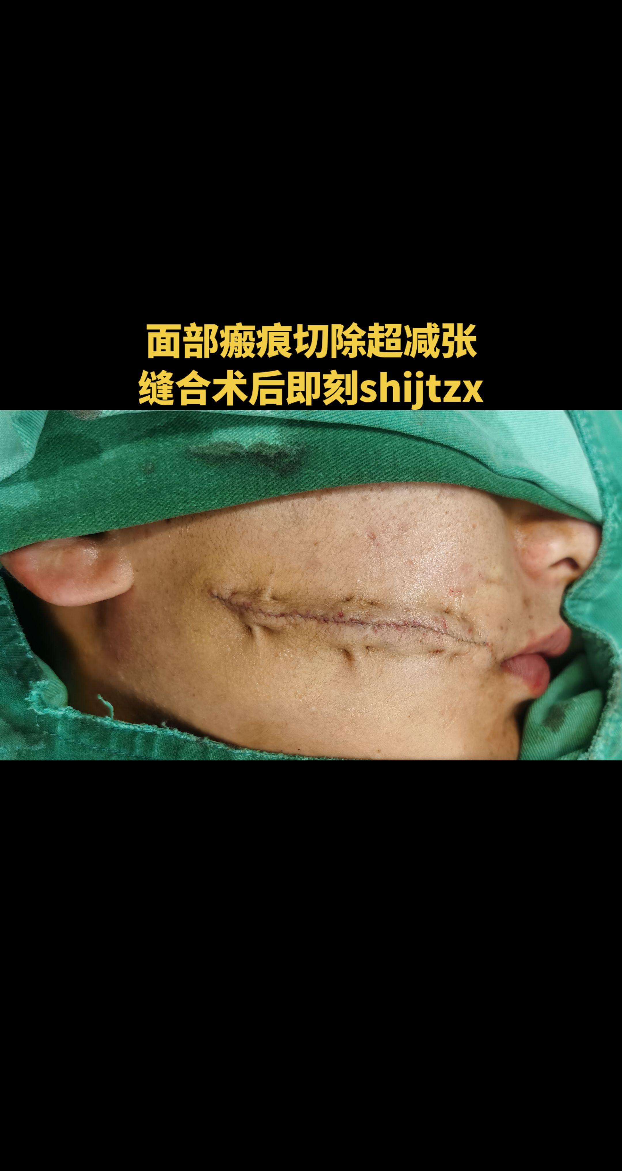 面部瘢痕。面部瘢痕切除整形术,超减张缝合术后,抹抗疤药,贴减张贴,穿戴...