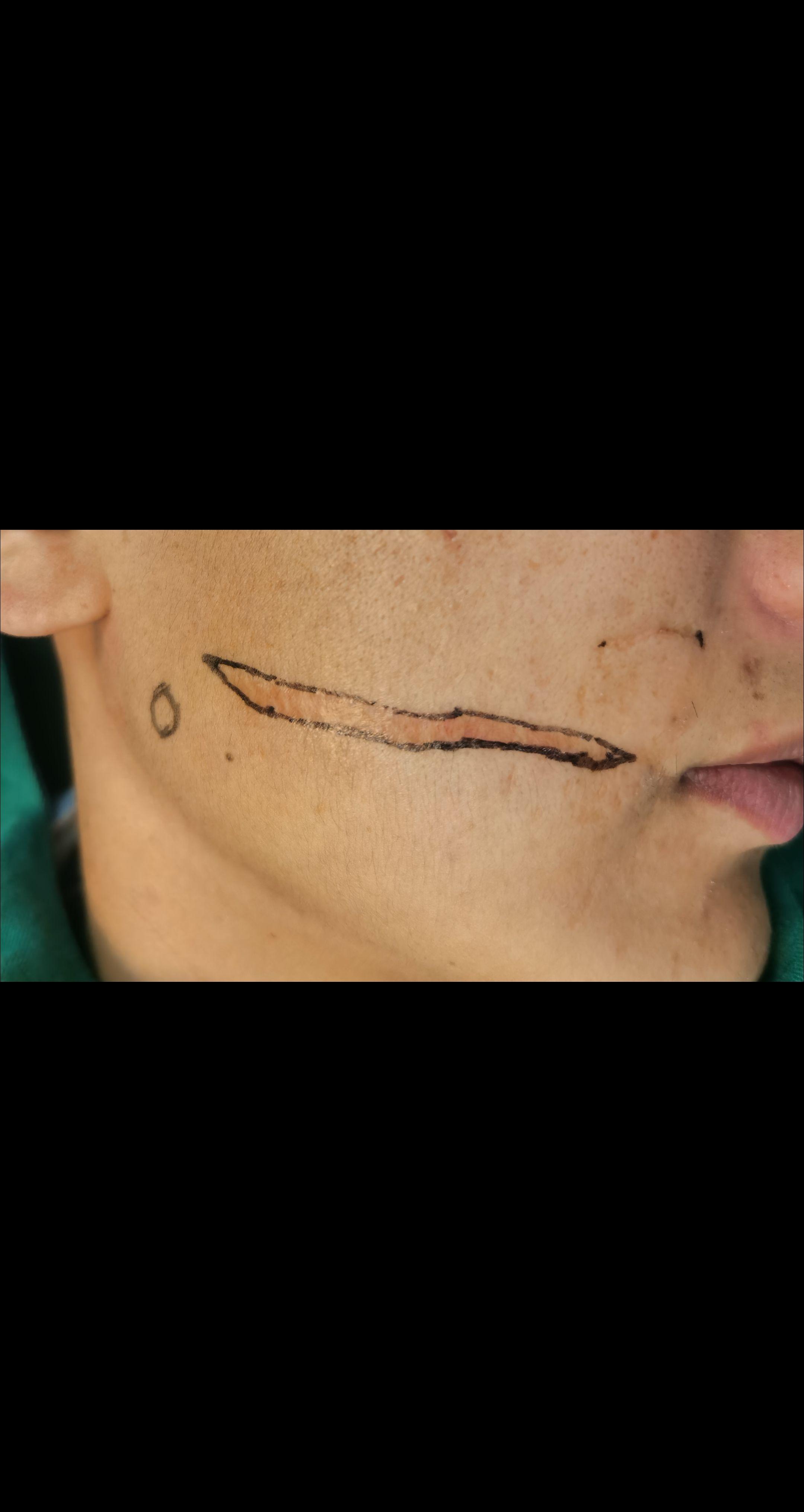面部瘢痕。面部瘢痕切除整形术,超减张缝合术后,抹抗疤药,贴减张贴,穿戴弹力套,术后1月复诊。