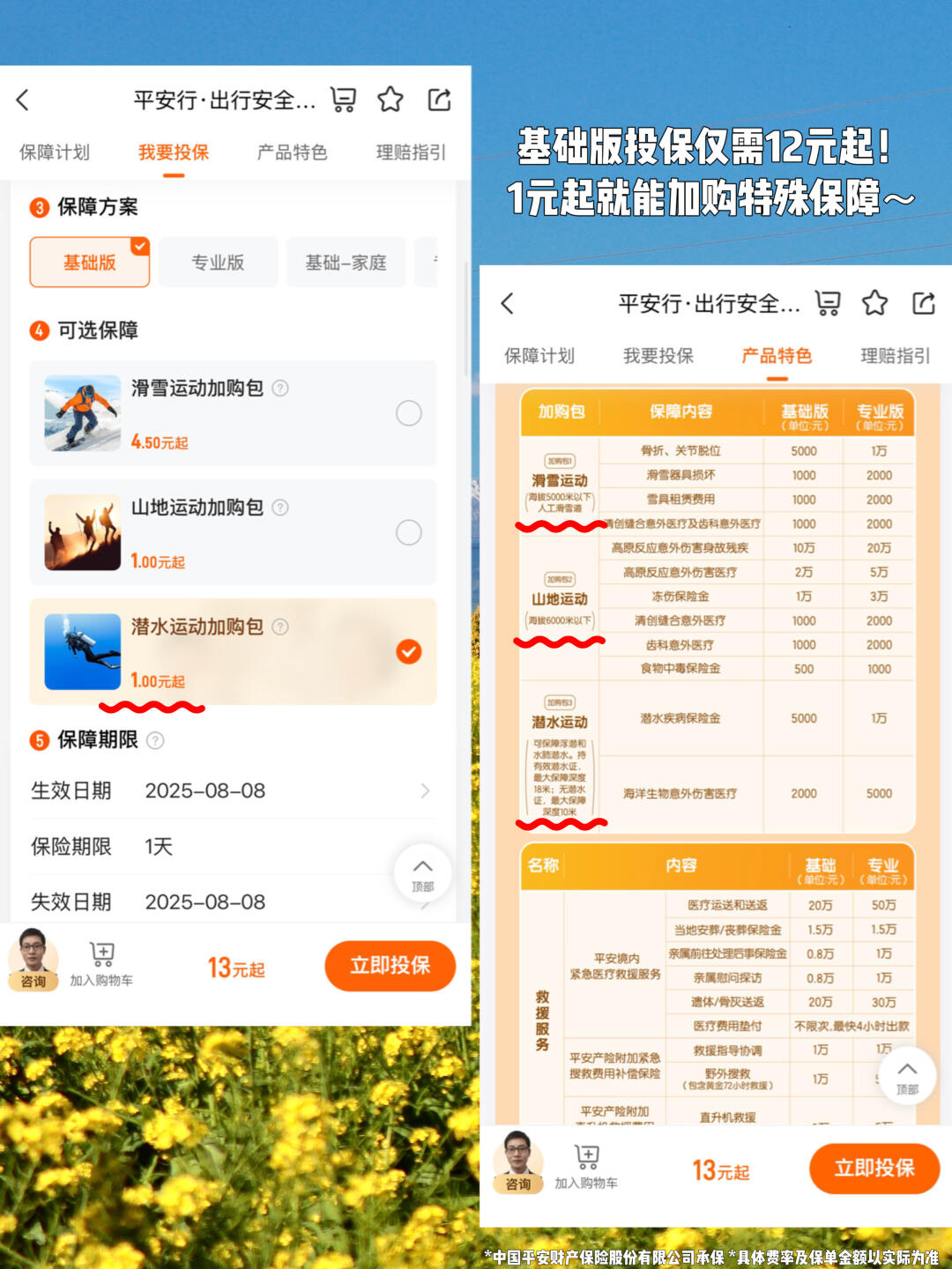 而且,这个保险还支持滑雪、潜水、徒步等高风险活动的加保,玩得放心不担心。