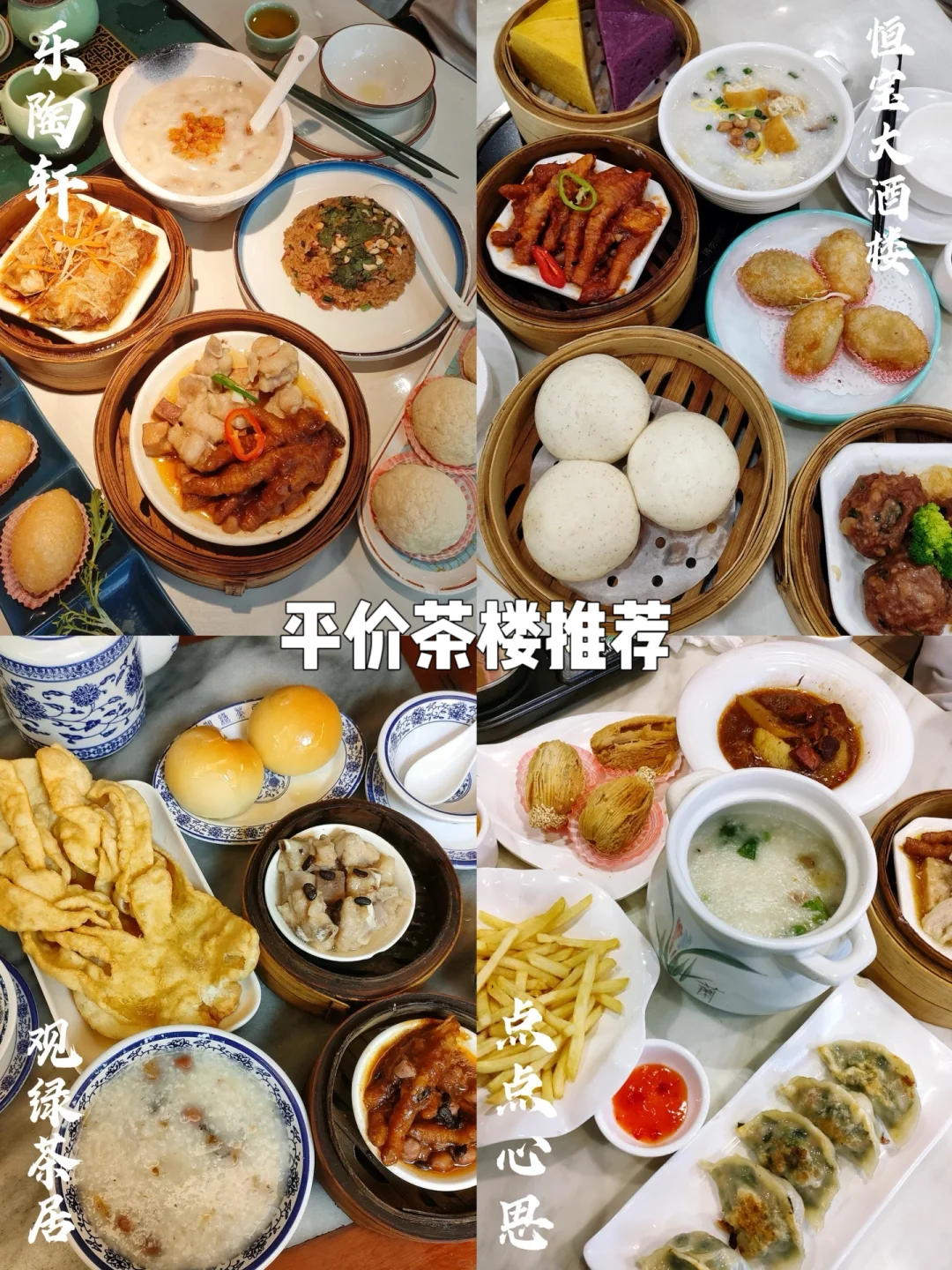 ✅预算有限(人均40):乐陶轩、点点心思、彩点、观绿茶居、恒宝大酒楼、友成鼎点。这些都是平价茶楼,每天都会打折,算下来每样平均10r,特别划算