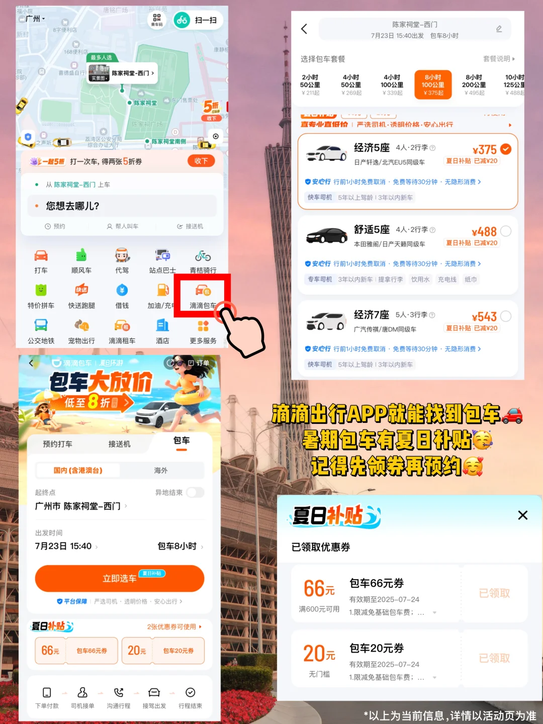 🚗夏天实在是太热太晒了,虽然广州有地铁,交通很便利,但从每次从景点走到地铁站真的巨热巨晒,如果是跟朋友/家人一起的建议在滴滴上包车出行,人多A下来跟打车差不多,而且不用在烈日下暴走、不用等车!一天选8h/100km完全够用了,全程司机师傅跟着走,想去哪就去哪,不用考虑停车问题
