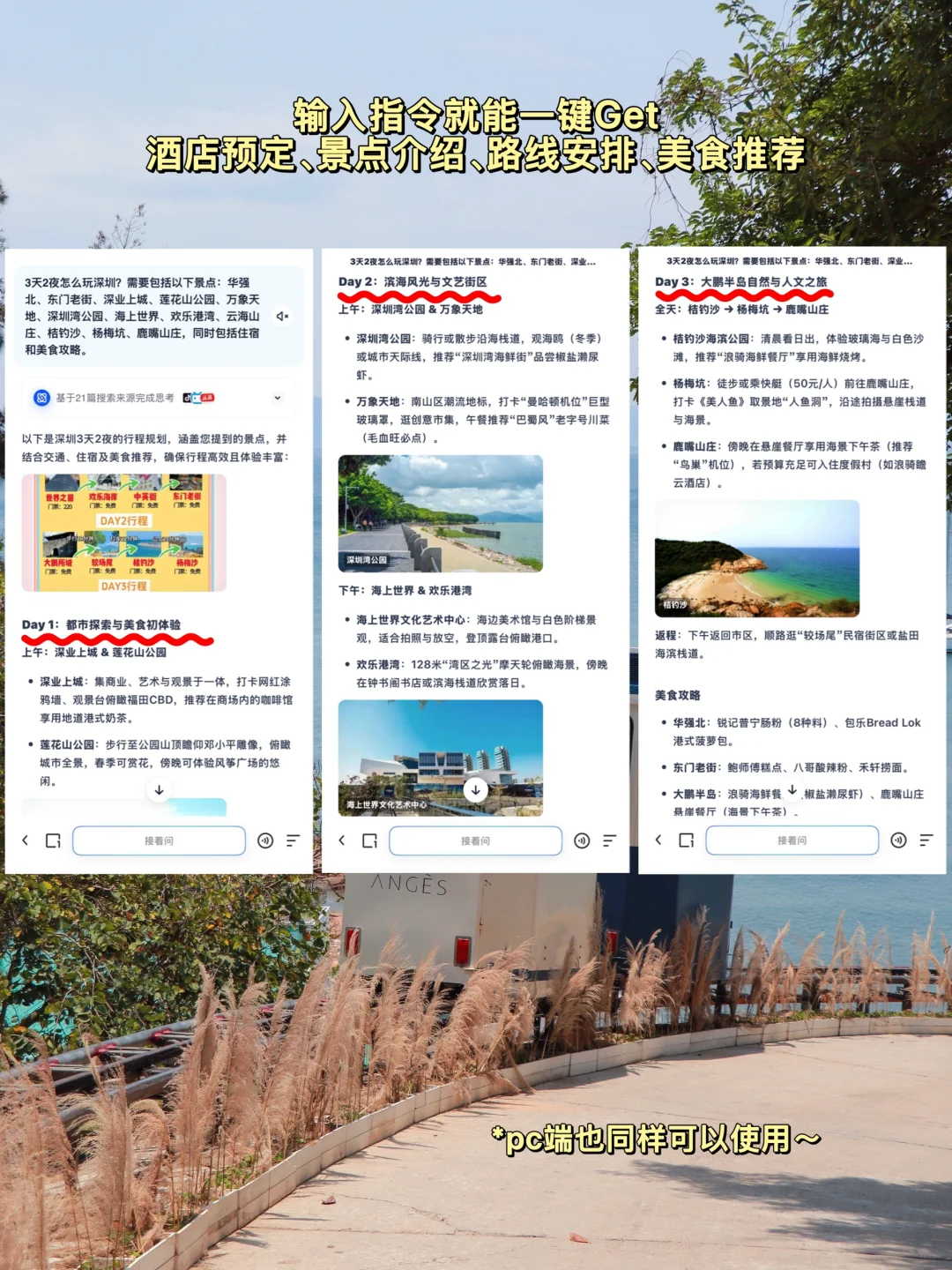 超P人每次做攻略都很头疼,有了夸克的AI搜索🔍后就方便了很多,在找到自己想去的景点后“喂”给夸克重新整理路线,输入指令就能一键Get酒店预定、景点介绍、路线安排、美食推荐….超便利~