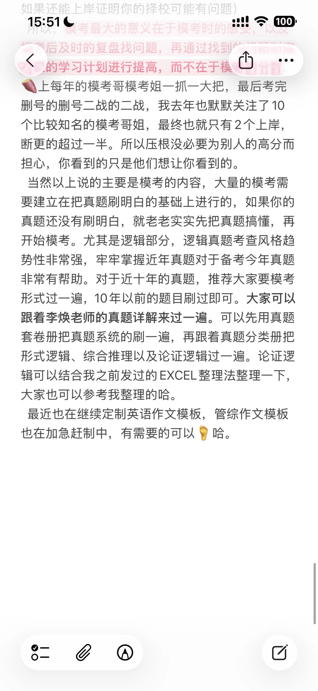 当然以上说的主要是模考的内容,大量的模考需要建立在把真题刷明白的基础上进行的,如果你的真题还没有刷明白,就老老实实先把真题搞懂,再开始模考。尤其是逻辑部分,逻辑真题考查风格趋势性非常强,牢牢掌握近年真题对于备考今年真题非常有帮助。对于近十年的真题,推荐大家要模考形式过一遍,10年以前的题目刷过即可。大家可以跟着李焕老师的真题详解来过一遍。可以先用真题套卷册把真题系统的刷一遍,再跟着真题分类册把形式逻辑、综合推理以及论证逻辑过一遍。论证逻辑可以结合我之前发过的EXCEL整理法整理一下,大家也可以参考我整理的哈。