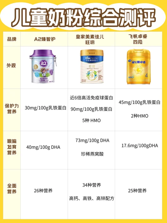 那具体怎么选到“保护力”儿童奶粉的王者呢?今天以皇家美素佳儿旺玥、A2臻智护、星飞帆卓睿四段为例,我们一起来看看他们的保护力表现到底如何吧!