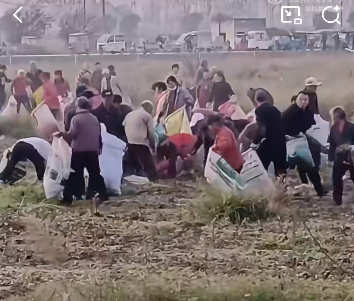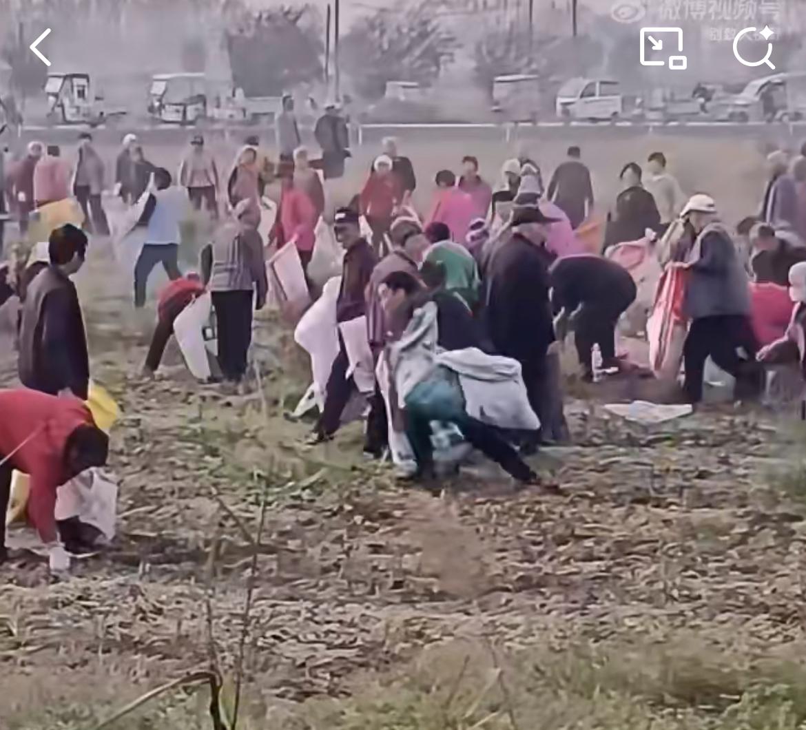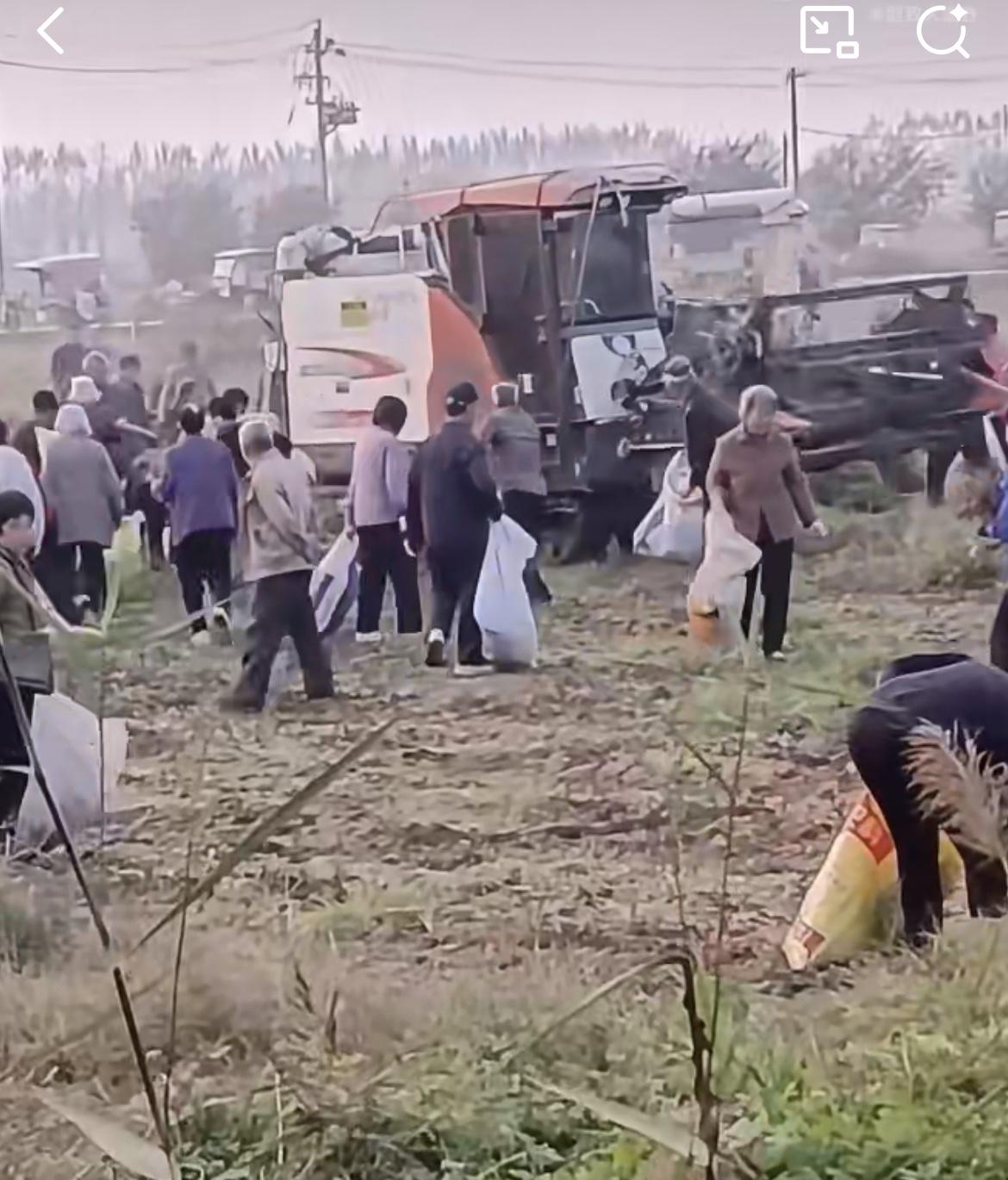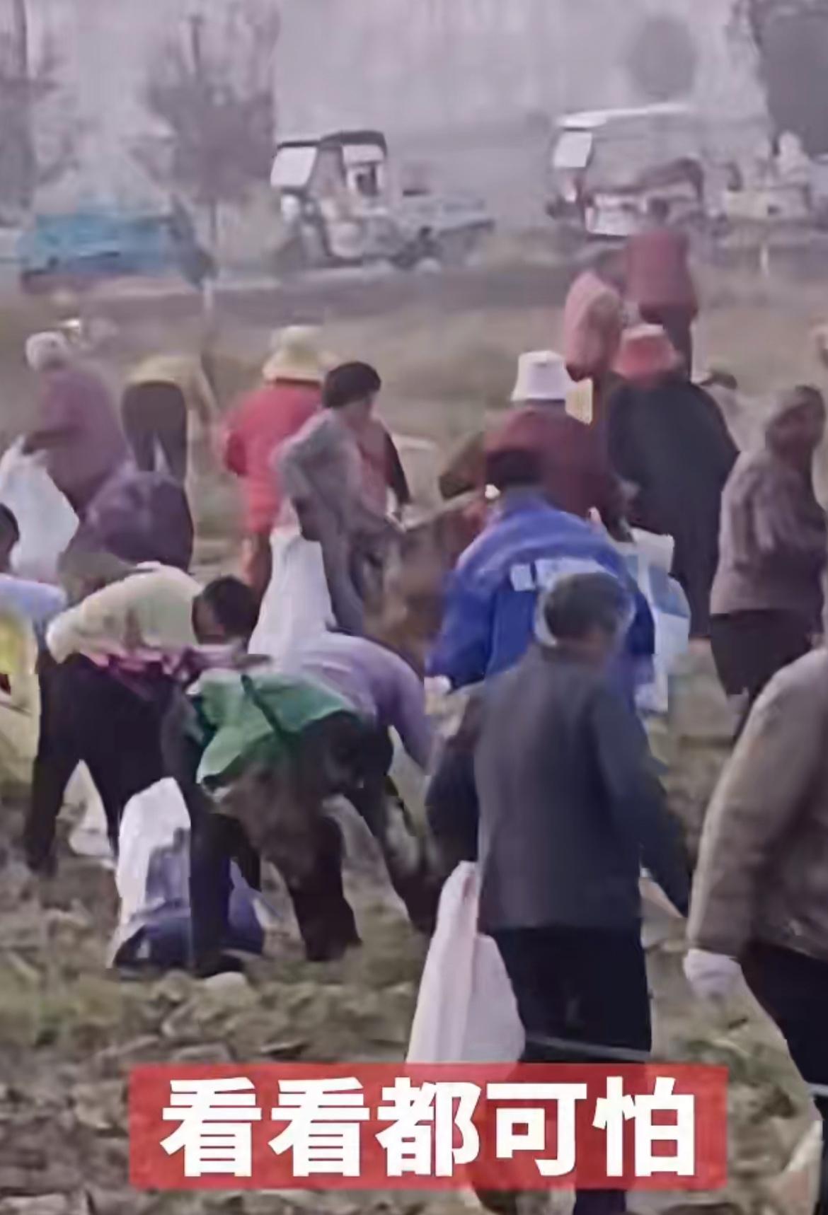 收割机下捡漏的农村老头老太,个个都不要命了。看图片应该是收花生,收割机准备刨地收割,目测一下至少有50个农村老头老太拿着蛇皮袋,围着收割机旁边捡花生,弄的收割机都不敢作业,有一个黑衣男子,估计是老板冲过去想把老头老太的袋子给没收。就这样种地,有多少都得赔进去,太难了。卖东西的老奶奶 拾破烂老人