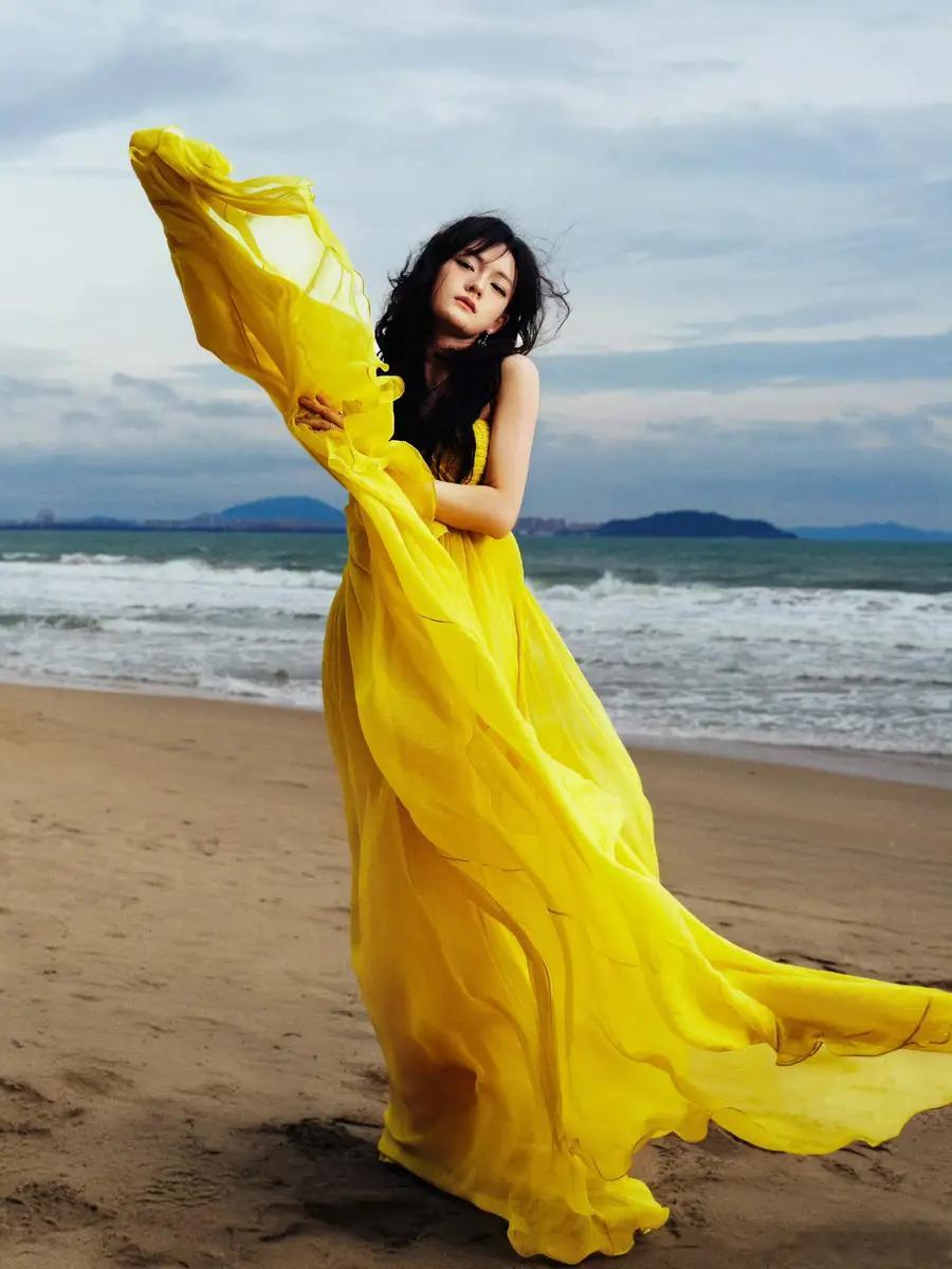 文淇一袭黄色抹胸纱裙明媚随性 发丝飘逸氛围感拉满