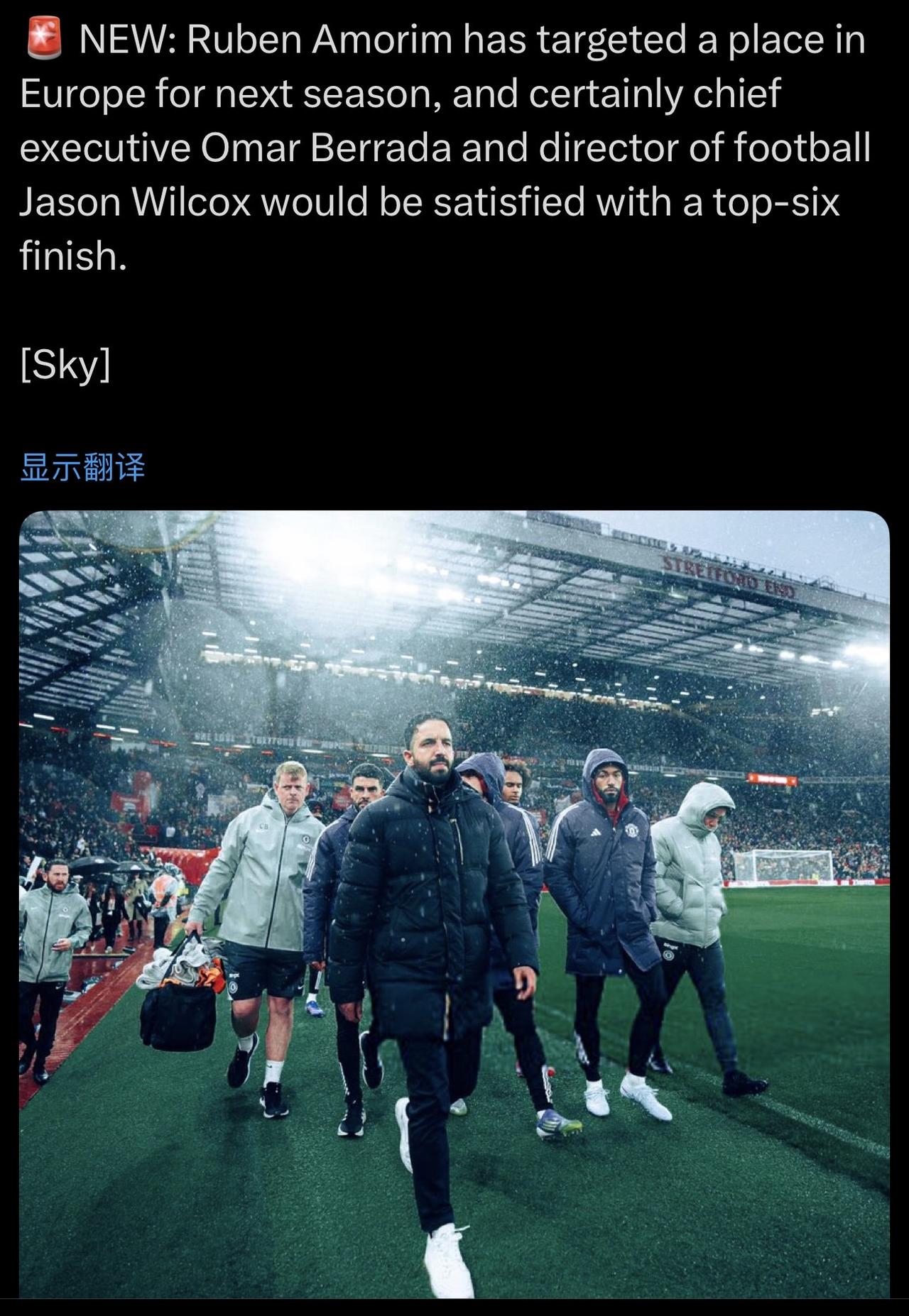 曼联今年的目标是重回欧战,不是明确的欧冠。 所以争6,是目前队内设定的最低目标! 🔴最新消息:鲁本·阿莫林 (Ruben Amorim) 已将目标锁定在下赛季的欧洲赛场上,首席执行官奥马尔·贝拉达 (Omar Berrada) 和足球总监杰森·威尔科克斯 (Jason Wilcox) 肯定会对进入前六名感到满意。
