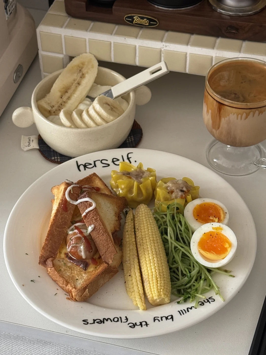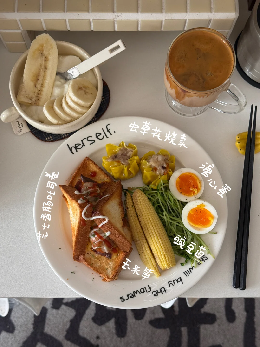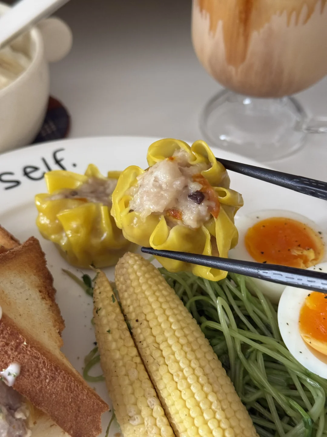 𝑴𝒐𝒓𝒏𝒊𝒏𝒈⛅️ 今天是中西结合 很搭[得意R] - 吐司烤得酥脆, 夹着爆汁香肠和融化的芝士🧀 一口下去层次绝了! - 这个虫草花烧卖也挺好吃的 口感是带一点Q弹的🥢 感觉像是加了鸡汤 很鲜 - 用燕麦奶做的dirty还挺好喝的[赞R]