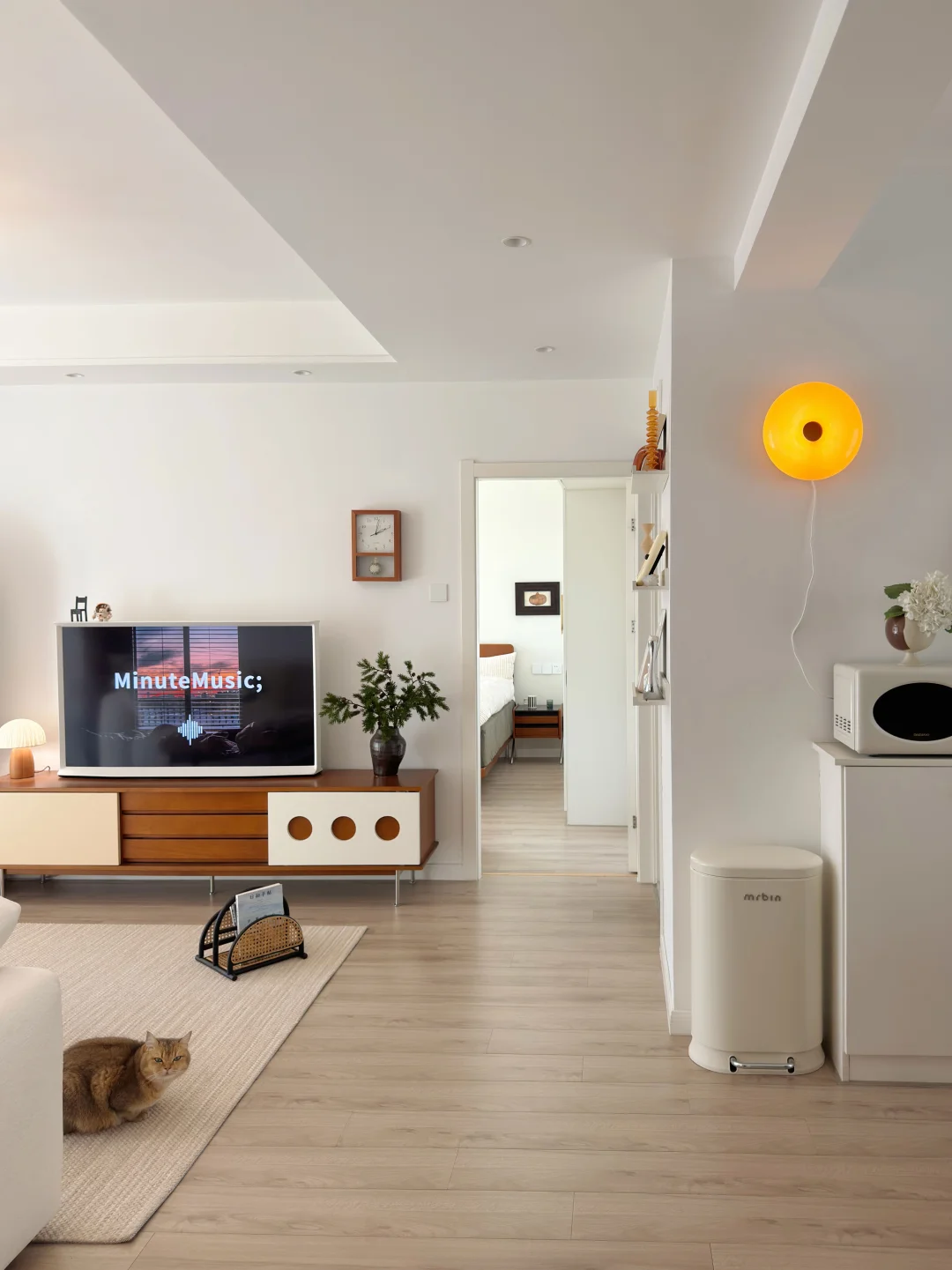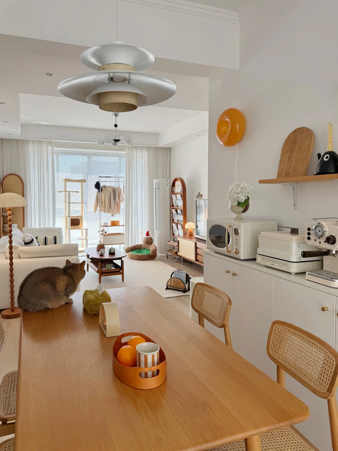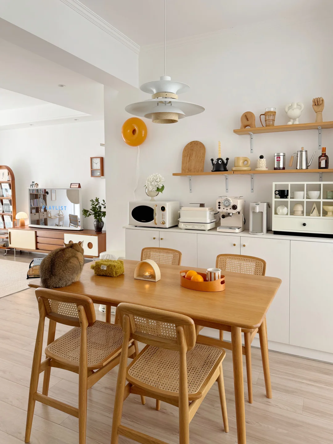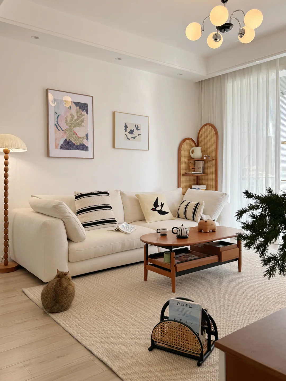 没有找设计师,没有请装修公司,自己在找灵感,自己倒腾,没想到抄作业成功了,我的70㎡房子变得好看又好宅~ - 硬装从简真的省钱又耐看,客餐厅通刷大白,简单双眼皮吊顶+四周射灯,中间选ins魔豆吊灯,让整个客厅温馨又明亮~ - 入住后增添我喜欢的家具软装,一步步把房子变成了家的样子~虽然我的家不高级,但简单温馨就很好~ -
