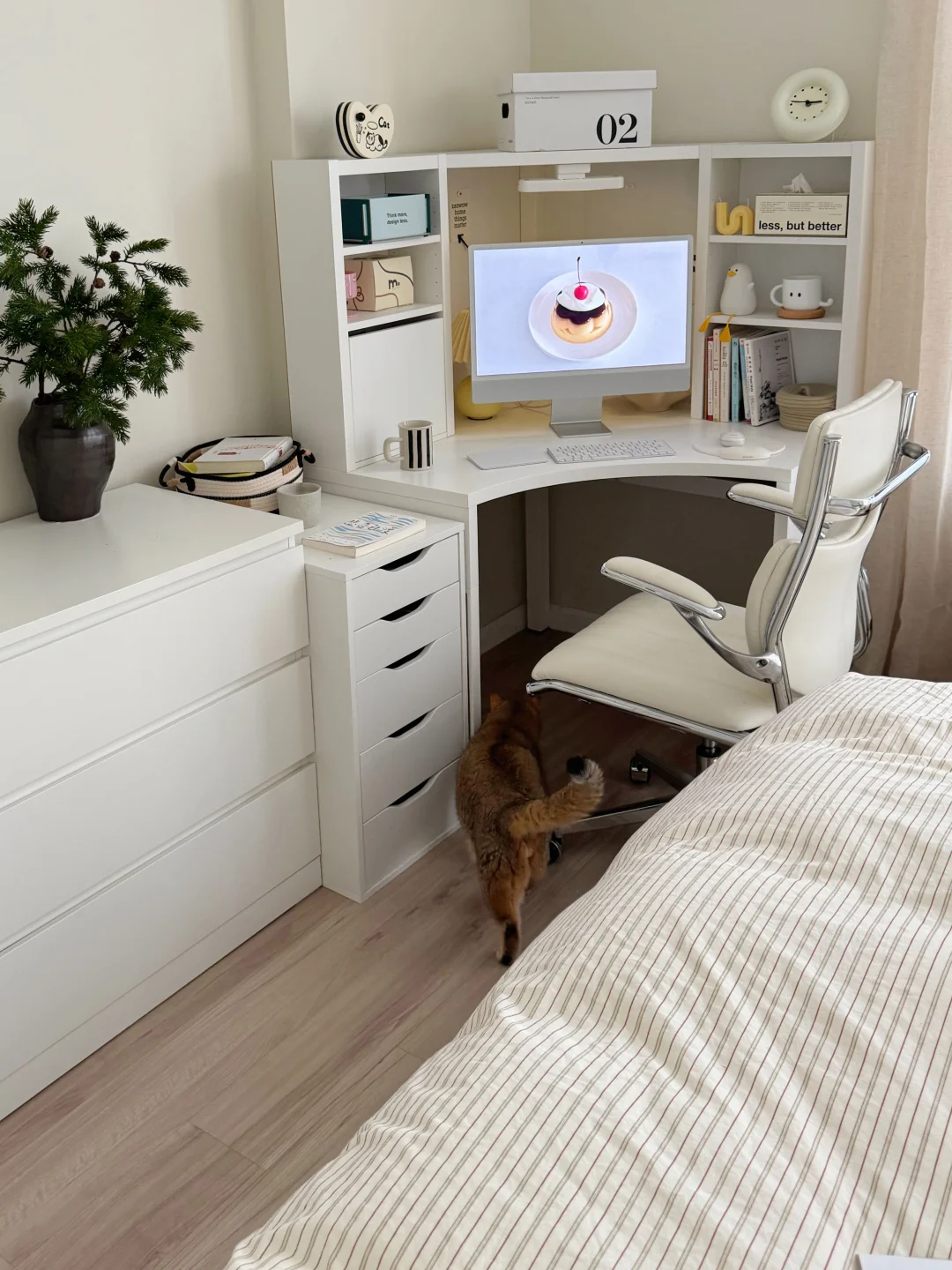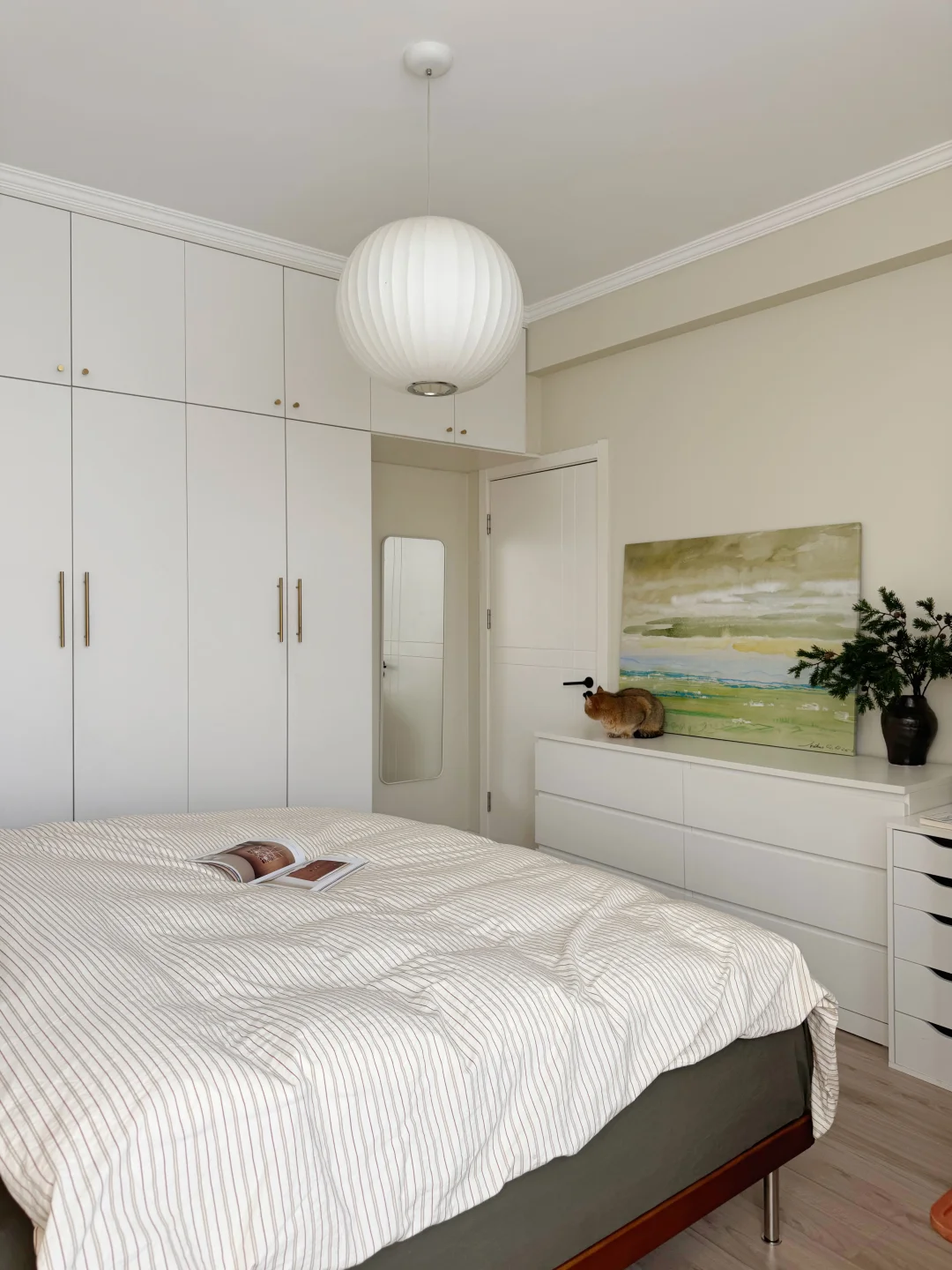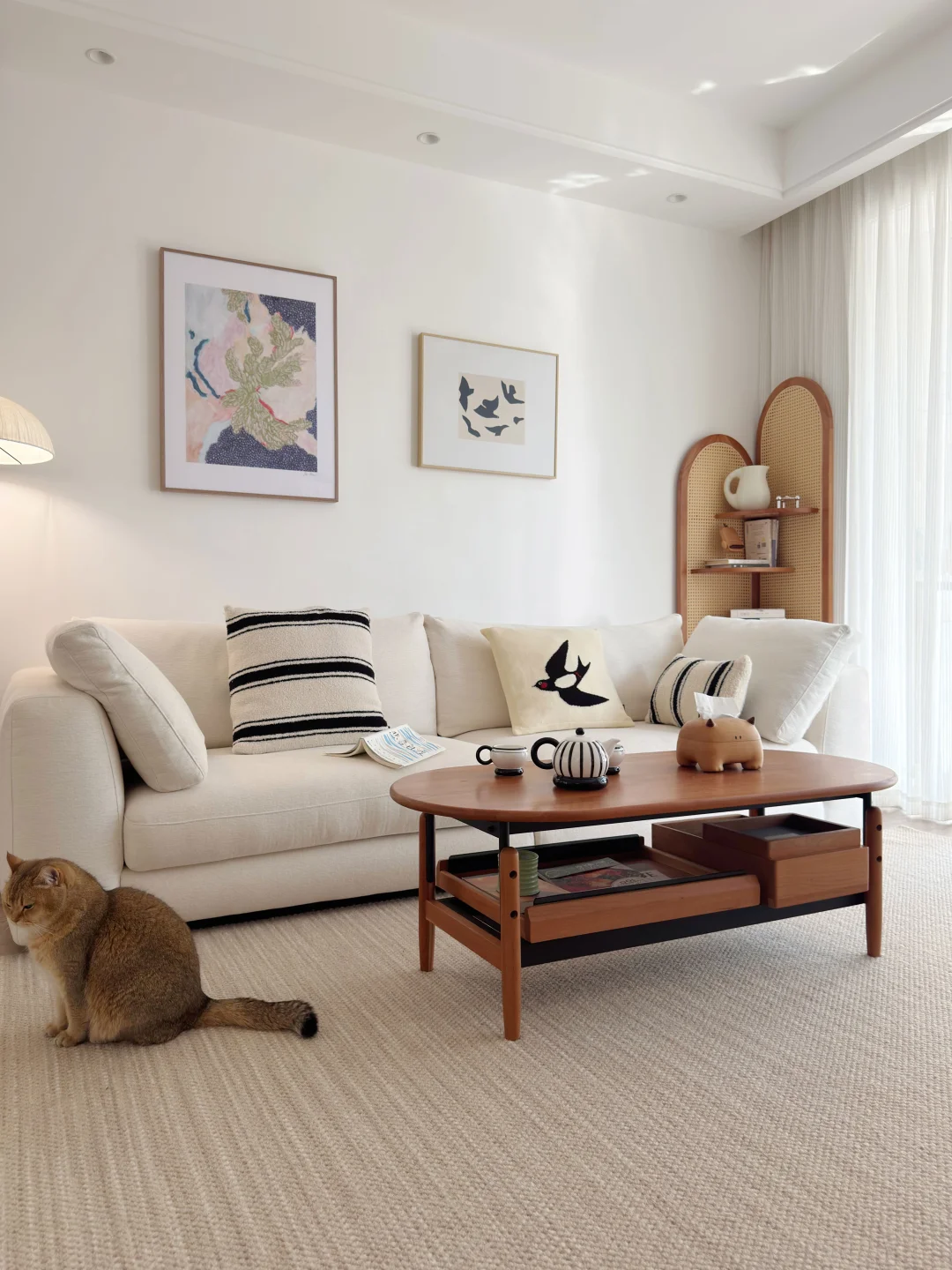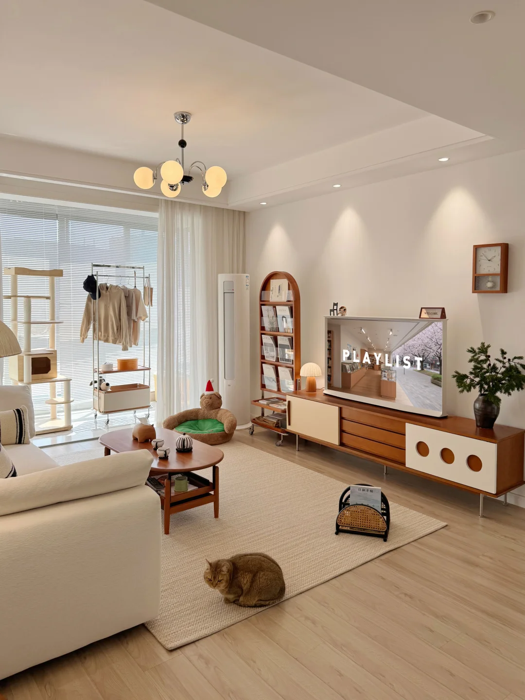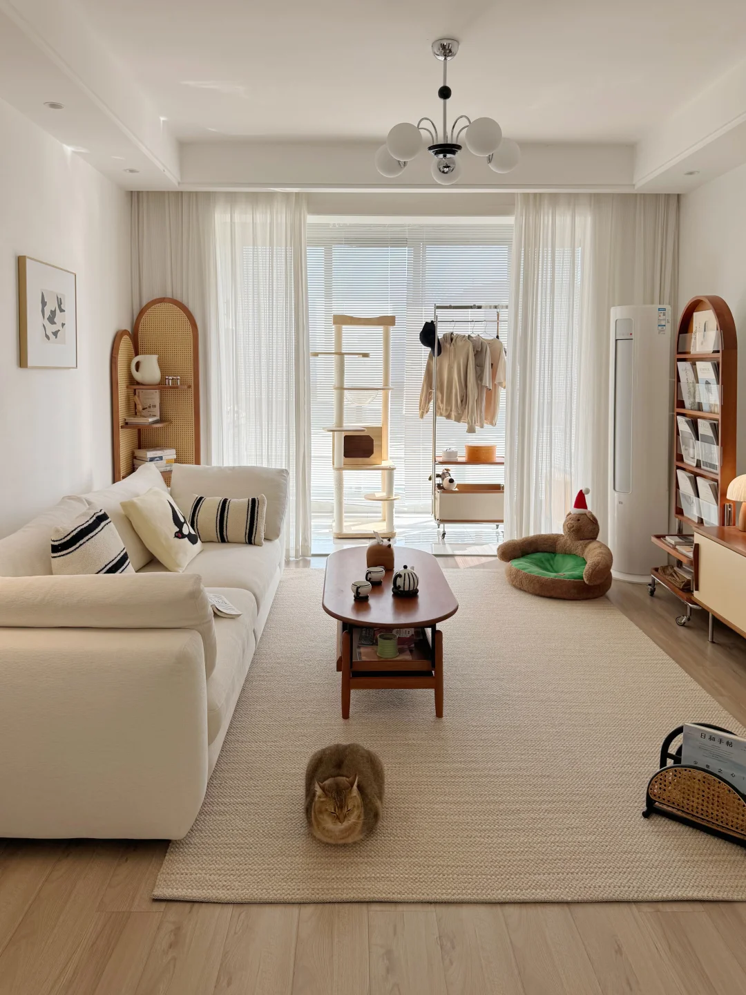 没有找设计师,没有请装修公司,自己在找灵感,自己倒腾,没想到抄作业成功了,我的70㎡房子变得好看又好宅~ - 硬装从简真的省钱又耐看,客餐厅通刷大白,简单双眼皮吊顶+四周射灯,中间选ins魔豆吊灯,让整个客厅温馨又明亮~ - 入住后增添我喜欢的家具软装,一步步把房子变成了家的样子~虽然我的家不高级,但简单温馨就很好~ -