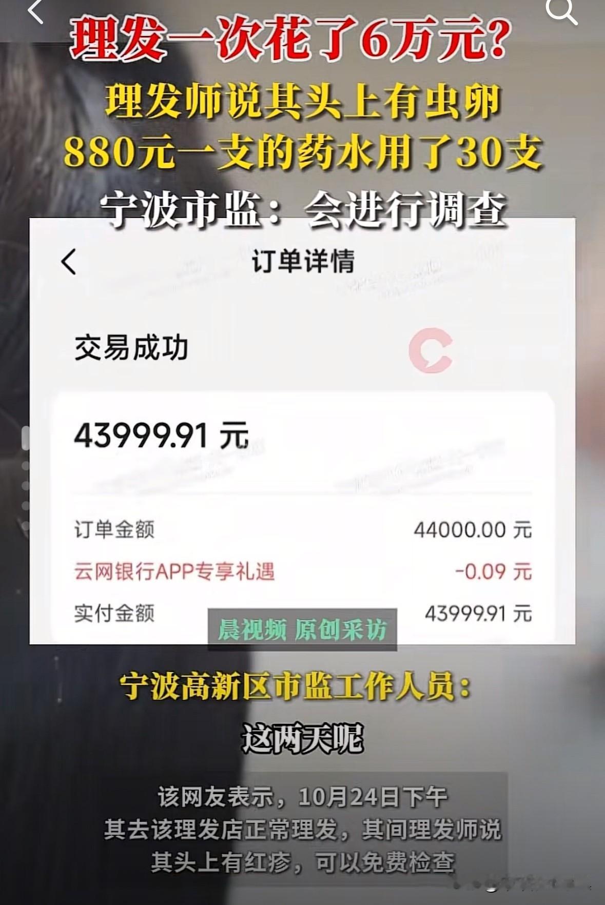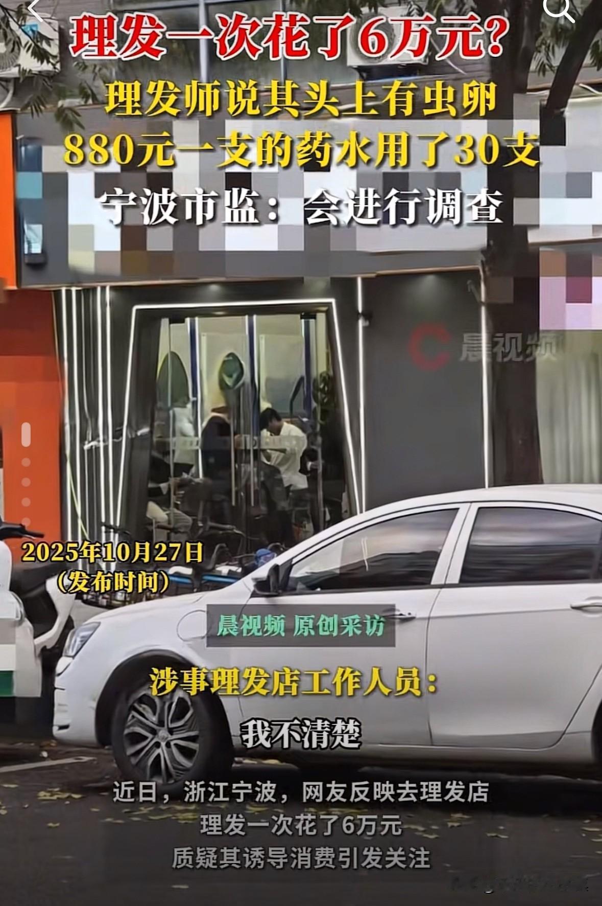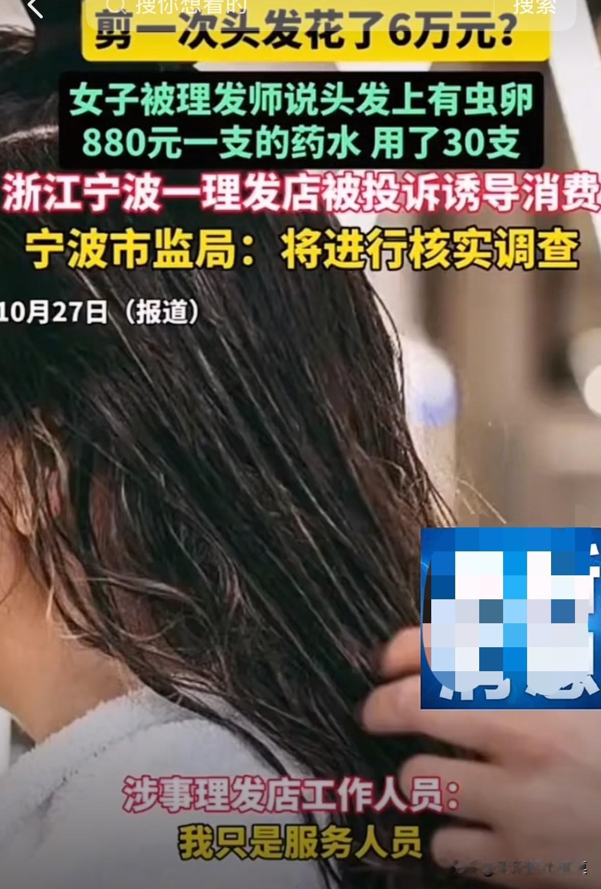 浙江宁波一位大哥去理发店剪头发,居然花了6万元。 据了解,理发师给大哥剪头发时,说大哥头上有红疹可以免费检查。 店员用店里的显微镜检查的过程中,又说大哥头上有虫卵,可以用店里的药水清理,一支只要880元! 经过大哥同意后,店员直接给大哥用了30支,一共是26400元。 用完药水后,店员再次检查,说效果很好,已经看不到虫卵了。 随后,店里的人员又让大哥办理了6万元的套餐,还说:“本来是12万的套餐现在只收您6万,后续的药水费和治疗费直接从里面扣就行了。” 大哥回到家后总觉得哪里不对,直接投诉到市监管局,现在正在调查中。 这是抓住韭菜连根拔起的节奏啊,这店里的理发师还挺客气的,没有直接抢。 这大哥咋回事啊,回家才觉得有问题,你反应的也太慢了吧。理发店天价收费