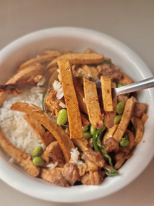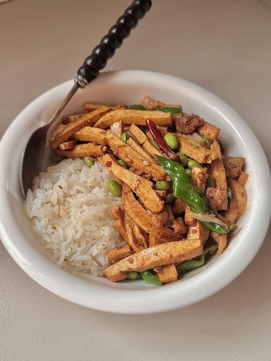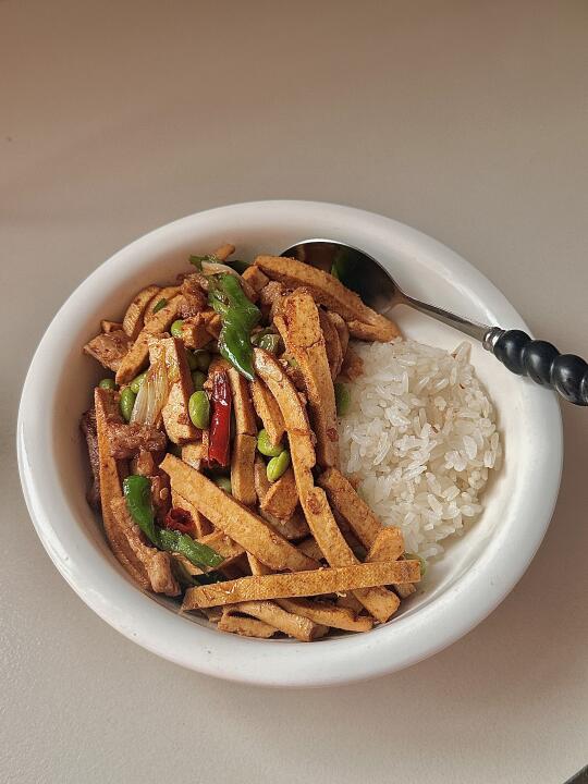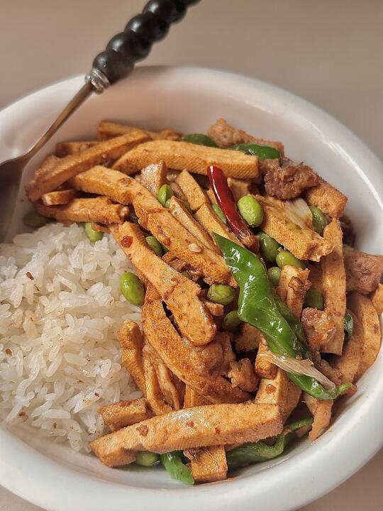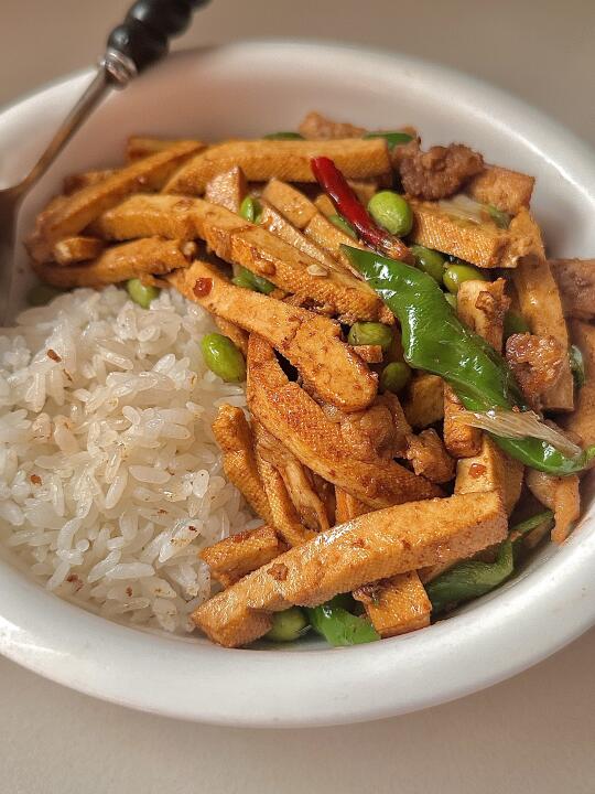 过年要有仪式感 一个人的减脂餐也要吃的舒服,香辣毛豆炒香干 巨好吃😋配上米饭 泰香啦! 食材:香干 青辣椒 毛豆 肉🥩 干辣椒 葱姜蒜! 做法: 1️⃣毛豆焯水煮2分钟,豆干烫一下捞出沥水 2️⃣肉炒熟放干辣椒 葱姜蒜炒香 放香干毛豆翻炒 3️⃣放生抽 盐🧂鸡精调味 最后放青椒翻炒入味出锅