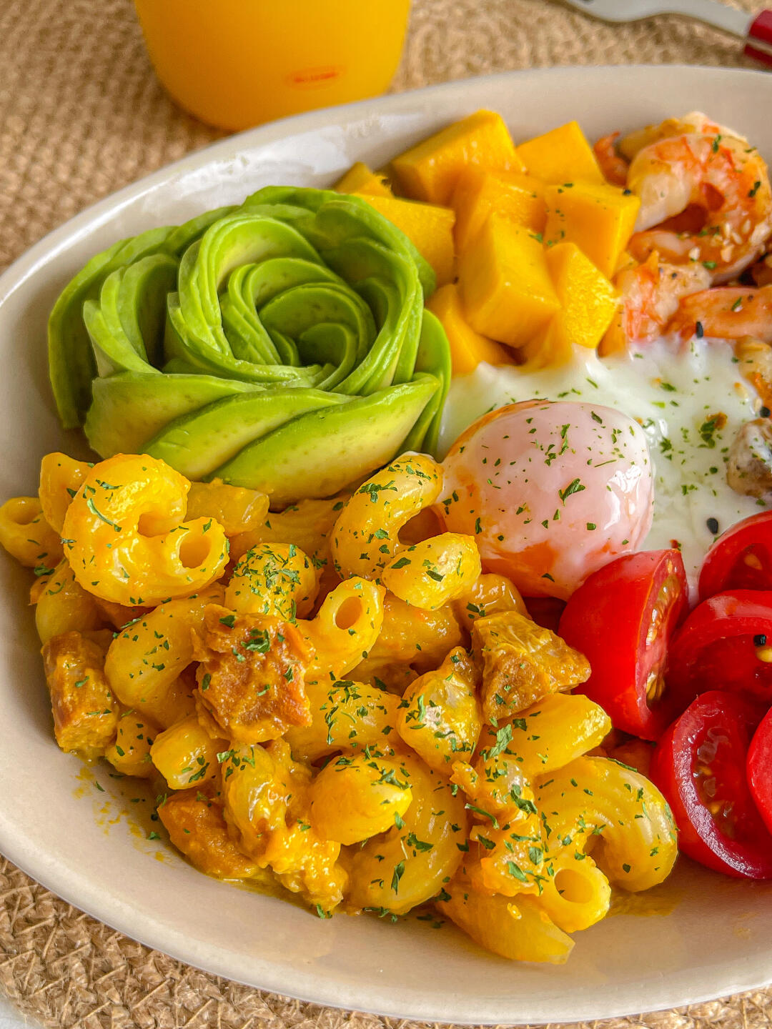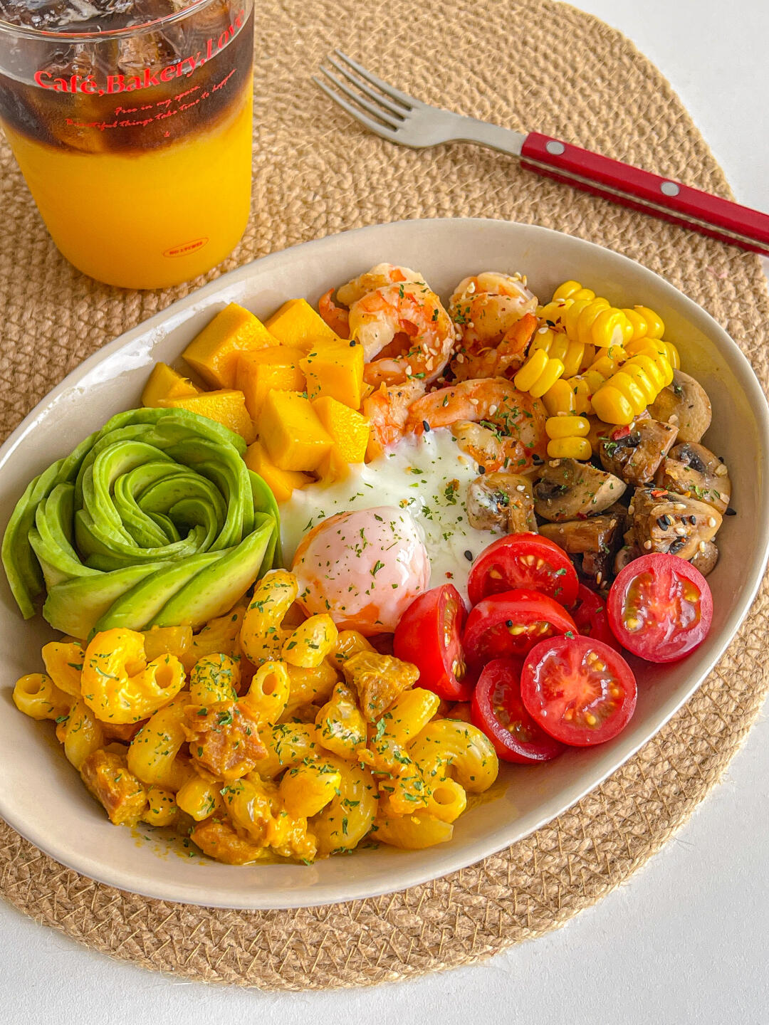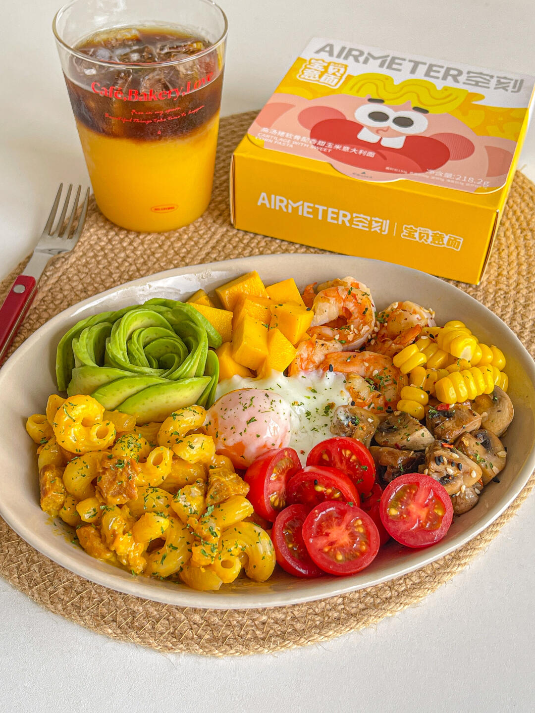 宝贝意面➕牛油果➕口蘑➕圣女果➕虾➕温泉蛋➕芒果➕玉米