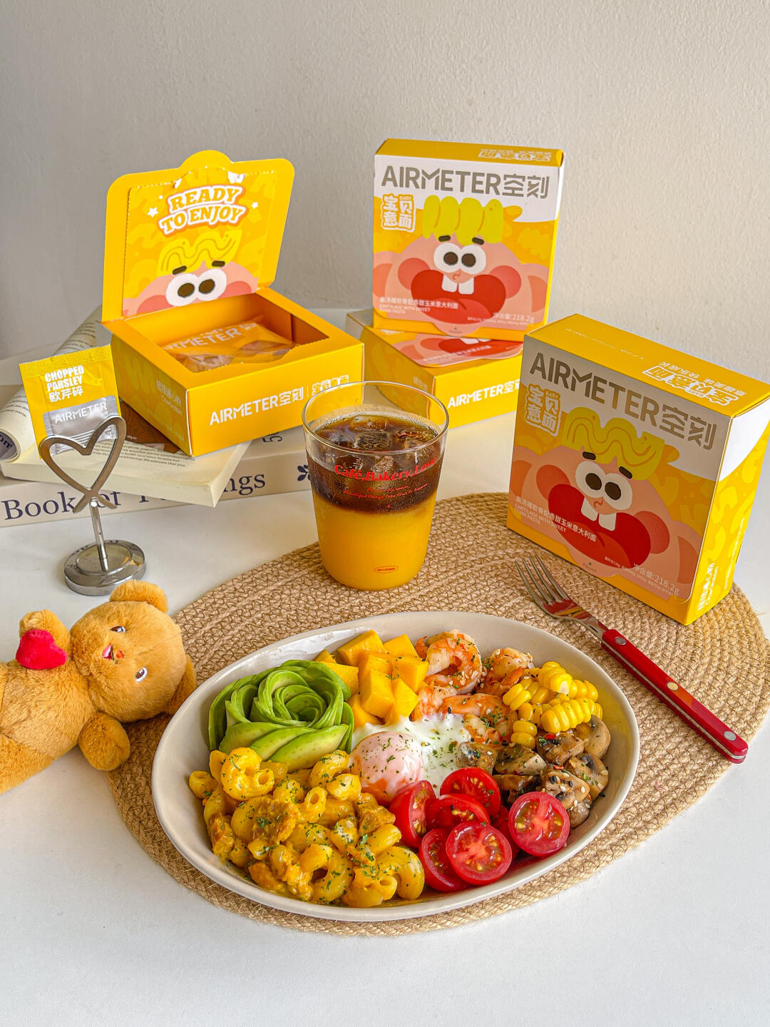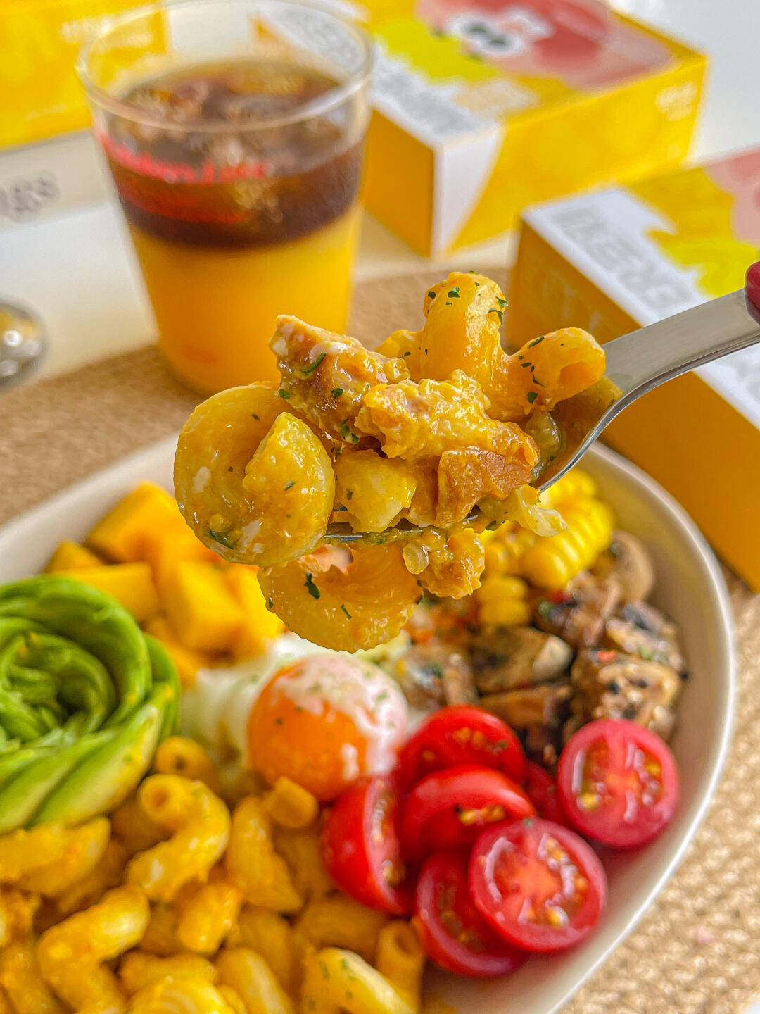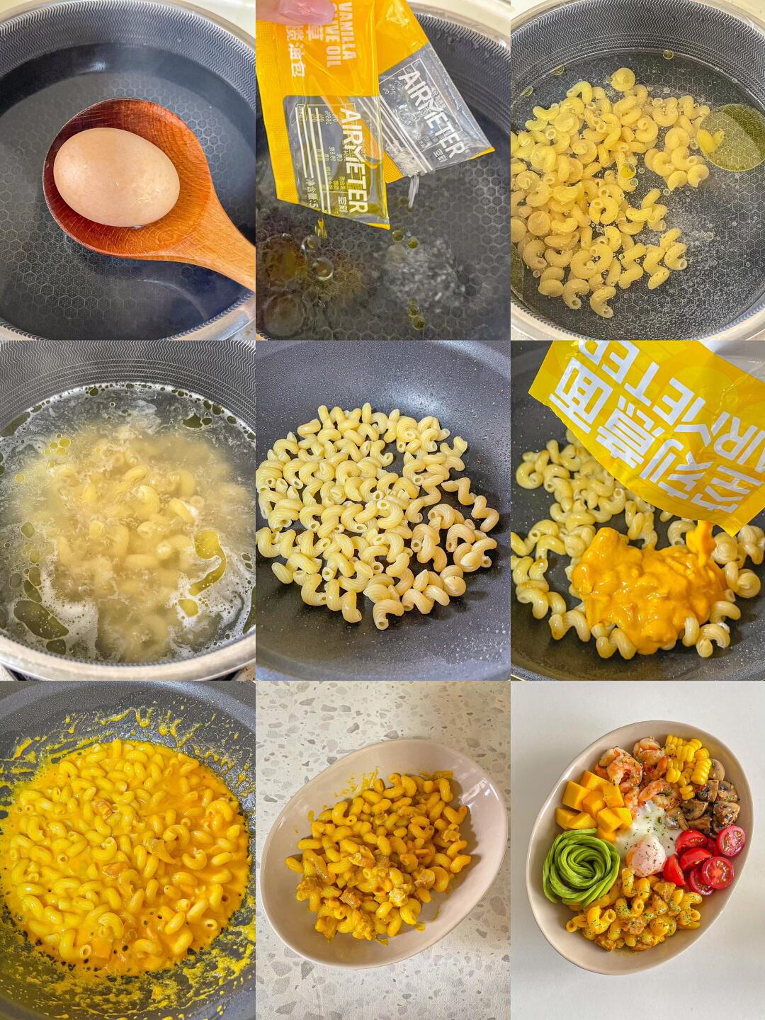 宝贝意面➕牛油果➕口蘑➕圣女果➕虾➕温泉蛋➕芒果➕玉米