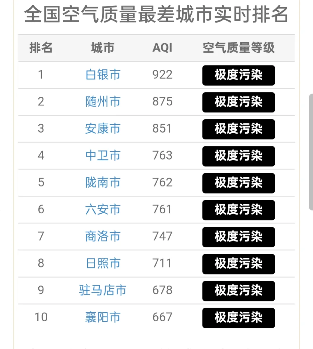 受强冷空气影响,今天上午9时,湖北、湖南北部、安徽、江苏北部、河南、山东、甘肃、陕西、宁夏、四川东部、重庆等地空气质量显著偏差,南方地区的湖北随州AQI达到875属于极度污染。预计今天下午沙尘还将继续南下至江南地区南部等地。
