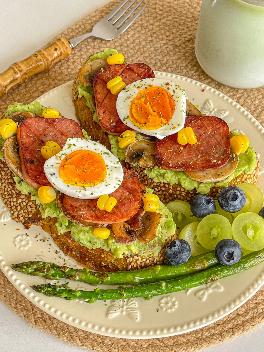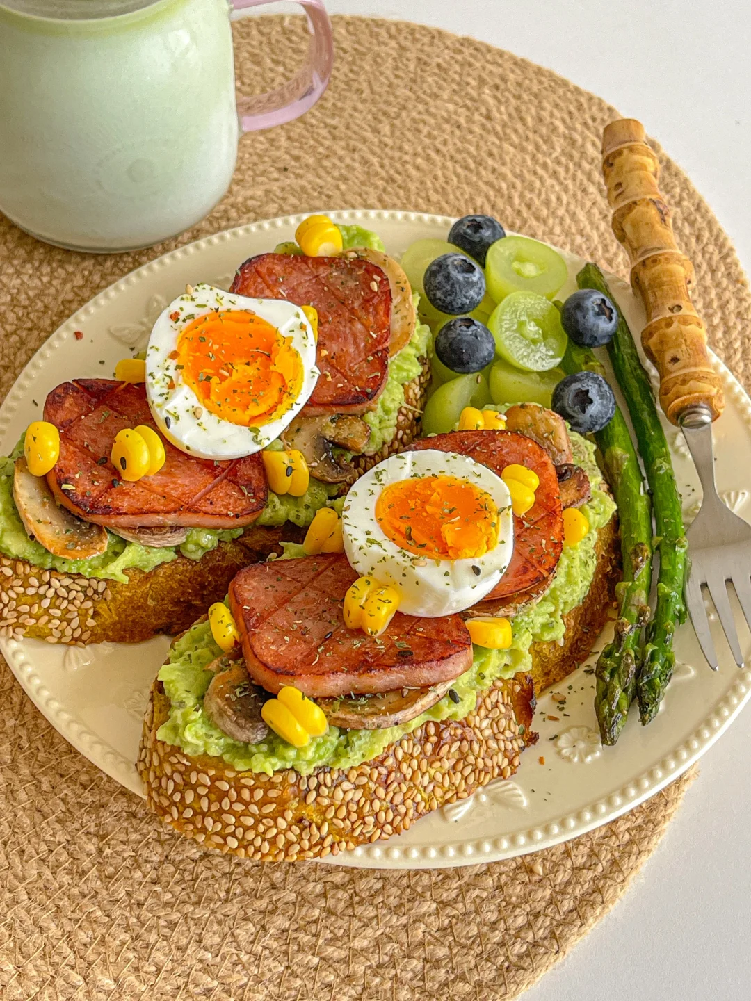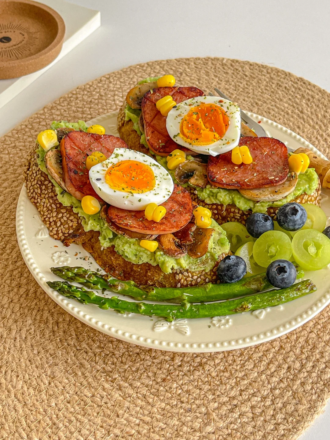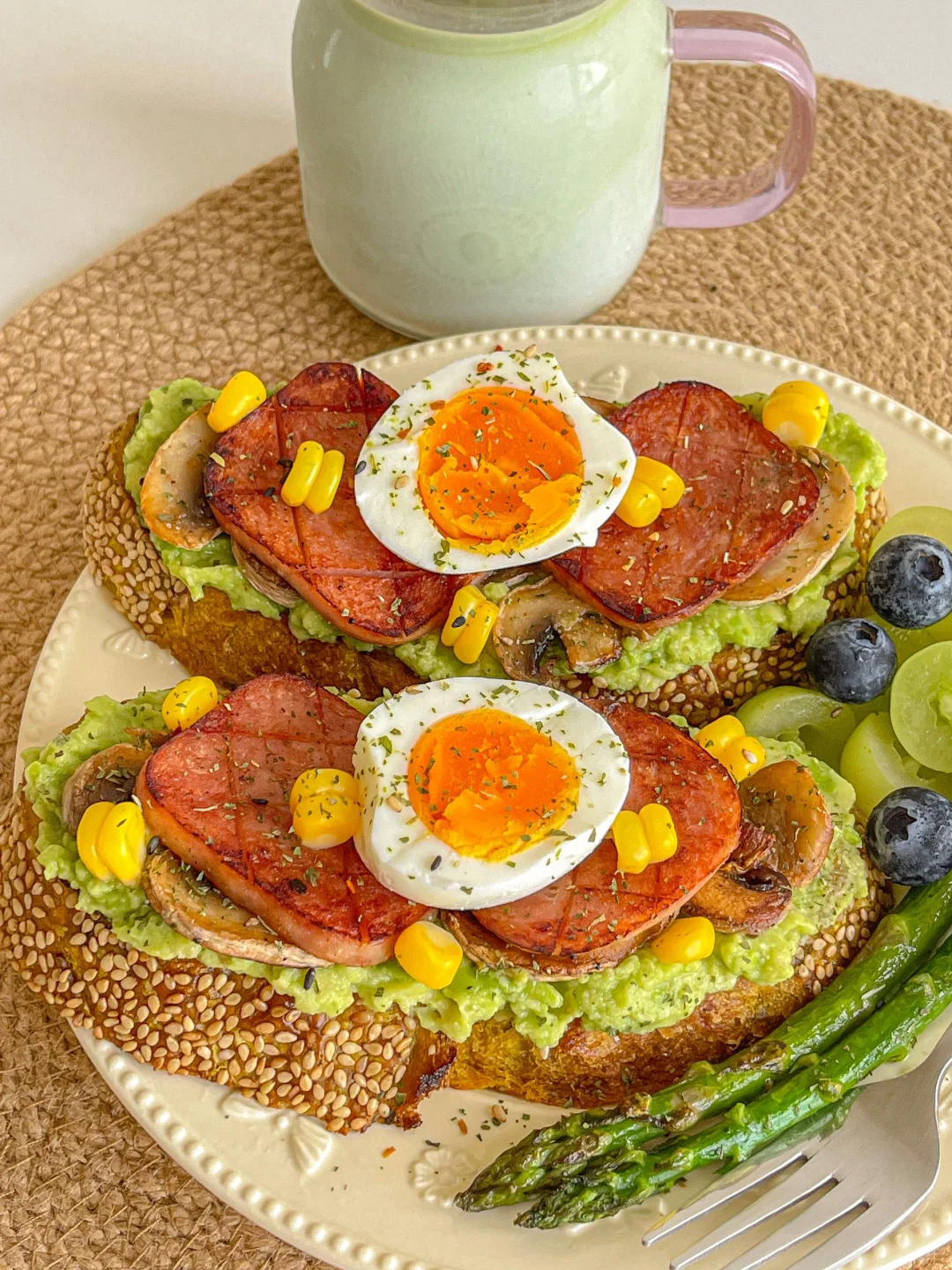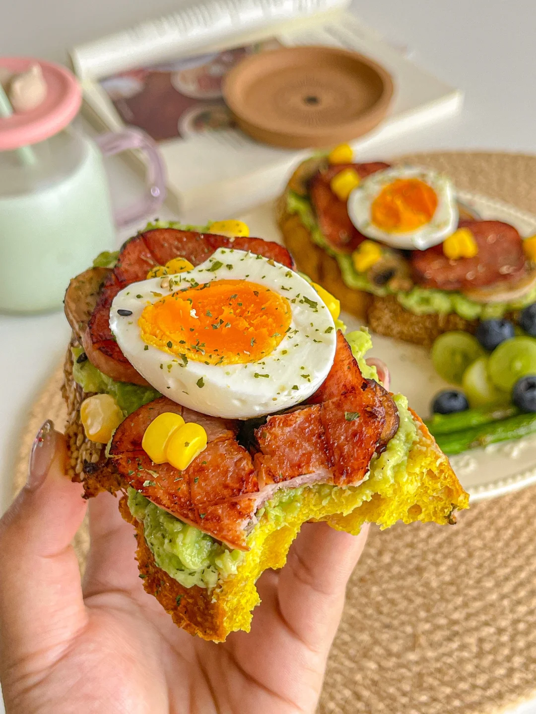 百吃不腻的开放式欧包三明治! 早餐这样吃简单又美味!一整个满足😋 食材:🍳 欧包➕牛油果➕午餐肉➕鸡蛋➕玉米➕芦笋➕青提➕蓝莓 今天喝清爽的抹茶拿铁!好久之前囤的抹茶 可能是时间久了 颜色都不绿了 不过味道还是一样好喝~最近多喝喝 把它消耗掉[偷笑R]