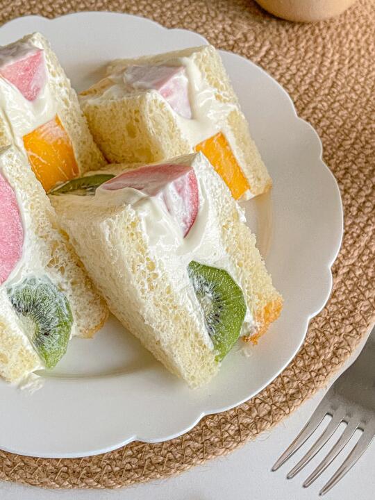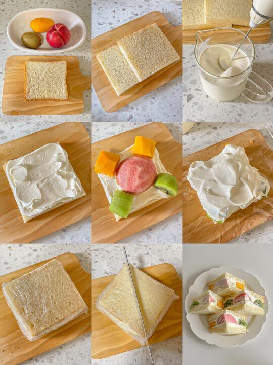 幸福感满满的三拼水果三明治🥭🍑🥝 淡奶油用的小电动打发器打的 没有打发到位! 好在这个奶油口感 搭配吐司和水果是真的好吃😋 食材:🍞 生吐司➕猕猴桃➕水蜜桃➕芒果➕淡奶油➕0卡糖 做法在p6 按顺序用保鲜膜包裹起来 放冰箱冷藏30分钟左右在切开 奶油可以换成希腊酸奶 个人更喜欢淡奶油 奶香味很浓 加上水果的清爽!生吐司软糯香甜 一整个组合口感丰富 炎炎夏日来一口巨满足[派对R]chao适合夏日的早午餐