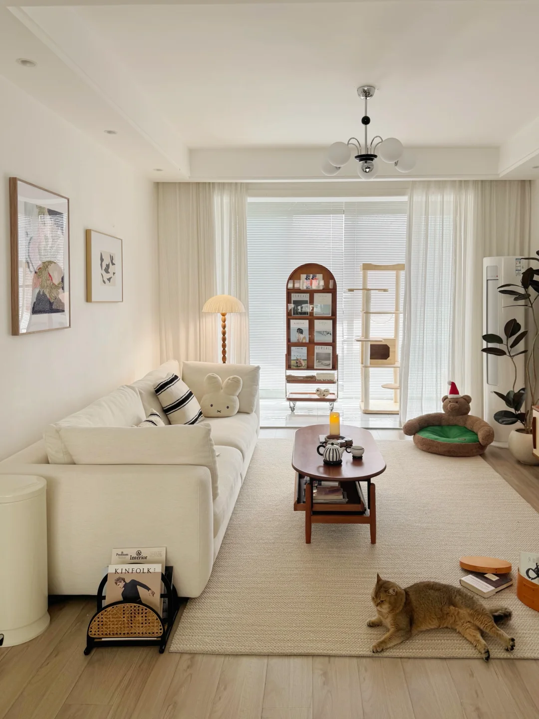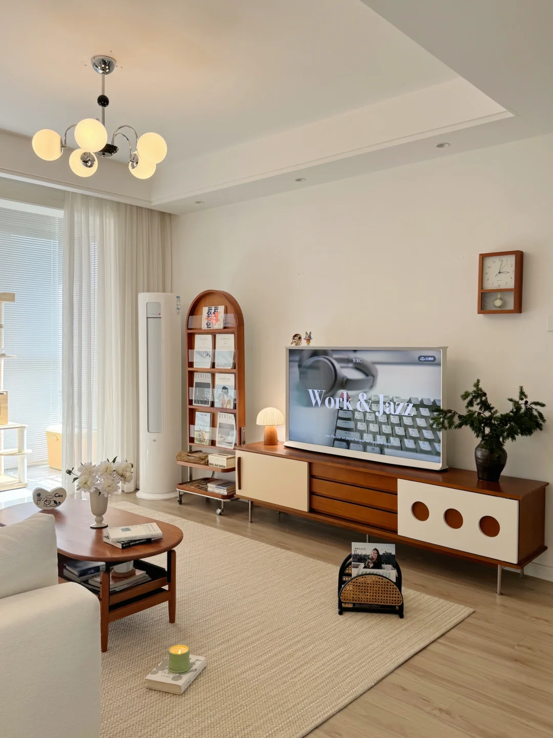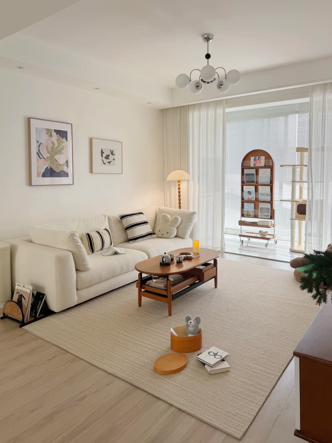 5年前装修的小房子,当初预算低,没有请设计师,自己倒腾,请师傅施工,硬装从简,只花了8w就搞定了硬装~ 入住后努力工作,慢慢把想要的家具软装搬回家。 这几年把沙发餐桌电视柜都换了,客厅也换上了ins魔豆吊灯,灯光让客厅更有氛围感~ 普通人通过自己的努力住进了这样温馨的小家真的很知足~ -