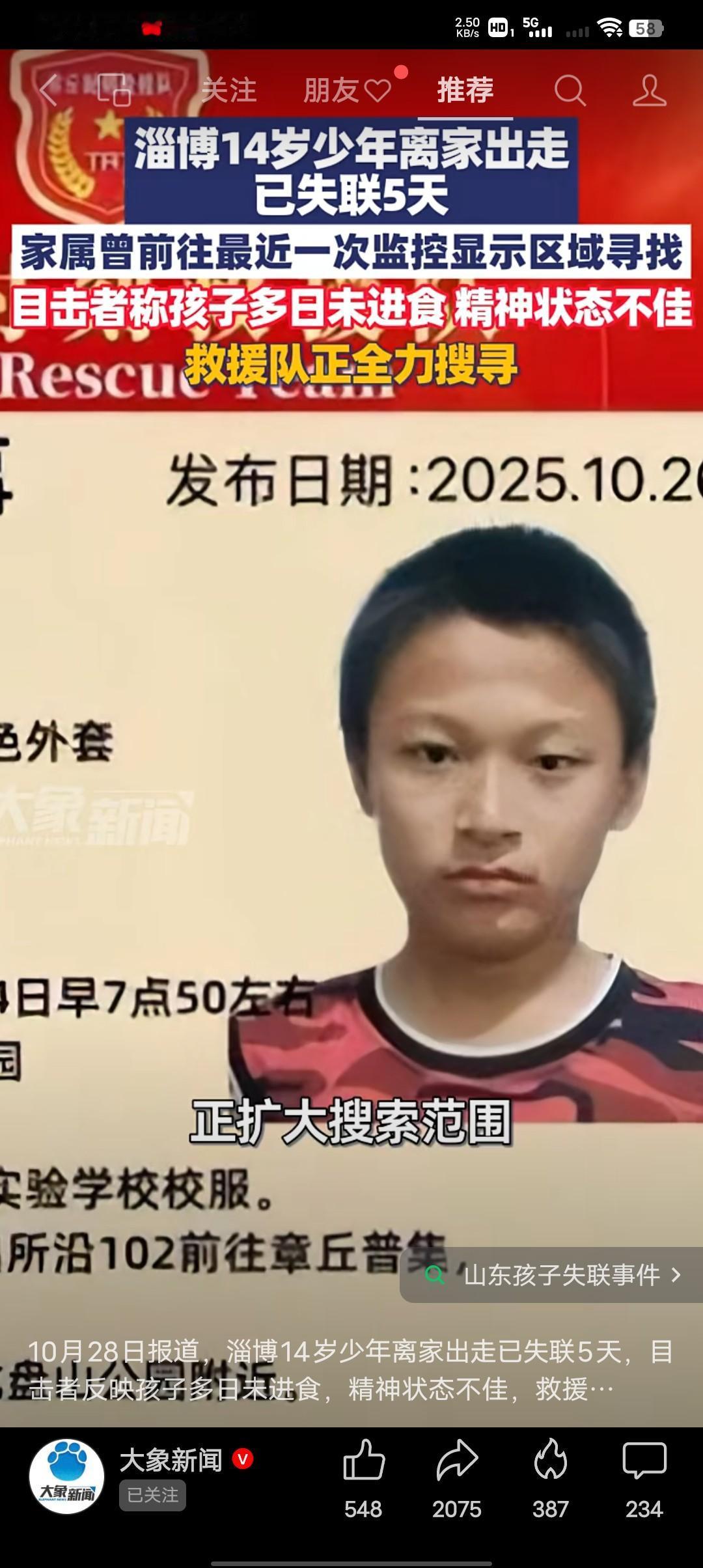 淄博14岁少年葛怀凯已经失联五天,出走的原因竟是因为手机被没收。 10月24日早7点50分淄博市张店区齐盛花园的14岁少年葛怀凯,因为手机被没收离家出走,至今已经失联五天了。家属发现孩子失联后,发布了寻人启事,并向章丘时刻救援队求助。 监控显示葛怀凯于27日12:30分左右出现在章丘区圣井街道宋上村,但救援队赶到时已经过去两三个小时,在鱼池附近监控中,只看到孩子从此经过,再往外便没有监控覆盖。家属称曾去最近一次监控所在的区域寻找,据目击者反映,孩子多日未进食精神状态不好! 目前章丘时刻救援队在扩大范围寻找。 现在的孩子都怎么了,应该都是手机游戏惹的祸吧!手机不离手,游戏上瘾,就跟吸毒一样,如果一天没有手机好像就不能活一样。不吃饭可以,没有手机不玩游戏就不能活,这个时代手机方便了我们,更坑害了孩子。孩子是祖国的未来,游戏就像蛀虫一样,在慢慢侵蚀着我们的后代。不信你出去看看,无论你在哪个区域哪个公共场合,十人有十人都是低头玩手机。不仅坏了视力,更坏了心智! 这坑人的游戏应该管一管!