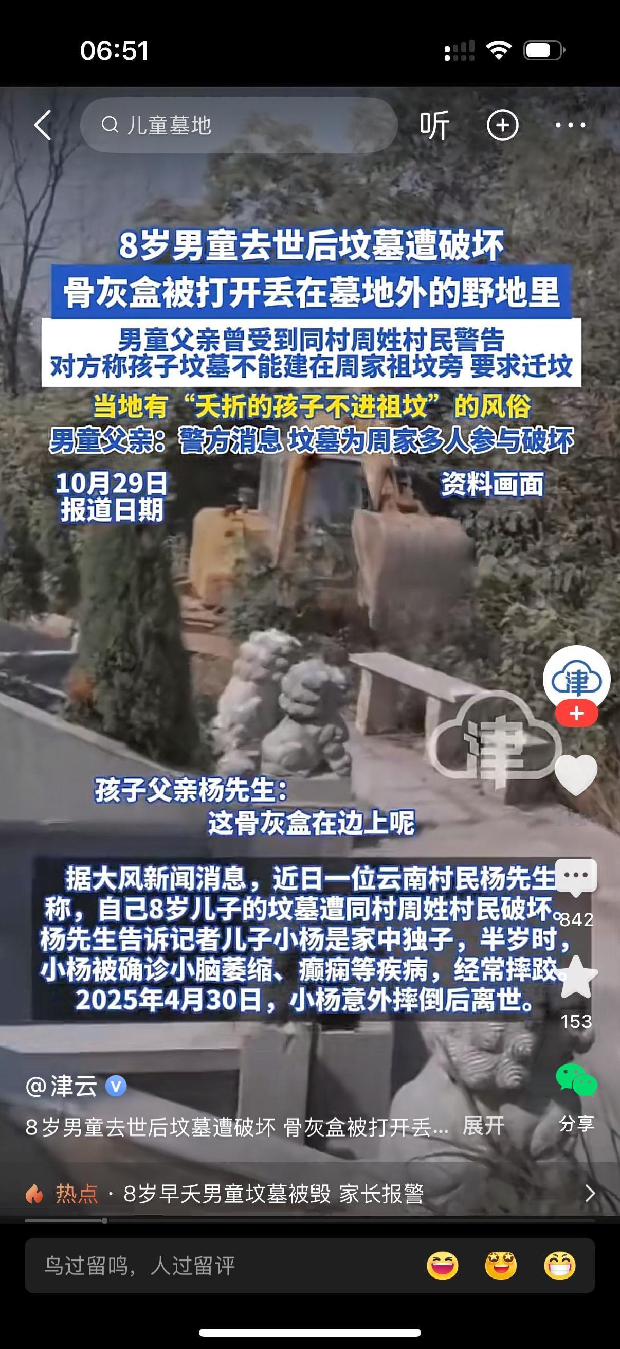 从小就患有小脑萎缩症,癫痫病的8岁男童意外摔倒后离世。父亲把他葬于周家祖坟旁。中元节这天,父亲发现儿子的坟墓遭到破坏,骨灰盒被打开丢在墓地外的野地里。当地有夭折的孩子不进祖坟的风俗,男孩父亲曾被周家警告,孩子坟墓不能建在周家祖坟旁边,要求迁坟。最终事实也是周家人破坏了坟墓。 这周家人做的太过分。人都死了,也埋了。你们去骚扰他,就不怕吗?