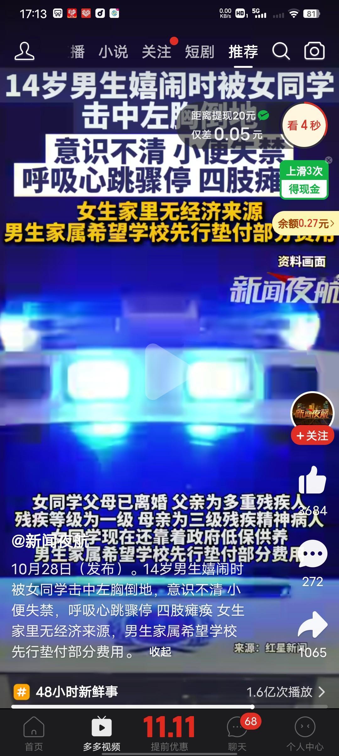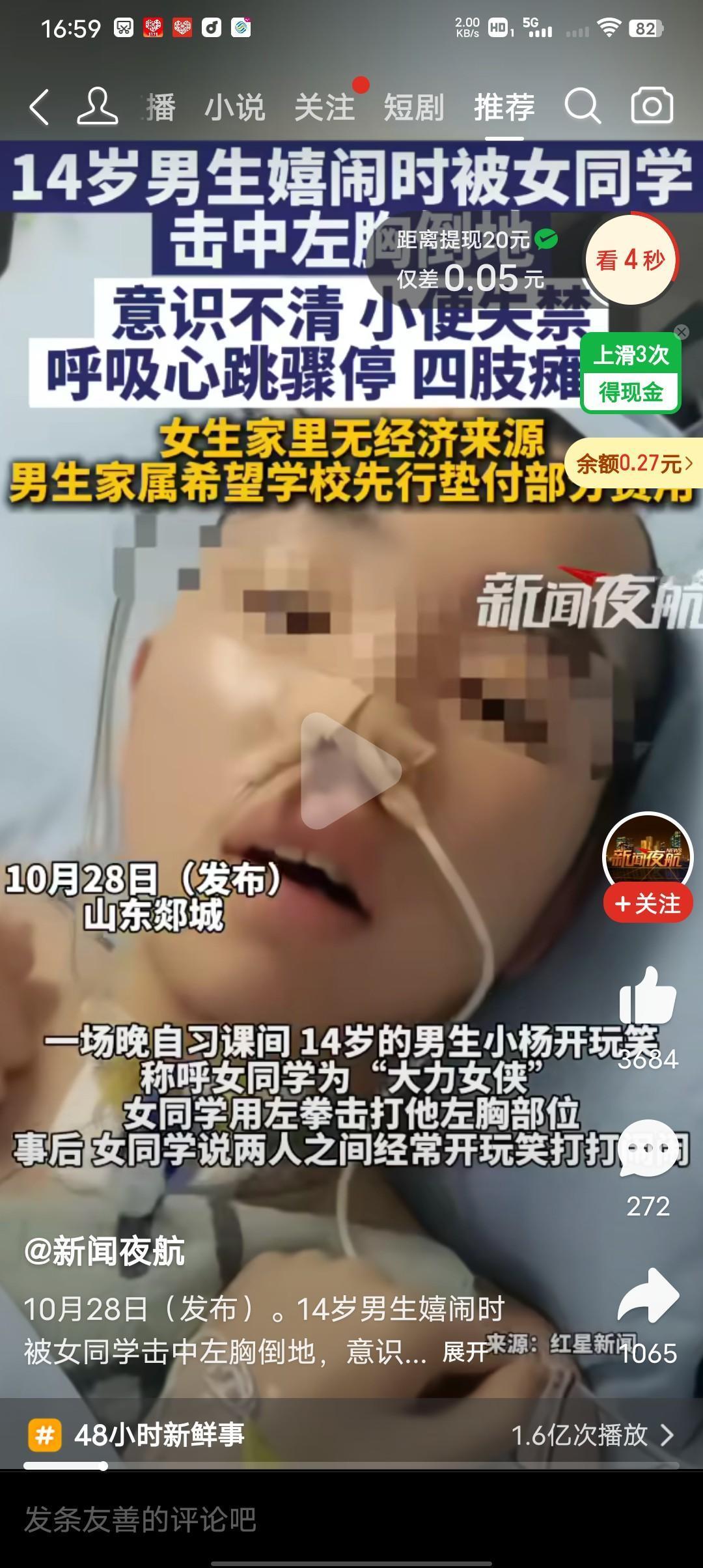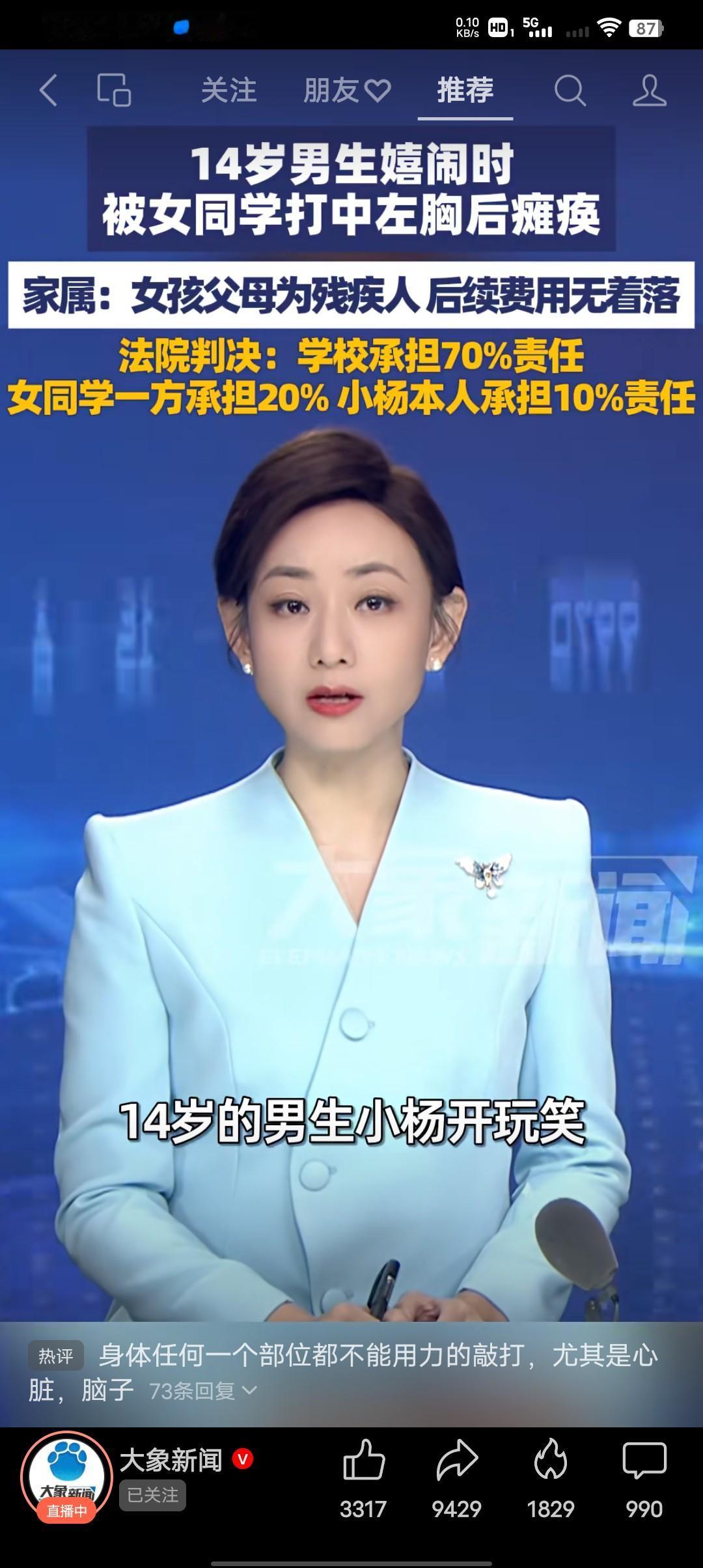 嬉笑打闹用力过猛方式不当也存在危险!年轻人之间的打闹也要掌握好力度分寸。 山东郯城14岁的男生在晚自习上嬉闹时被女同学击中左胸后瘫痪。14岁的男生开玩笑说女同学是“大力士女侠”女同学一拳击中小杨左胸,小杨栽倒在地,小便失禁,意识不清。小杨被紧急送往医院时心脏呼吸骤停,虽然小杨暂时救回了性命,他依然四肢瘫痪,言语障碍。 事后女同学说,她没有生气,以前他们经常也这样打闹的。女同学的父母已离婚,父亲为多重残疾一级残疾人,母亲为三级残疾精神病人,该女生现在还是靠政府低保供养着。在没有经济来源,如此一来更是雪上加霜。 经法院判决,这起事故,学校承担百分之七十责任,女同学承担百分之二十责任,小杨自己承担百分之十责任。男生家长希望学校先垫付一部分费用,以免耽误孩子治疗。 有人会说,现在的男孩子有这么弱吗?被女孩子一拳揍瘫痪了,这剧情太扯了吧!有些部位是不能用力击打的,头部胸部心脏都是敏感部位,一旦被大力击中后果不堪设想。无论说小杨是命该如此也好,还是学校监管不到位也罢,总之嬉闹一定也要掌握好力度,万一有个闪失后悔一辈子!