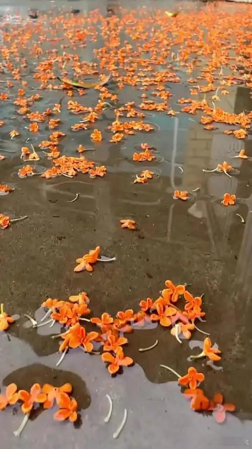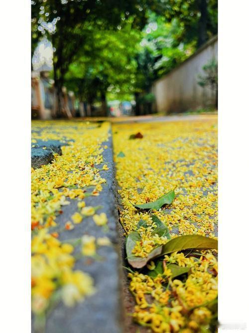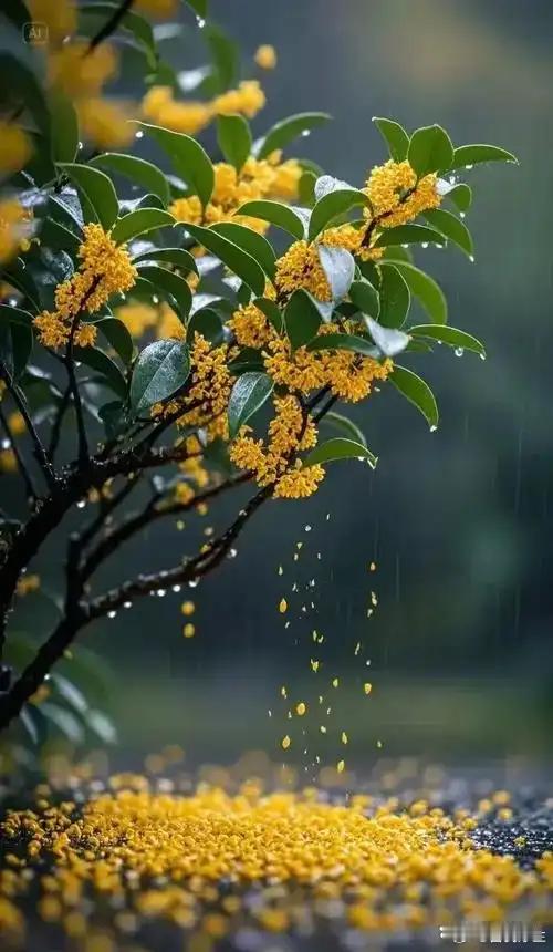 晨起推户,见青石阶上铺碎金半寸,苔痕俱染蜜色。拾袂欲扫,忽闻簌簌声自云隙坠——原是风摇千斛玉,碧云枝头漏下星芒。此等落英,合该以陶瓮收之,拌春雪腌作三秋香髓;或效唐人捣素纨,制“金粟笺”寄远。犹记乐天句“山寺月中寻桂子”,今吾檐前月,竟自携银河星雨,簌簌斟满陶潜空樽。