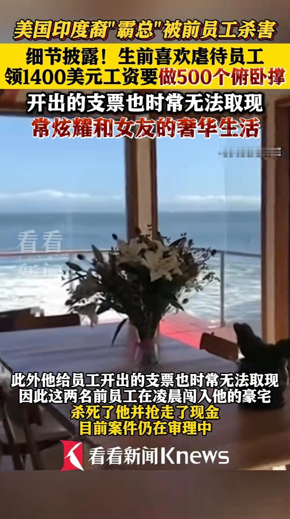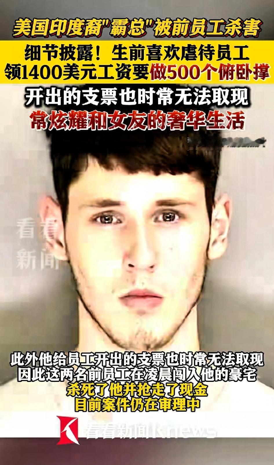 美国印度裔“霸总”被前员工杀害!细节披露!生前喜欢虐待员工,员工领1400美金要求做300-500个俯卧撑! 开出的支票也时常无法取现,常炫耀和女友的奢华生活! 喜欢羞辱公司的员工,就是不拿员工当人看。 因此这两名前员工在凌晨闯入他的豪宅,杀死了他并抢走大量现金。 这才是为富不仁不义,都是前员工了还跑过来报复他,可见这俩人对他是多么的恨之入骨。 当个老板给员工开工资也别太嚣张了。 员工领工资也是劳有所得,领工资还要被羞辱,活该被杀!有钱炫耀奢侈生活品质,给员工开出的支票无法取现。这人是有多差劲呀! 有钱的时候别太张扬,落魄的时候免得被落井下石! 现在死了都没一个为其说好话的人,名声烂大街了!看来死了也是活该!