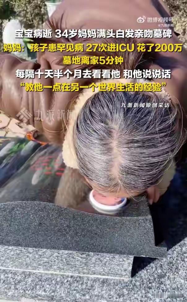 34岁的河南妈妈,一头白发俯身亲吻墓碑的样子,看哭了无数人。这个被她疼到骨子里的孩子叫橘宝,离开已经两年,可她心里的牵挂从来没断过。 橘宝出生前的产检全是绿灯,一家人满心欢喜等着迎接新生命,谁也没料到,孩子出生后没多久就突发疾病,最后确诊是罕见的线粒体脑肌病,这种病全球病例都寥寥无几。从那以后,妈妈彻底停了工作,全身心陪着橘宝四处求医,这一熬就是三年多。 三年里,橘宝总共住了41次院,27次闯ICU,打针、雾化、鼻饲管成了日常,妈妈每隔半小时就得帮他拍一次痰,一天要测十几次体温,生怕错过一丝异常。为了给孩子治病,家里花了近两百万,房子也卖了,丈夫没日没夜挣钱凑医药费,全家都在为留住这个小生命拼尽全力。 最煎熬的是2022年,橘宝几次徘徊在生死边缘,妈妈说那段时间总觉得孩子要从手里溜走,头发就是那时候一夜变白的,整个人也瘦得没了模样。可就算再难,她也把病房布置得暖乎乎的,天天变着法逗橘宝笑,一本本病历本都写满了对孩子的期盼。 遗憾的是,奇迹没能一直延续,2023年橘宝还是离开了。妈妈把他葬在离家5分钟的地方,说就当孩子搬去了新家。这两年,她每隔十天半个月就会去看看,带上孩子爱吃的小蛋糕、喜欢的玩具,跟他说说家里的琐事。 面对镜头,她忍不住反复问“付出了这么多,为什么还是不行”,可转头又坚定地说,会带着对橘宝的爱好好生活。有人说产检没能查出罕见病是遗憾,也有人说生命无常难违天意,但这份拼尽全力的母爱,真的让人忍不住心疼又动容。 希望这位妈妈能慢慢走出悲痛,往后的日子多些顺遂。
