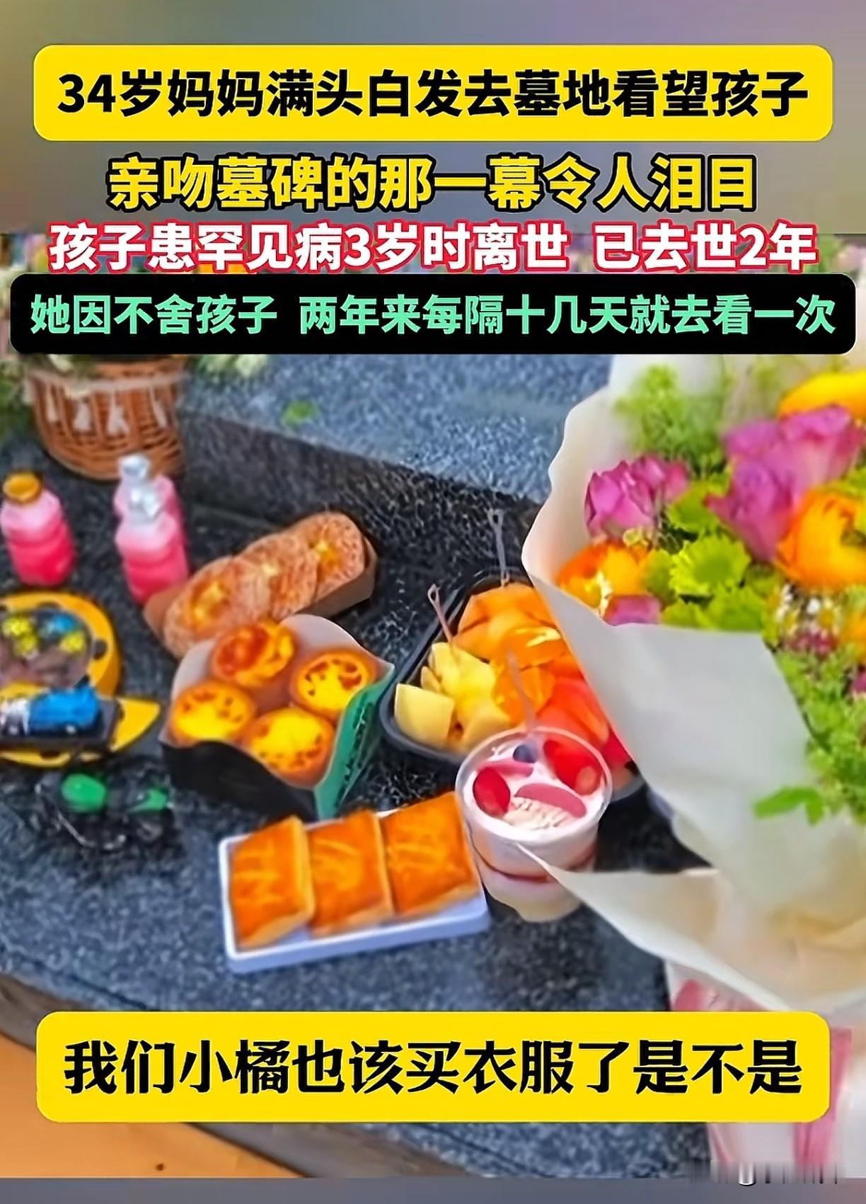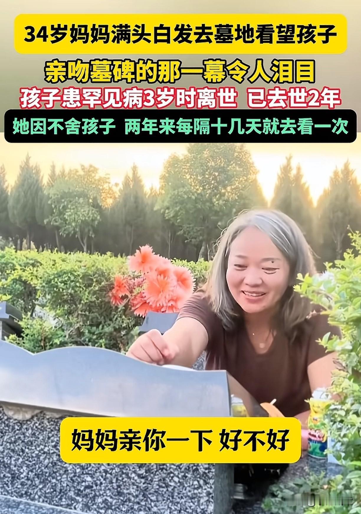 “一夜白头” 近日,河南洛阳一位34岁的妈妈因为孩子去世一夜白头。两年前,她3岁的儿子突然被检查出来患有罕见的病症,尽管经过多方努力,却还是没能挽救他的生命。 作为孩子的母亲,在这一刻似乎心都碎了。 有知情者透露,这两年来,孩子的妈妈每隔十几天就会去墓地去看看孩子,这段时间以来,她一定过得非常的苦吧,因为一个人年纪轻轻的突然间头发全白了,受到的打击可想而知,那是她的心头肉。 这位妈妈虽然头发全白了,不过可以看到她面容姣好,长的非常好看,每次到墓地她都会母鸡挤出灿烂的微笑和孩子说说话,或者自言自语,并且摆上了各种各样的好吃的东西。 天气冷了,她甚至还要带一些宝宝穿的衣服和被子,这一幕看的是让人泪目呀,可怜天下父母亲,一般人还真就无法理解这种心情,可能只有真正当了父母之后,才能体会到这种刻骨铭心。
