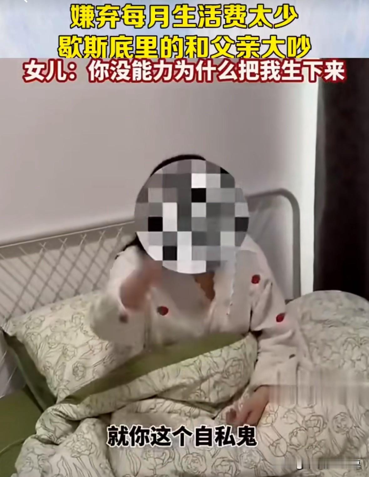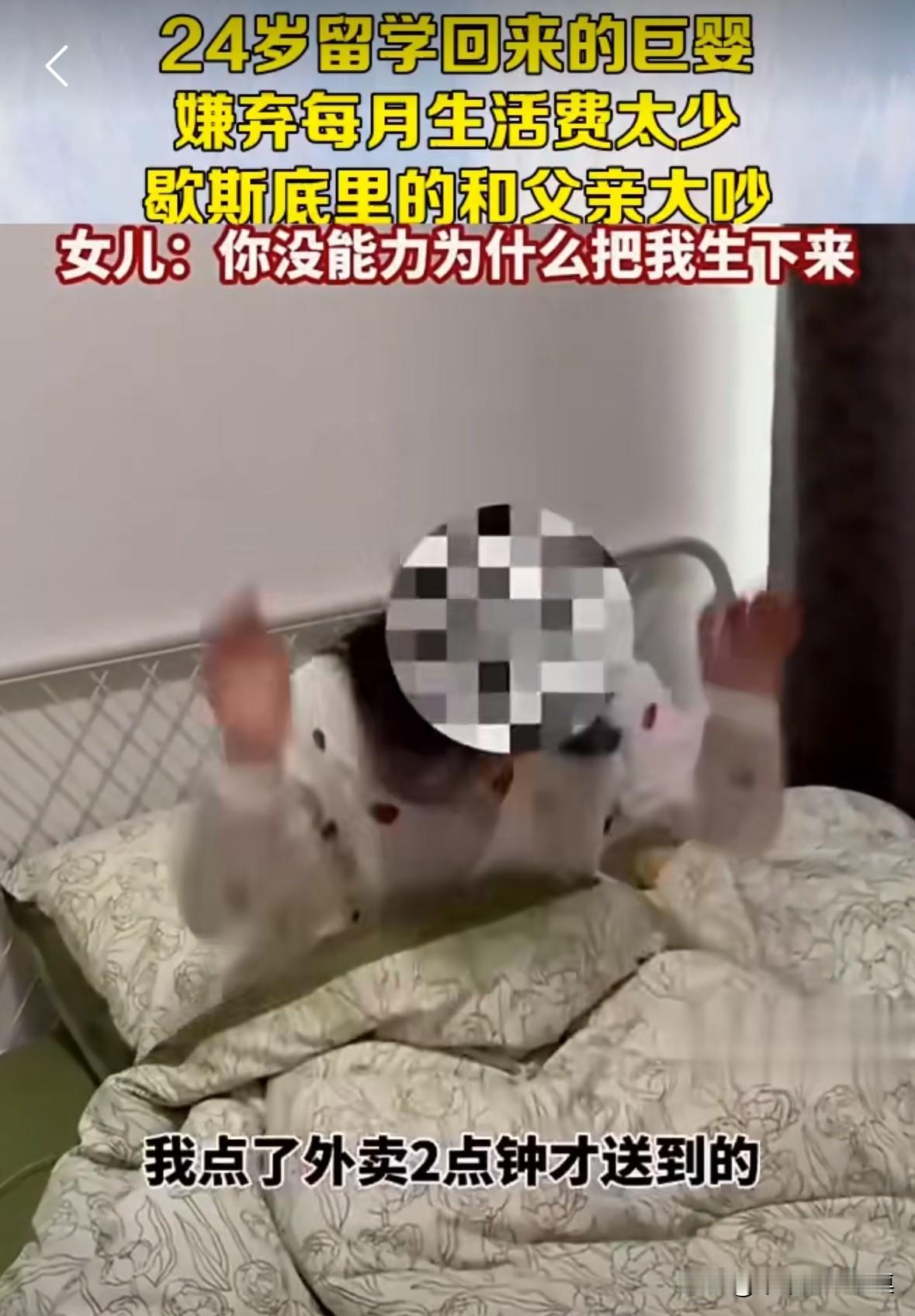 24岁女生留学回家,不找工作,天天玩手机睡觉,还嫌弃父亲每个月给的生活费太少! 这天女生睡到中午十二点,父亲就没有叫她吃饭。 于是她睡醒后跟父亲大闹说:“你就是个自私鬼,你自己吃了饭不给我留一口,我现在点了外卖,两点钟才能送到!” 事后女生还埋怨父亲说:“你没有能力为什么还要把我生下来!” 这种孩子就让她自生自灭吧,不会孝顺你的,不想着自力更生,天天在家啃老,惯出来的臭毛病。 现在我还是坚信棍棒底下出孝子。女生留学生