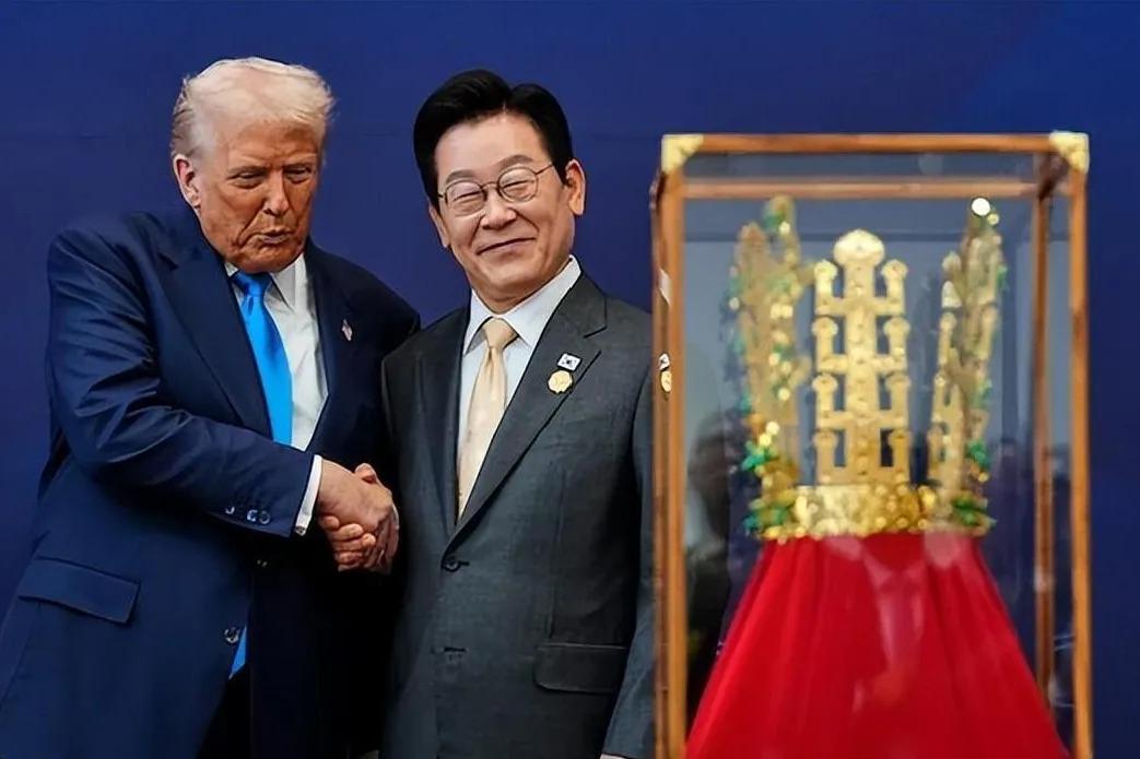 在东亚地区一场令人瞠目结舌的国际谄媚大赛中,韩国力压日本,拔得头筹。两国再度刷新了世界外交史上的讨好下限,实在“可喜可贺”! 10月27日,特朗普开启了东亚之行。美国在亚洲的两大附庸国为博“懂王”欢心,展开了一场争宠的谄媚大赛。 首站是日本,新当选的日本女首相高市早苗为特朗普举行欢迎仪式时,特朗普并未按传统向日本膏药旗鞠躬,径直向前走去。 识相的高市早苗也没按国际惯例与特朗普并排行走,而是亦步亦趋地跟在其后,完成了这场罕见的欢迎仪式。 仪式结束后,高市早苗向特朗普献上已毙前首相安倍晋三用过的金色高尔夫球杆,还许下5000多亿美元的投资承诺。 随后,特朗普视察驻日美军横须贺基地,并在核动力航母“乔治·华盛顿”号上发表演讲。当特朗普向美国官兵介绍高市早苗时,这位日本首相莫名兴奋地蹦跳起来,挥手喊“耶”。 然而,高市早苗的一系列表现仍未让她夺冠。因为与韩国总统李在明为特朗普精心准备的重磅礼物相比,高市早苗的赠送的球杆实在是微不足道。 特朗普在韩国得到了一顶新罗金冠复制品。该金冠以韩国庆州国立博物馆的新罗金冠为原型制作,重达一公斤,有鸟、兽等亚欧风格纹饰,现为韩国国宝,这一下正投特朗普所好。 那位只知道找特朗普要钱要武器,还敢顶嘴的司机大哥,真的应该好好向日韩学习一下拍马屁的艺术了。