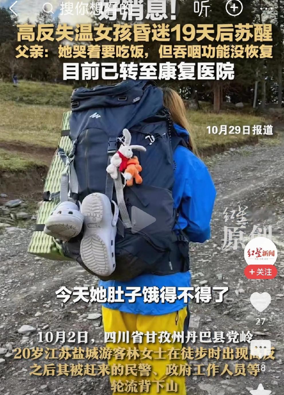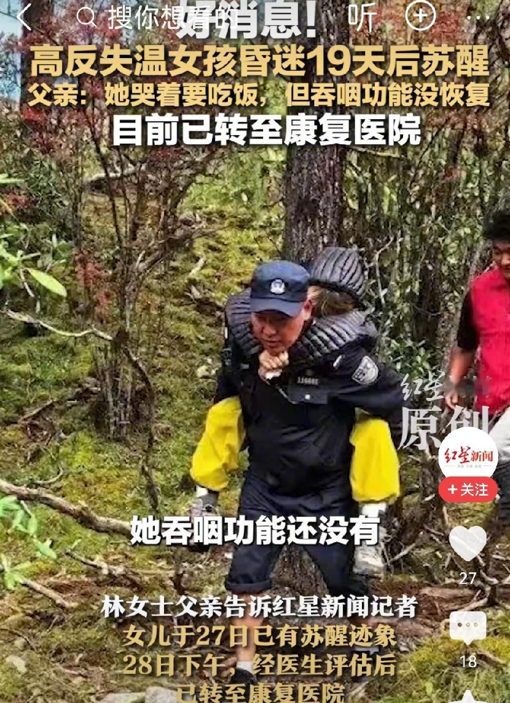 这是爱创造的生命奇迹[比心][比心] 10月2日,四川省甘孜州丹巴县党岭,20岁江苏盐城游客林女士在徒步时出现高反。 当时,情况不好,前来救援的民警、政府工作人员轮流背她下山。 之后,转入四川华西医院救治。27日,女孩已经苏醒。 目前,吞咽功能没有恢复,之前诊断有可能成为植物人。 这个女孩真的很幸运,一路遇到的全是好人: 轮流背她下山的当地村民和民警; 第一时间把她送到华西的好心人; 华西医院所有救治的医护人员的接力守护 昏迷19天醒来,这是生命创造的奇迹,也是帮助她的所有好心人的爱的力量与温暖。 希望,女孩早日康复!大难不死必有后福! 女孩要好好感谢这些救命恩人[祈祷][祈祷] 四川高反女孩