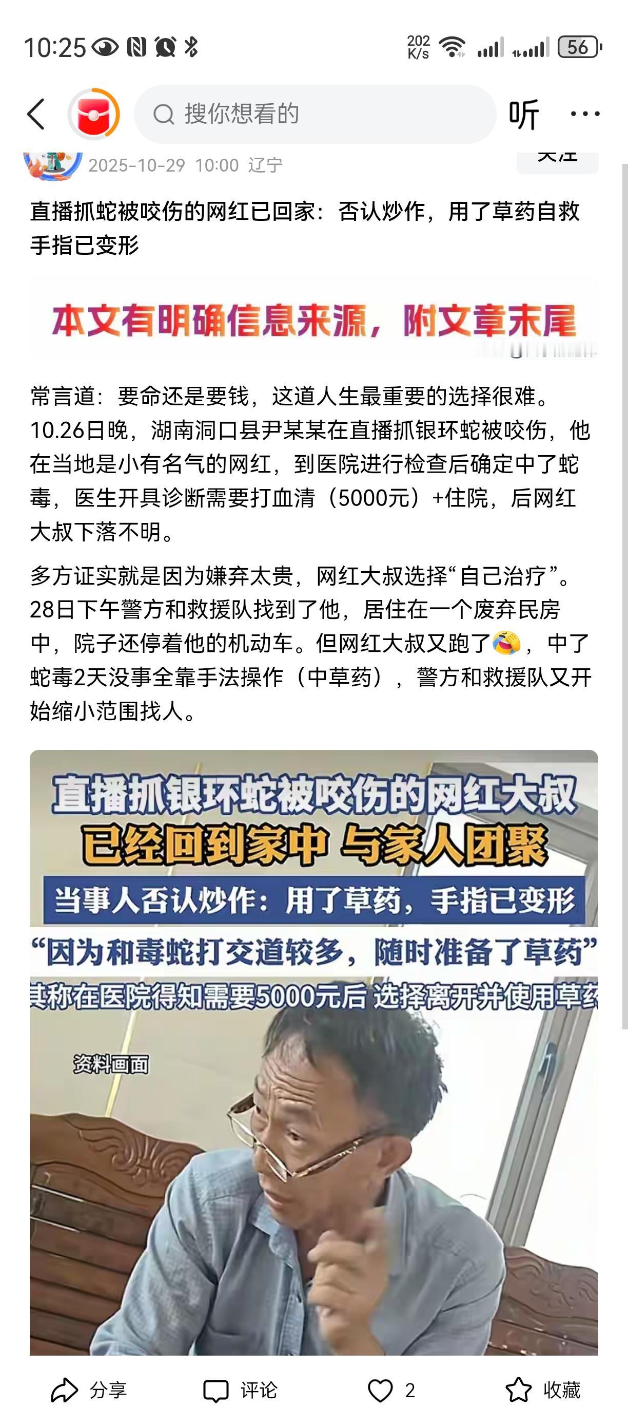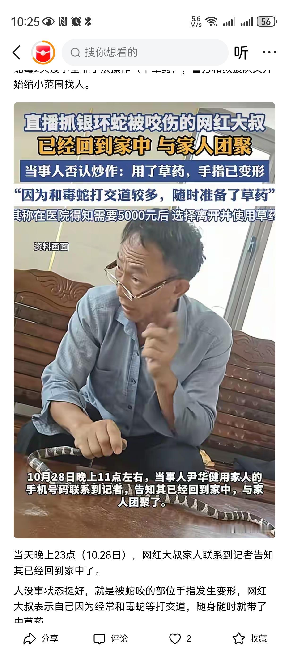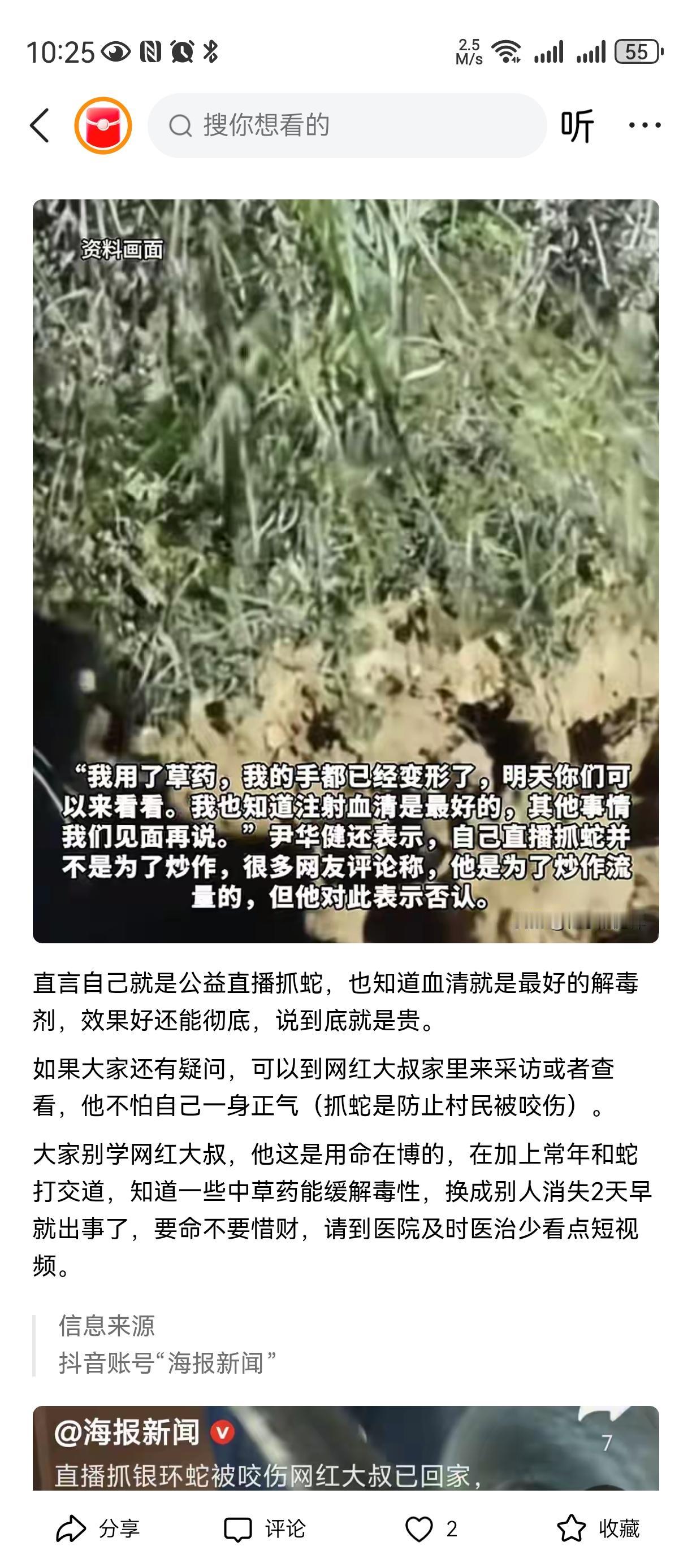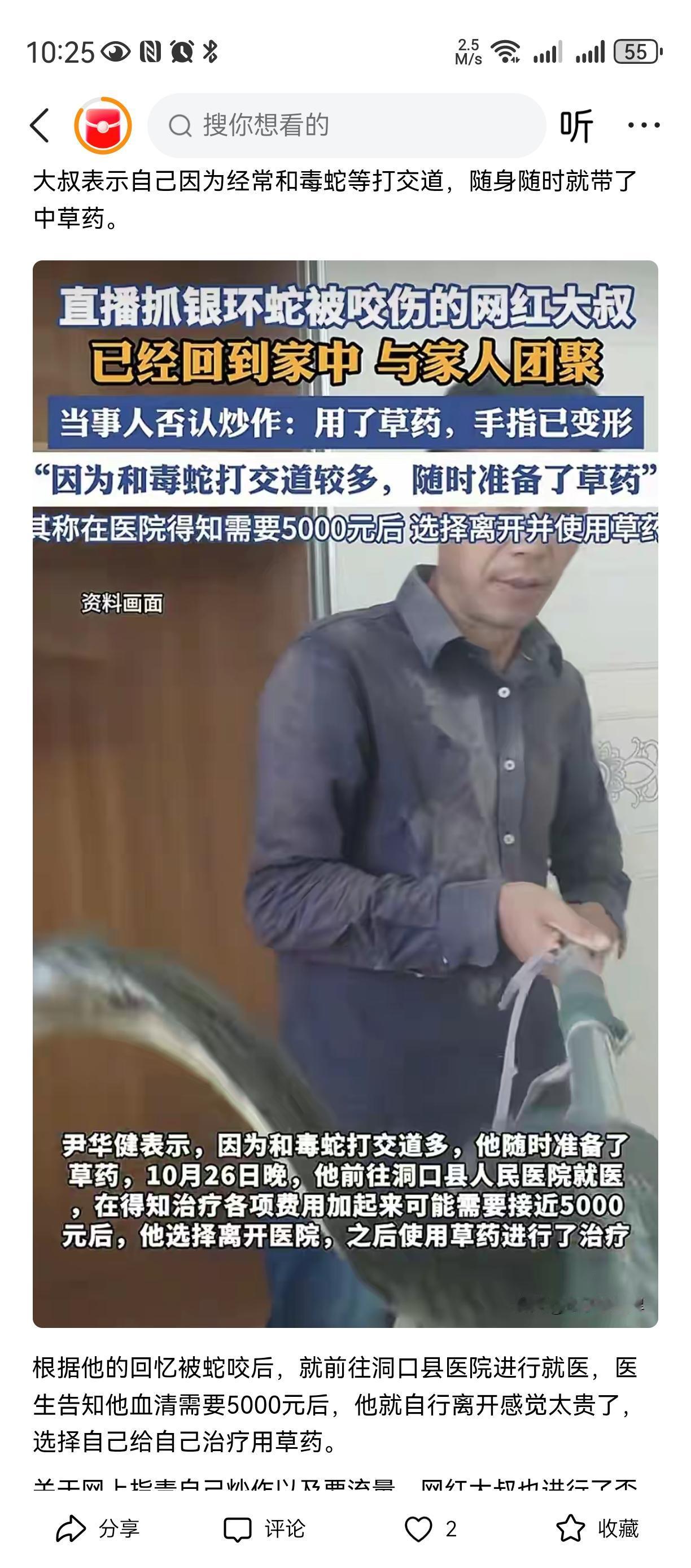 蛇咬网红发财啦[鼓掌][鼓掌][鼓掌] 蛇草药🌿可以大涨, 被蛇咬网红发财啦。 会不会有很多人找他去开发这个治疗蛇毒的草药?蛇咬紧急处理 驱蛇药