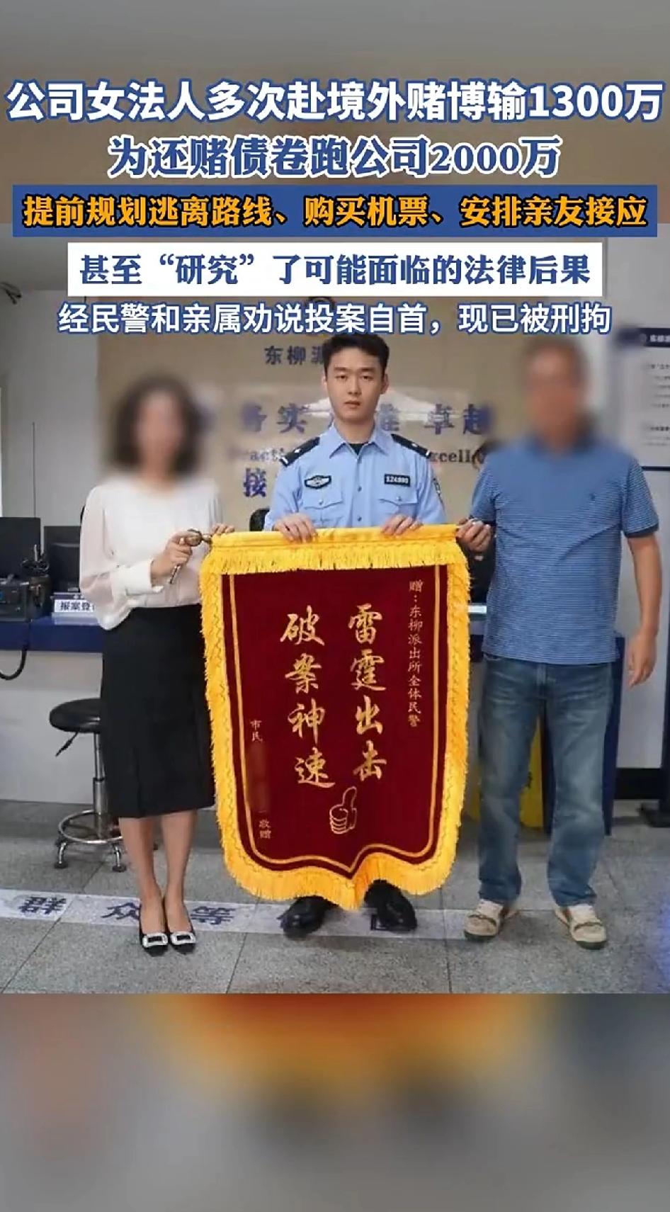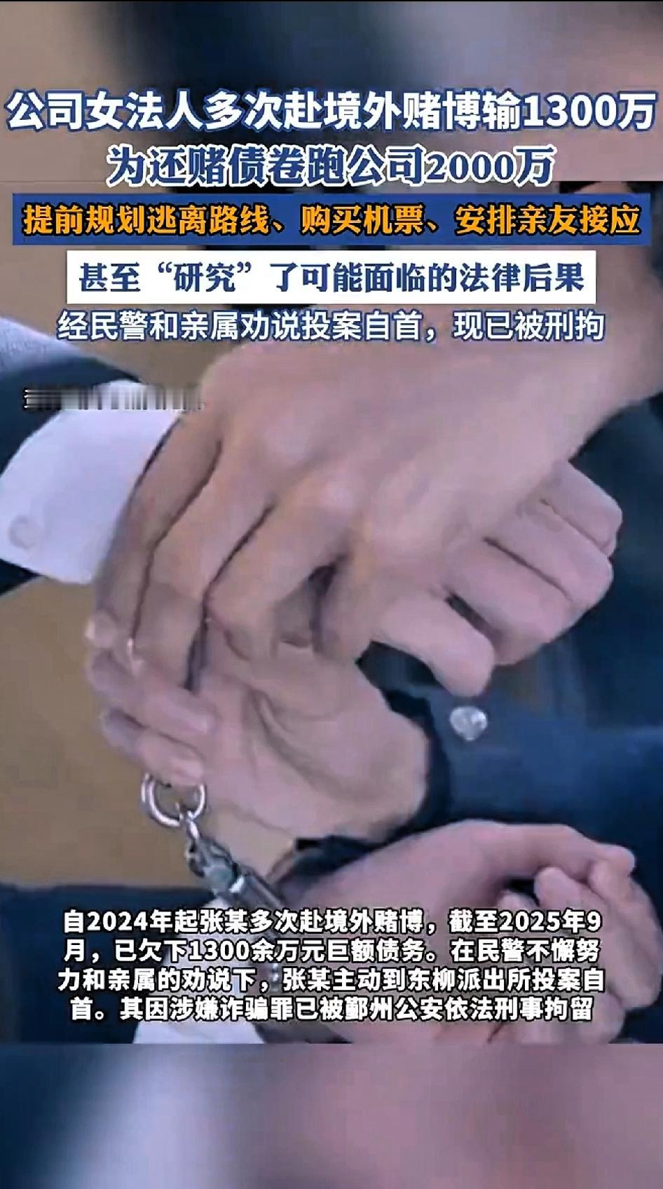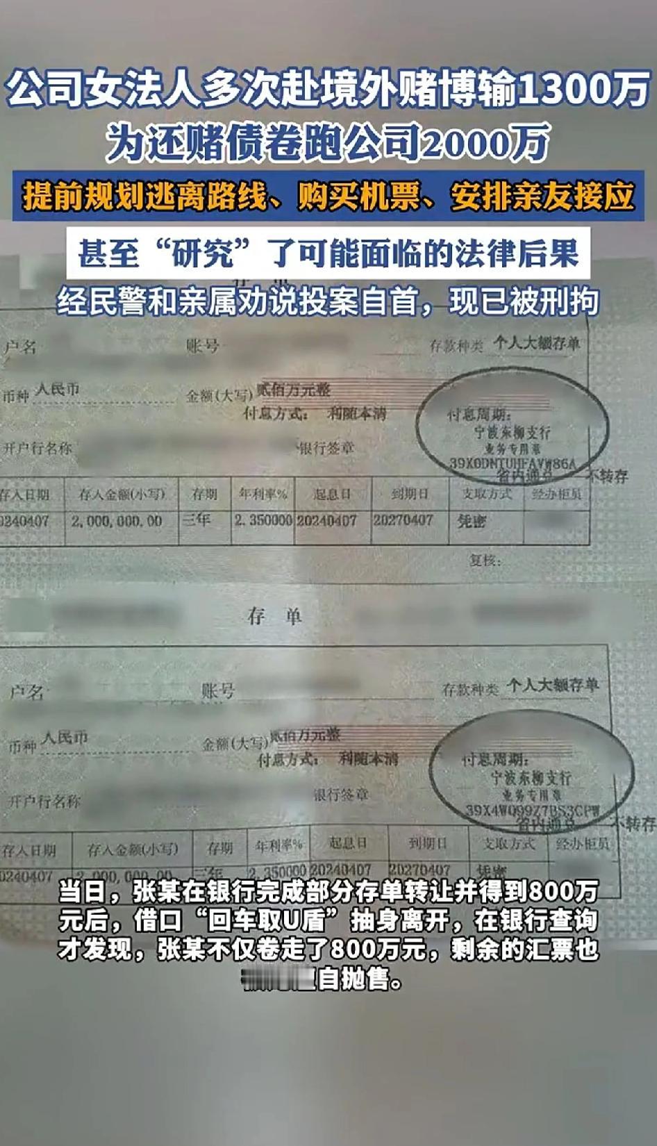 公司女法人多次赴境外赌博输1300万 为还赌债卷公司2000万,不得不说这女法人真是胆大包天。 事情就发生在浙江宁波鄞州,公司变更法人,按约定她转让存单后要把钱返还公司。 可她拿到800万后就借口离开,还抛售了剩余汇票,直接失联。民警反应迅速,马上进行账户封控。 原来她早就买好机票打算跑路,还精心规划了逃离路线、安排亲友接应。不过,她再怎么算计,还是没逃过警方的“快准狠”,最后时刻害怕得逃回家。 在警察和家人的劝说下张某主动到东柳派出所投案自首。 现实生活里女人牌瘾大的见过几个,刮风下雨,外面下刀子也挡不住打麻将的心。 邻居家亲戚赌的也很大,一晚上一套房赌出去,上百万的赌资,输了就输了!l 经常半夜打电话哭着借钱。 赌博害人不浅,这女法人的行为也给大家敲响了警钟。
