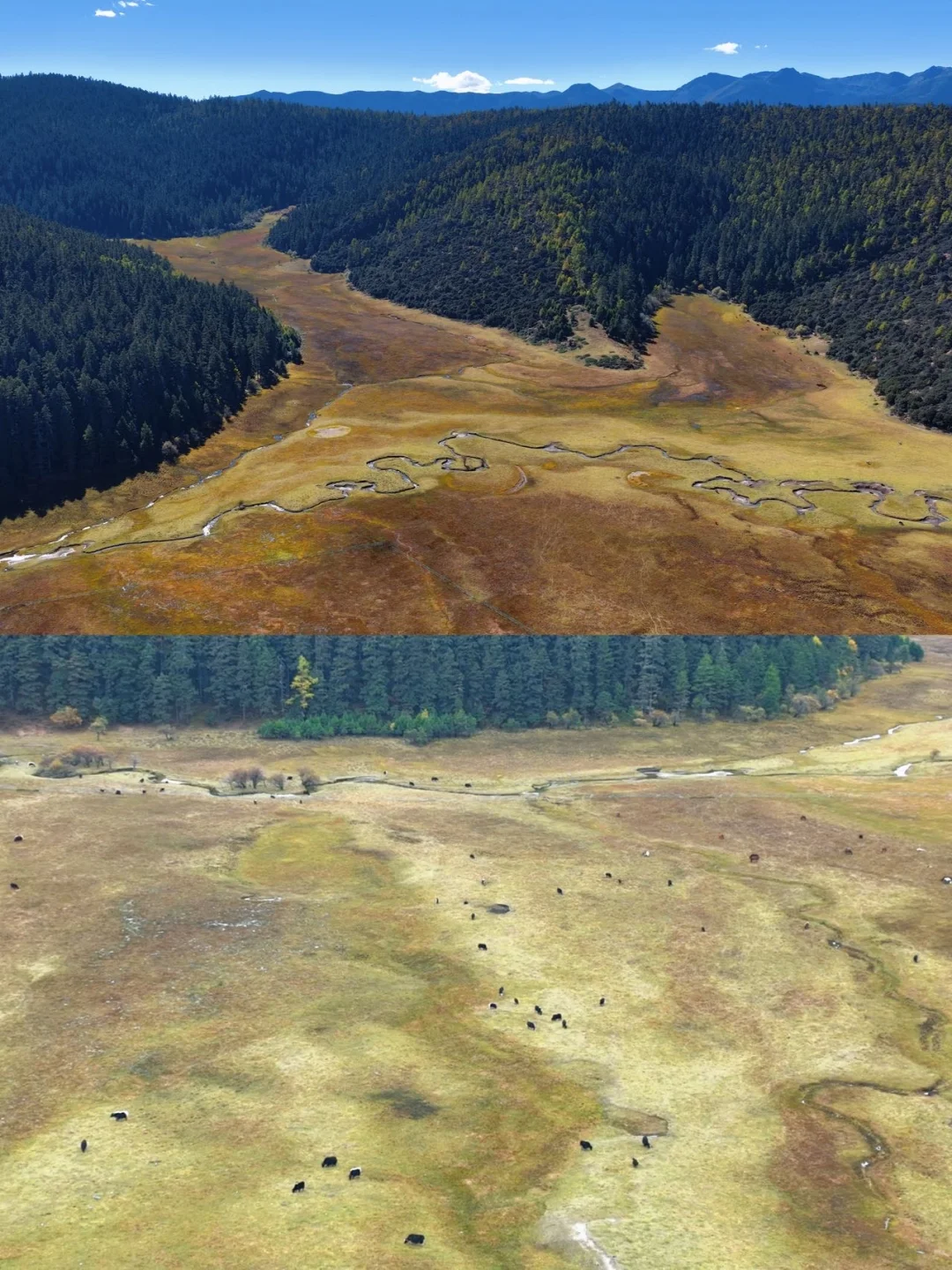 谁懂啊!香格里拉国家公园候选区的秋日生命力直接美到失语!森林、湖泊、冰川等垂直生态交织。清晨属都湖薄雾流转,远山映水。冰川融水成湖育湿地、养林木,参与生态循环,湖畔漫步,可见纯净湖水映云卷云舒,尽显生态之美。