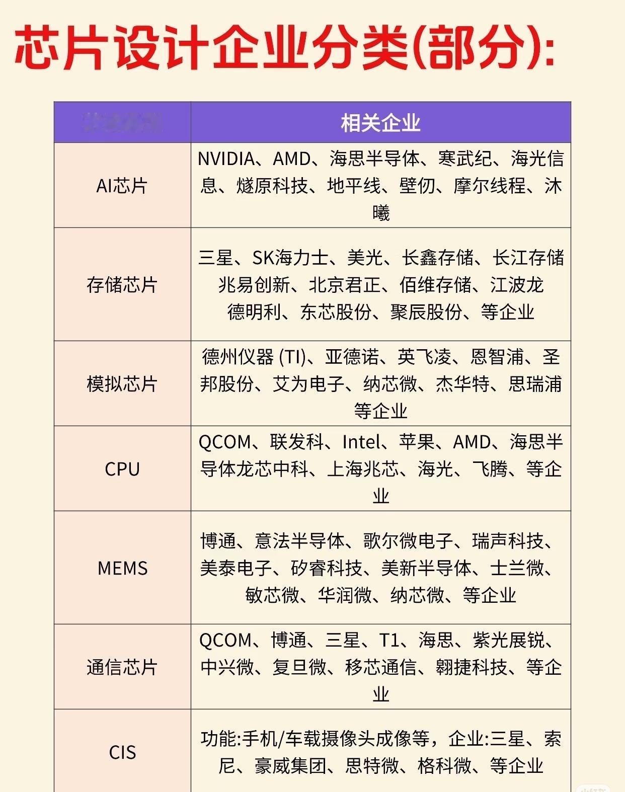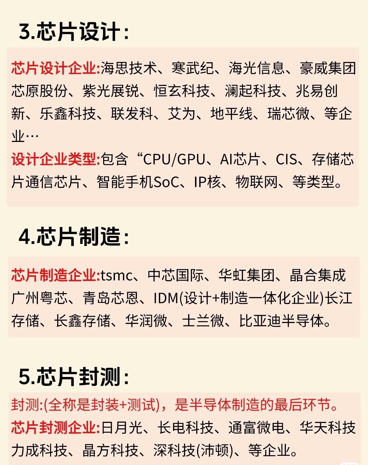 科创芯片产业的五大赛道及相关重点企业,内容涵盖芯片设备、材料、设计、制造和封测等关键环节,具体如下: 一、芯片设备赛道 该赛道为芯片制造、测试、封装等环节提供专用设备、工具及服务,是芯片产业链的基础支撑。代表企业包括:上海微电子、中微公司、北方华创、拓荆科技、芯源微、盛美上海、华海清科、长川科技等。 二、芯片材料赛道 半导体材料分为晶圆制造(前道)和封装(后道)两大类,是芯片生产不可或缺的基础材料。相关企业有:沪硅产业、南大光电、彤程新材、华特气体、清溢光电、安集科技、上海合晶、上海新阳、鼎龙股份、江丰电子、晶瑞电材、天岳先进等。 三、芯片设计赛道 芯片设计是产业链的创新核心,涵盖多种类型芯片的研发,企业类型包括CPU/GPU、AI芯片、CIS(图像传感器)、存储芯片、通信芯片、智能手机SoC、IP核、物联网芯片等。代表性企业有:海思技术、寒武纪、海光信息、豪威集团、芯原股份、紫光展锐、恒玄科技、澜起科技、兆易创新、乐鑫科技、联发科、艾为、地平线、瑞芯微等。 图片中还专门针对芯片设计企业进行了分类展示,涉及多种芯片类型及其对应的主要设计企业,例如: - AI芯片:海思半导体、寒武纪、海光信息、燧原科技、地平线、壁仞、摩尔线程、沐曦等; - 存储芯片:三星、SK海力士、美光、长江存储、长鑫存储、兆易创新、北京君正、佰维存储、江波龙、德明利、东芯股份、聚辰股份等; - 模拟芯片:德州仪器(TI)、亚德诺、英飞凌、恩智浦、圣邦股份、艾为电子、纳芯微、杰华特、思瑞浦等; - CPU:Intel、苹果、AMD、联发科、海思半导体、龙芯中科、上海兆芯、海光、飞腾等; - MEMS(微机电系统):博通、意法半导体、歌尔微电子、瑞声科技、美泰电子、矽睿科技、美新半导体、士兰微、敏芯微、华润微、纳芯微等; - 通信芯片:高通(QCOM)、博通、三星、海思、紫光展锐、中兴微、复旦微、移芯通信、翱捷科技等; - CIS(图像传感器,用于手机/车载摄像头成像):三星、索尼、豪威集团、思特微、格科微等。 四、芯片制造赛道 芯片制造是将设计转化为实际芯片的核心环节,包括IDM(设计+制造一体化)模式和代工模式。主要企业有:台积电(TSMC)、中芯国际、华虹集团、晶合集成、广州粤芯、青岛芯恩,以及IDM模式的长江存储、长鑫存储、华润微、士兰微、比亚迪半导体等。 五、芯片封测赛道 封测是半导体制造的最后环节,主要包括封装和测试两个部分,对保障芯片性能和可靠性至关重要。代表企业有:日月光、长电科技、通富微电、华天科技、力成科技、晶方科技、深科技(沛顿)等。 总结:这五大赛道共同构成了完整的科创芯片产业链——从上游的设备与材料供应,到中游的设计与制造,再到下游的封装测试,每个环节都有一批具有代表性的国内或国际领先企业参与,共同推动着芯片产业的发展。