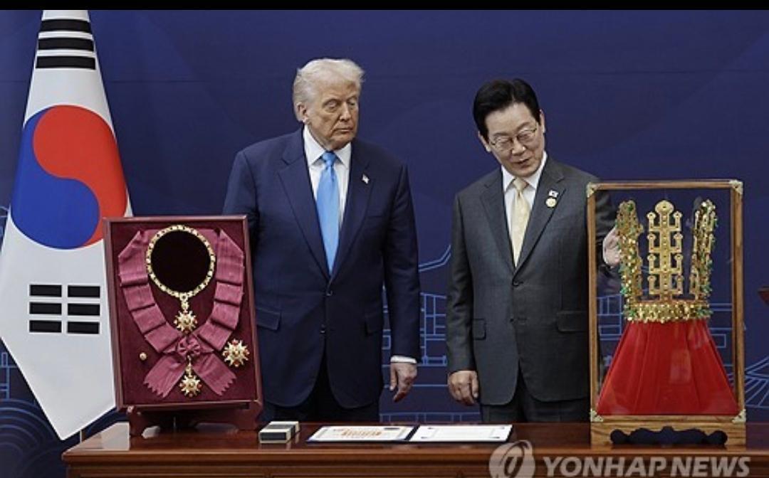 韩国给特朗普戴金冠了。 不是演戏,是真戴。 一顶仿了1500年前王冠的镀金玩意儿,重一公斤多,送给了一个还没回白宫、但已在共和党内称王的人。 这不是送礼,是下注。 不管他明年回不回白宫,韩国先把礼送上了。 奥巴马拜登也拿过这勋章,可没谁像他这样——没在任,却被当成“在任级”来敬。 金冠是新罗的,不是特朗普的。 可韩国人说:你当年在新加坡让金正恩点头,这功劳,我们记下了。 美国媒体说他影响力还在,日本刚送过旭日章,韩国又递上王冠。 东亚的礼,不送当政者,送掌权的人。 这不是夸他。 这是怕他回来,记仇。 礼轻情意重? 不,礼重,怕你忘了我们曾弯过腰。