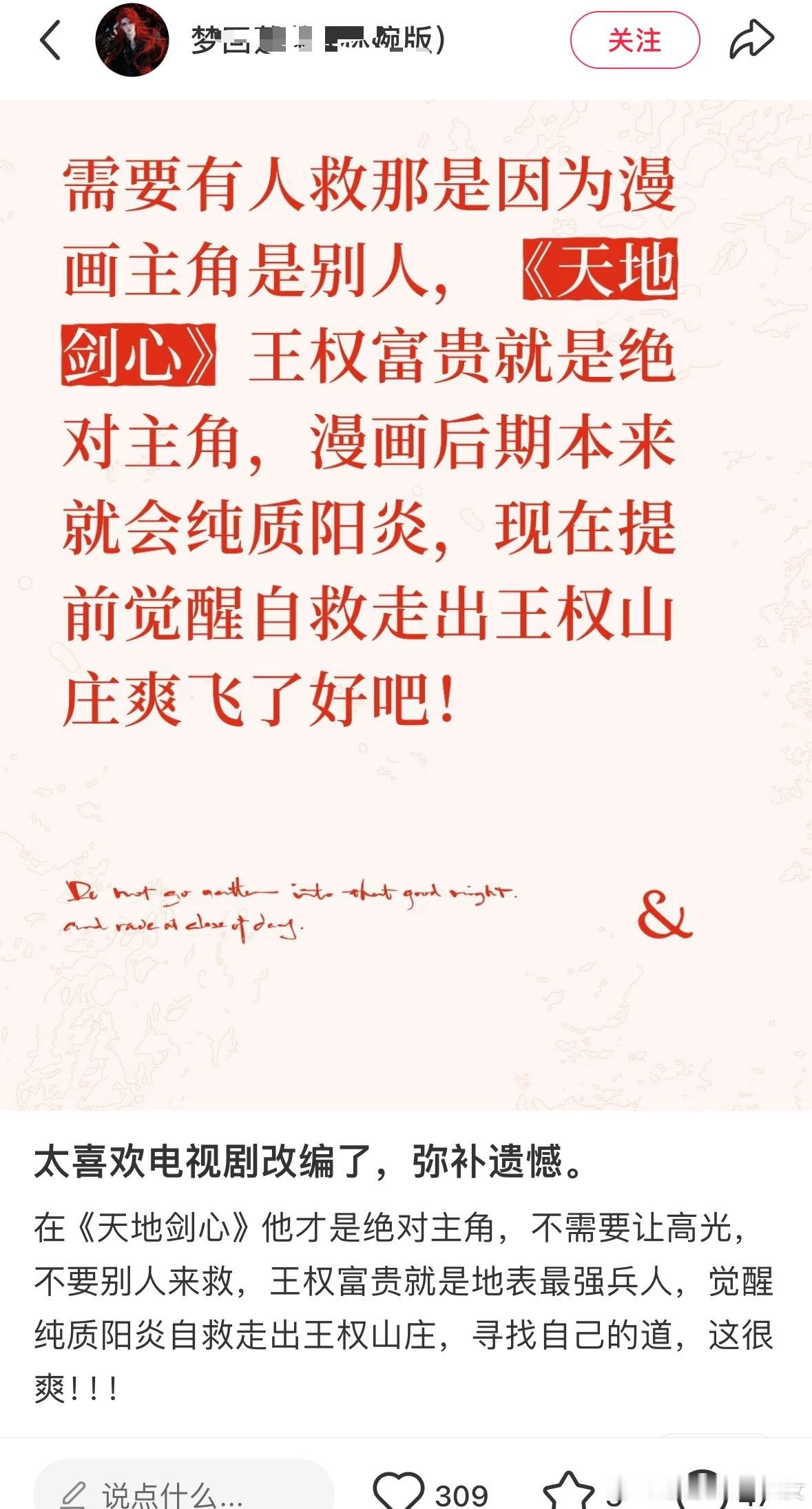 天地剑心仙改很多观众都在夸天地剑心,剧情爽爆了,弥补了很多遗憾。成毅的王权富贵不仅保住了人物内核还全面提升了立意格局,收获了很多观众的夸赞,收获了很多破圈层的认可