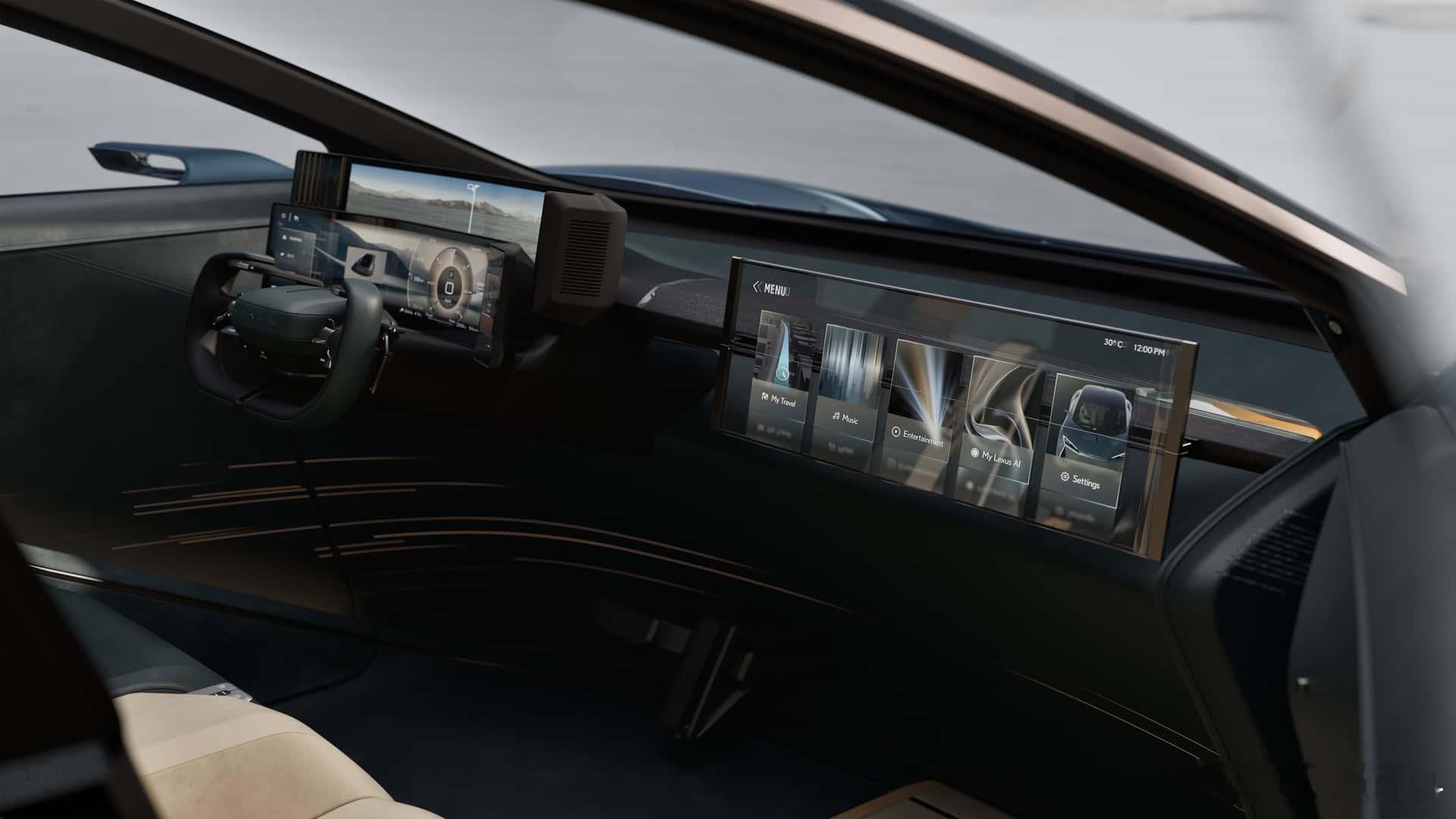 内饰采用了双层重叠式液晶仪表盘,轭式方向盘也是丰田系概念车最爱;副驾一侧不仅有撞色处理,还在悬浮横梁内设计了伸缩大屏,科技感十足