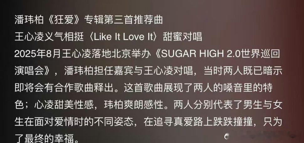 潘玮柏王心凌合作 虽然专辑已经上线,但这首合作曲还要再等等,官方表示要给大家完美的视听感受,这让粉丝更加好奇,难道会有精心制作的MV同步推出?