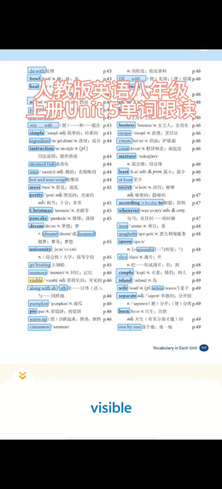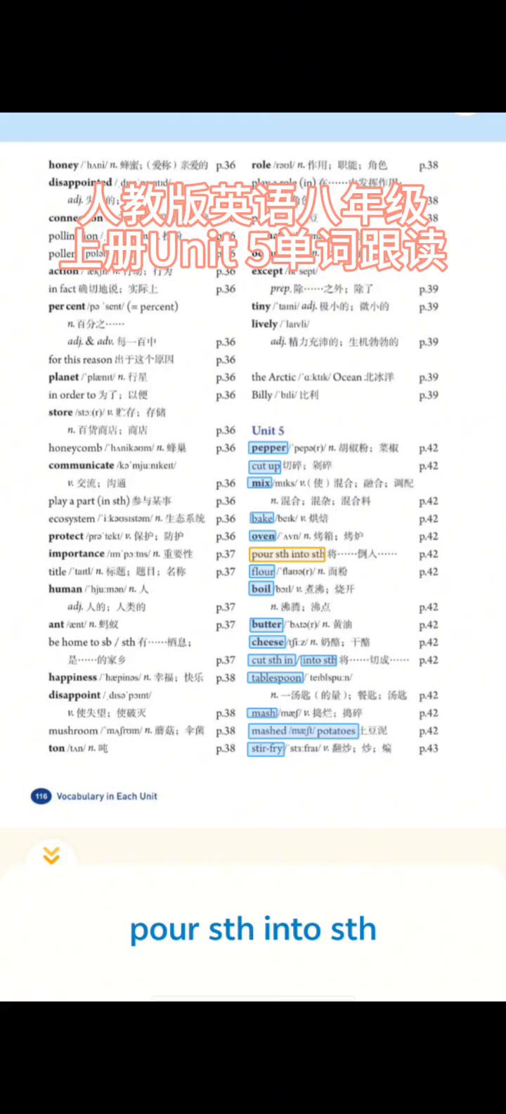 人教版英语八年级上册Unit5单词跟读。 人教版英语八年级上册Unit5单词跟读。 ·cut up,mix,bake,oven,pour something,into something,flour,boil,butter,cheese,cut something,in something,cut something,into something,tablespoon,mash,mashed potatoes,stir fry,do with bowl,heat,oil,pan,put something,back,mix with,simple,ingredient,instruction,steamed fish,sour,hot and sour soup,mess,pretty,christmas,pancake,dream,dreamt,dreamed,university,go boating,memory,visible,along with somebody,along with something,pumpkin,pi,warm up,cinnamon,fill with,sweetness,college,host,hostess,recipe,cream,crust,mixture,least,at least,secret,according to,whenever,item,spaghetti,spoon,spoonful,slice,couple,island,wife,wives,separate,born,one,by one,thanksgiving,goha chow,rice noodles。