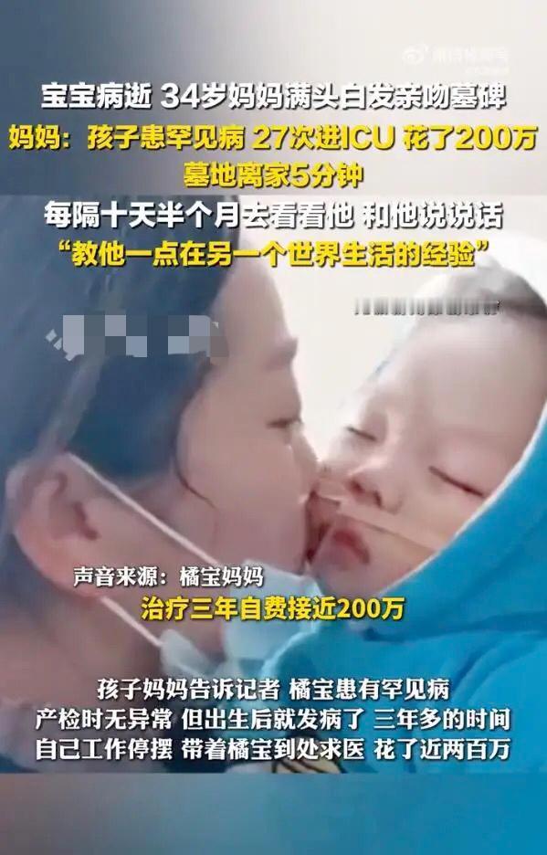 有时候看到这种新闻, 我就觉得也许不生孩子也不是不能接受, 孩子对一个母亲来说意味什么呢? 是骨头是血是活着的意义, 也许在有孩子之前她是个坚强乐观也从未想过会有什么事能让自己觉得活着不再有意义, 就像这位妈妈, 她29岁那年3岁的孩子因为罕见病走了, 她一头青丝变白发, 几年过去放不下孩子到墓前亲吻墓碑, 跟他说话, 像教他一些在另一个世界生活的经验……