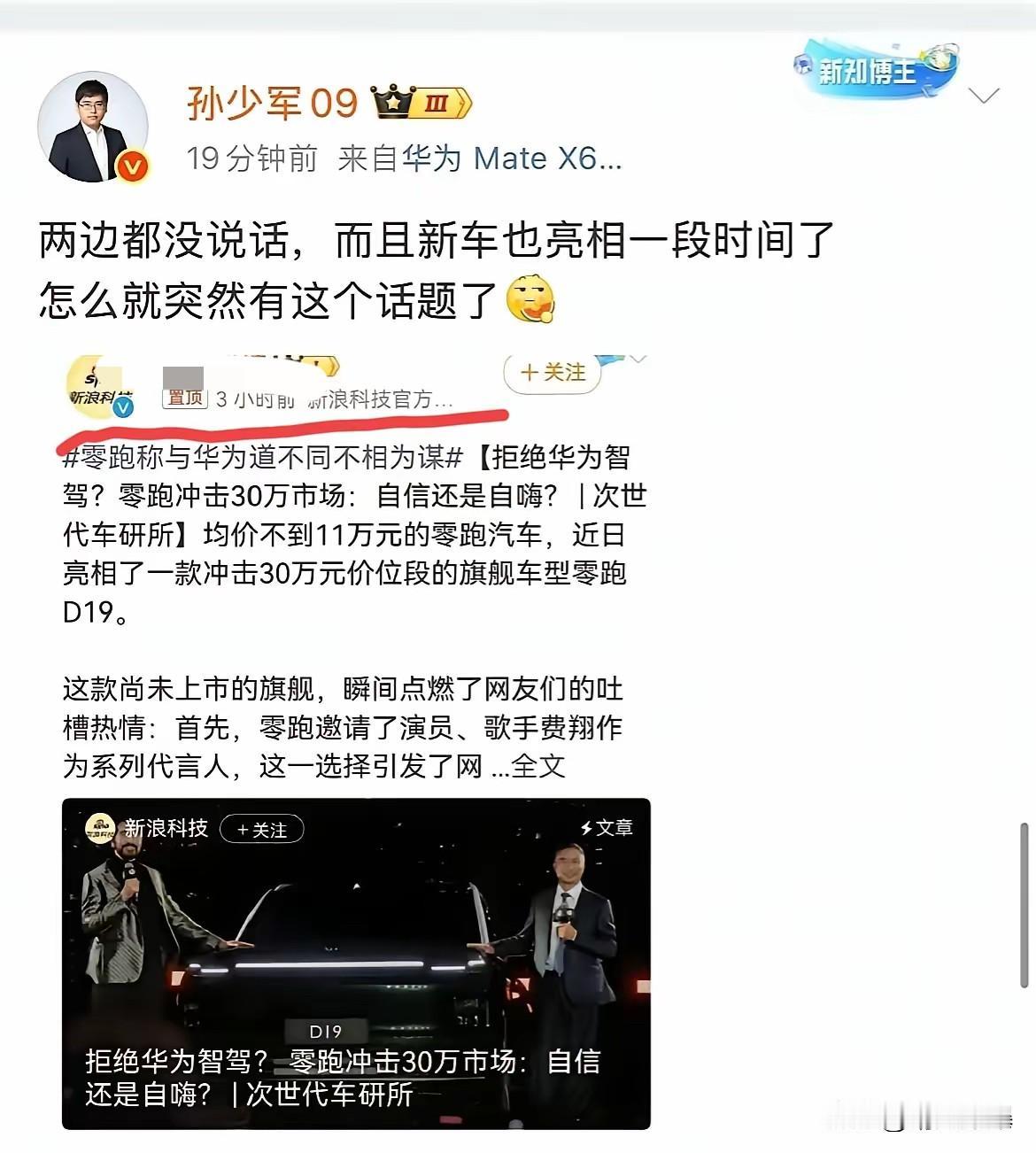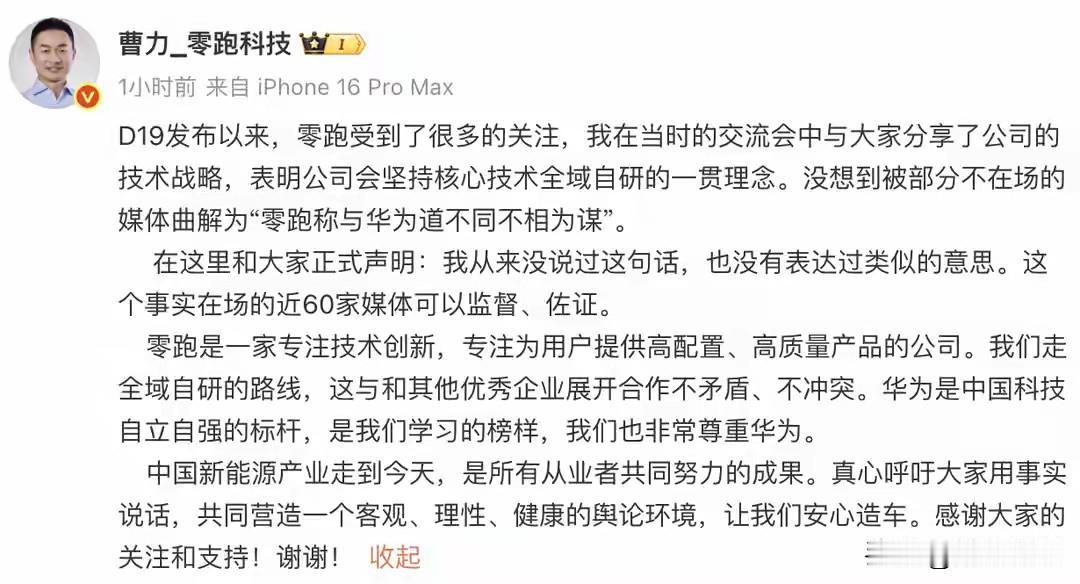 零跑的D19坚持不用华为智驾, 而且零跑与华为道不同不相为谋, 真想知道到底是谁给了零跑这么大的诋毁? 现在零跑的曹力都出来辟谣了,自己从来没有说过这种话,也没有表达过相关意思,零跑是一直很尊重华为的! 而且很多自媒体大账号都在跟风传播不实消息,真的是有失水准!